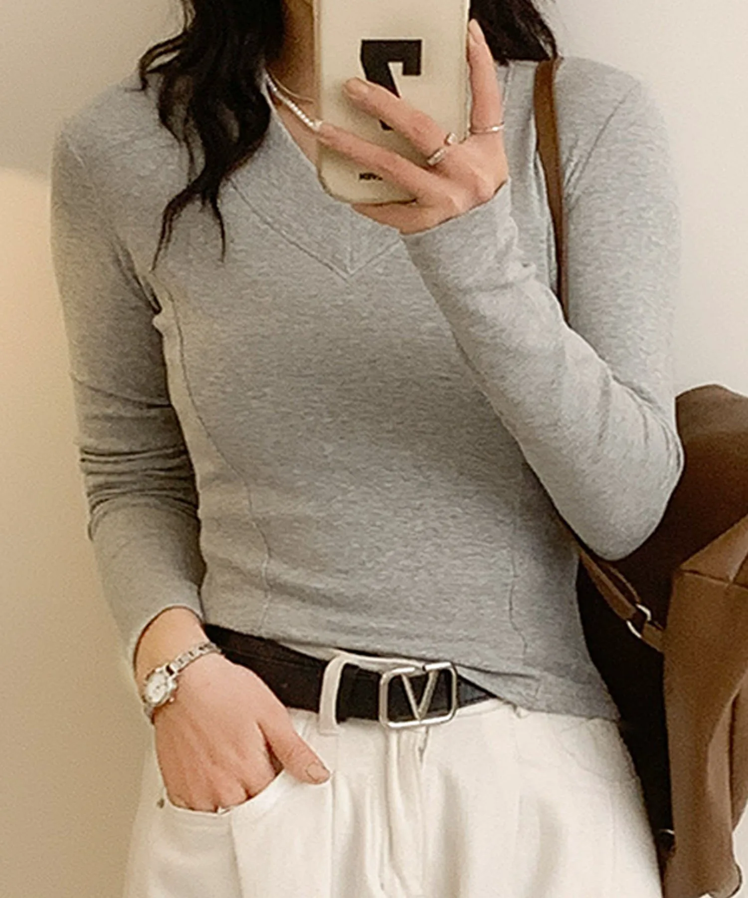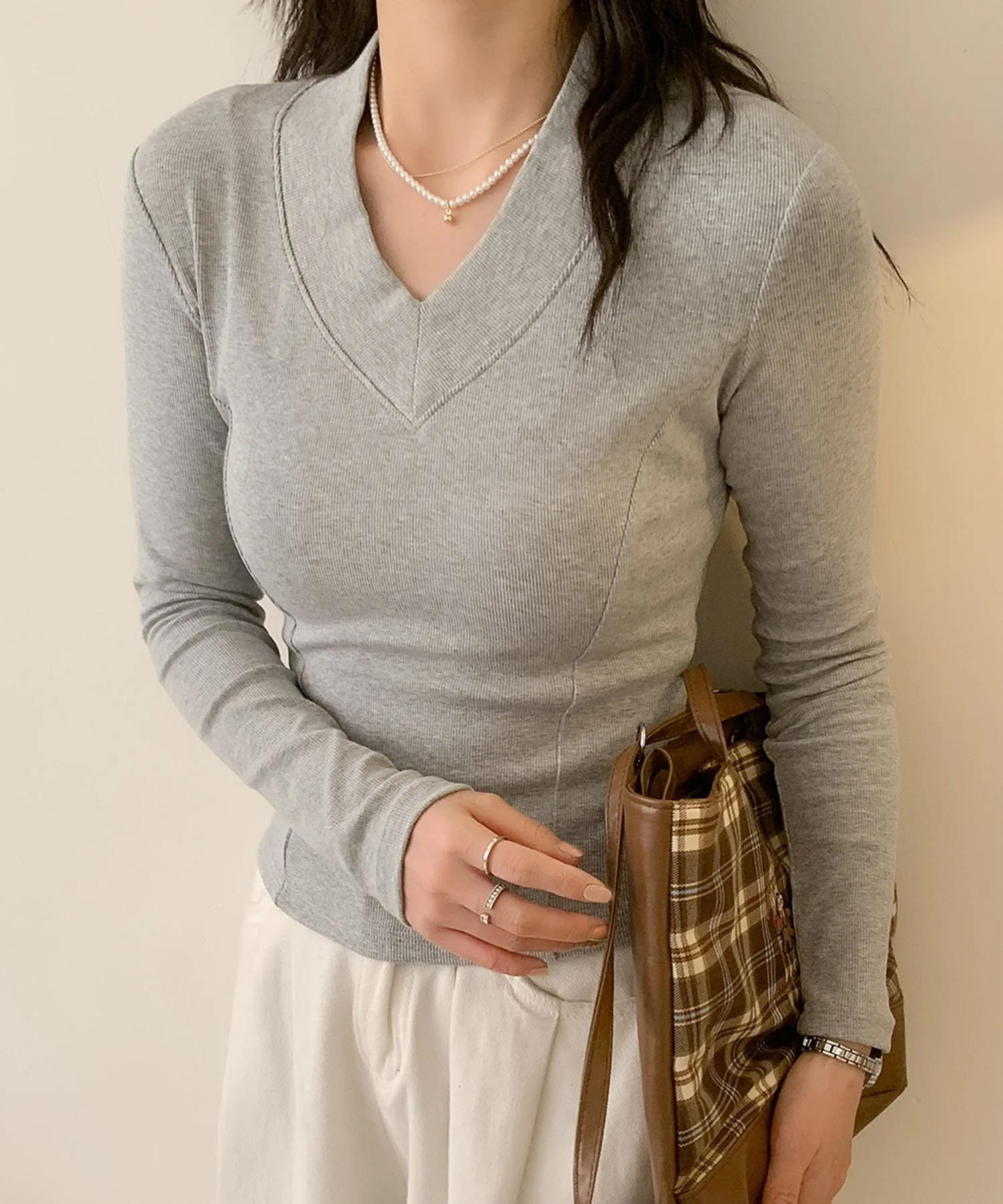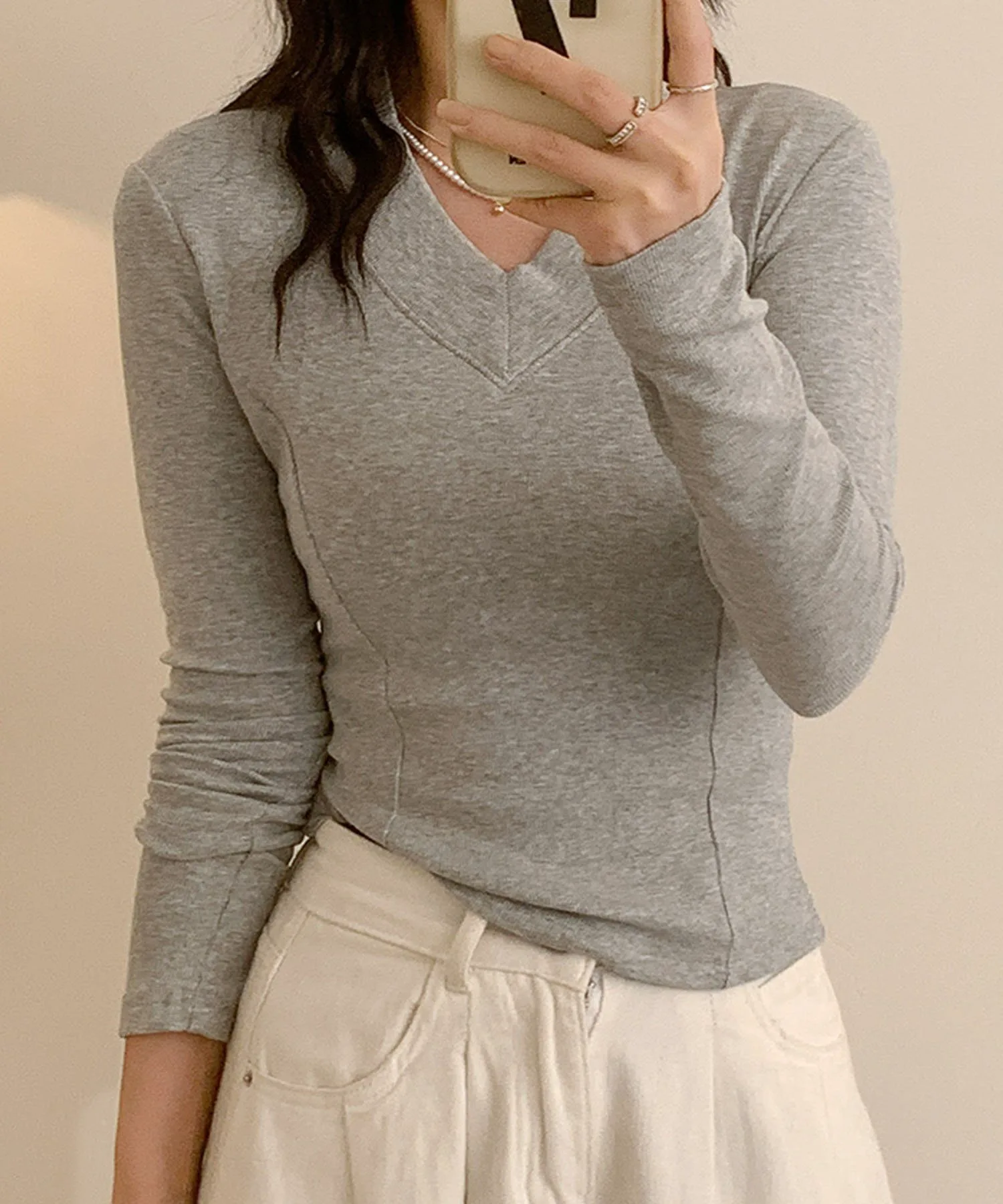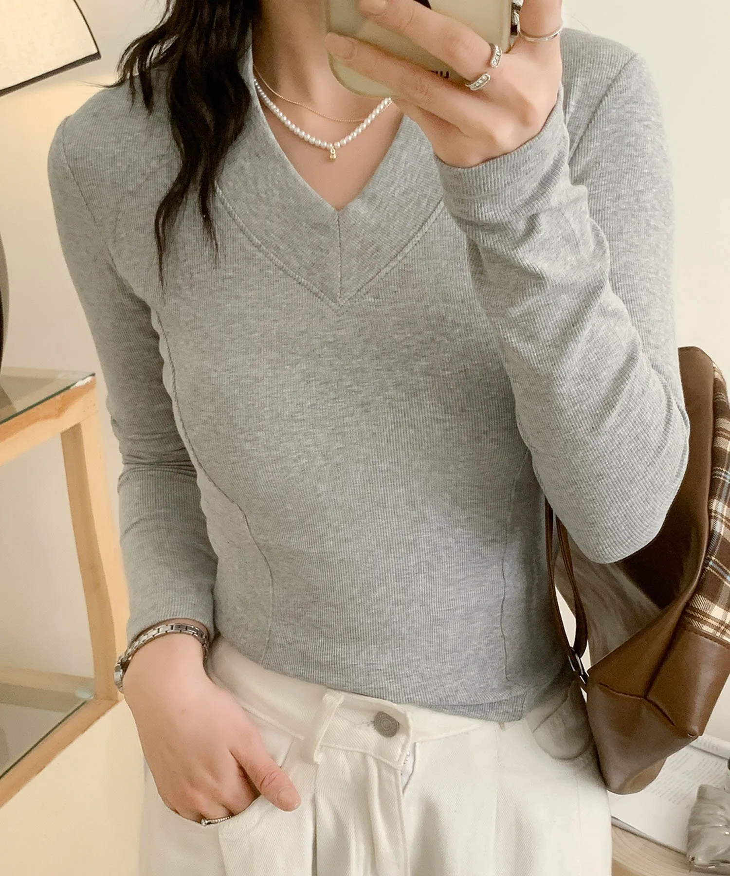 V-образный вырез, выгодно подчеркивающий декольте. Благодаря облегающему силуэту его можно носить как самостоятельно, так и в качестве нижнего слоя под куртку. Базовый вязаный топ, который можно носить как в повседневной жизни, так и в офисе.