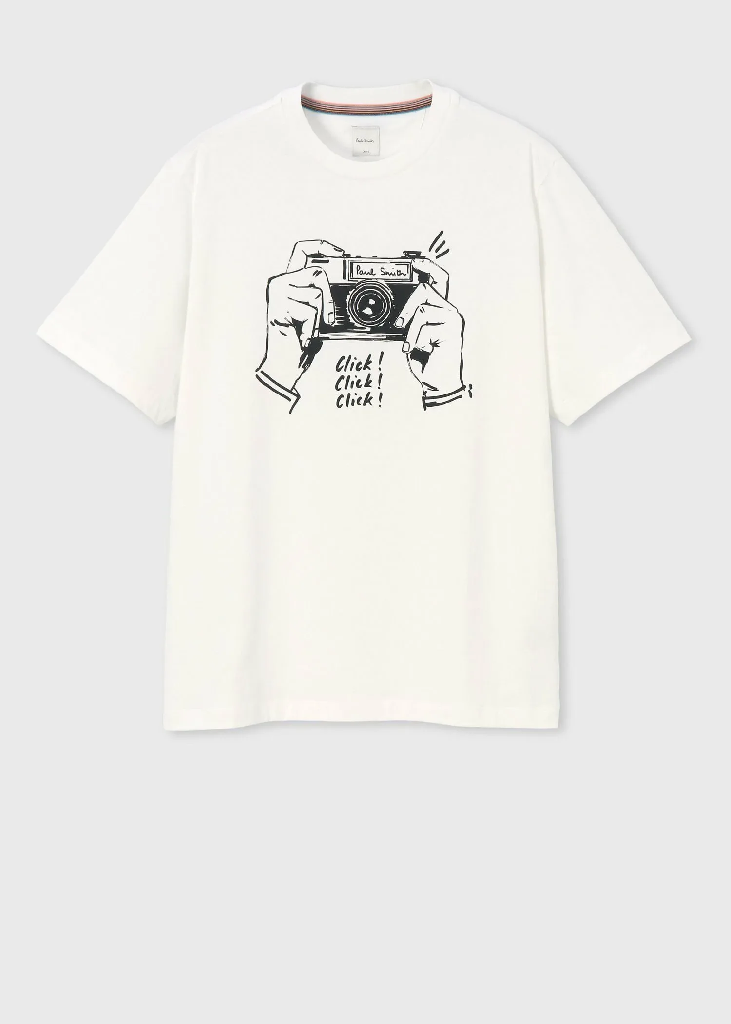 Футболка с короткими рукавами, излучающая чувство юмора и искусства. Ее игривый принт с рукой, держащей фотоаппарат, и надписью "Щелк! Щелк! Щелк!" бросается в глаза. Придавая образу ретро-стиль, графический элемент добавляет легкости и воздушности. Воротник украшен фирменной полосатой лентой, которая, наряду с логотипом Paul Smith на спине, добавляет изюминку. Хотя она и сама по себе выглядит эффектно, ее легко сочетать с другими стилями, что делает ее отличным акцентом для любого образа. Сделано в Китае