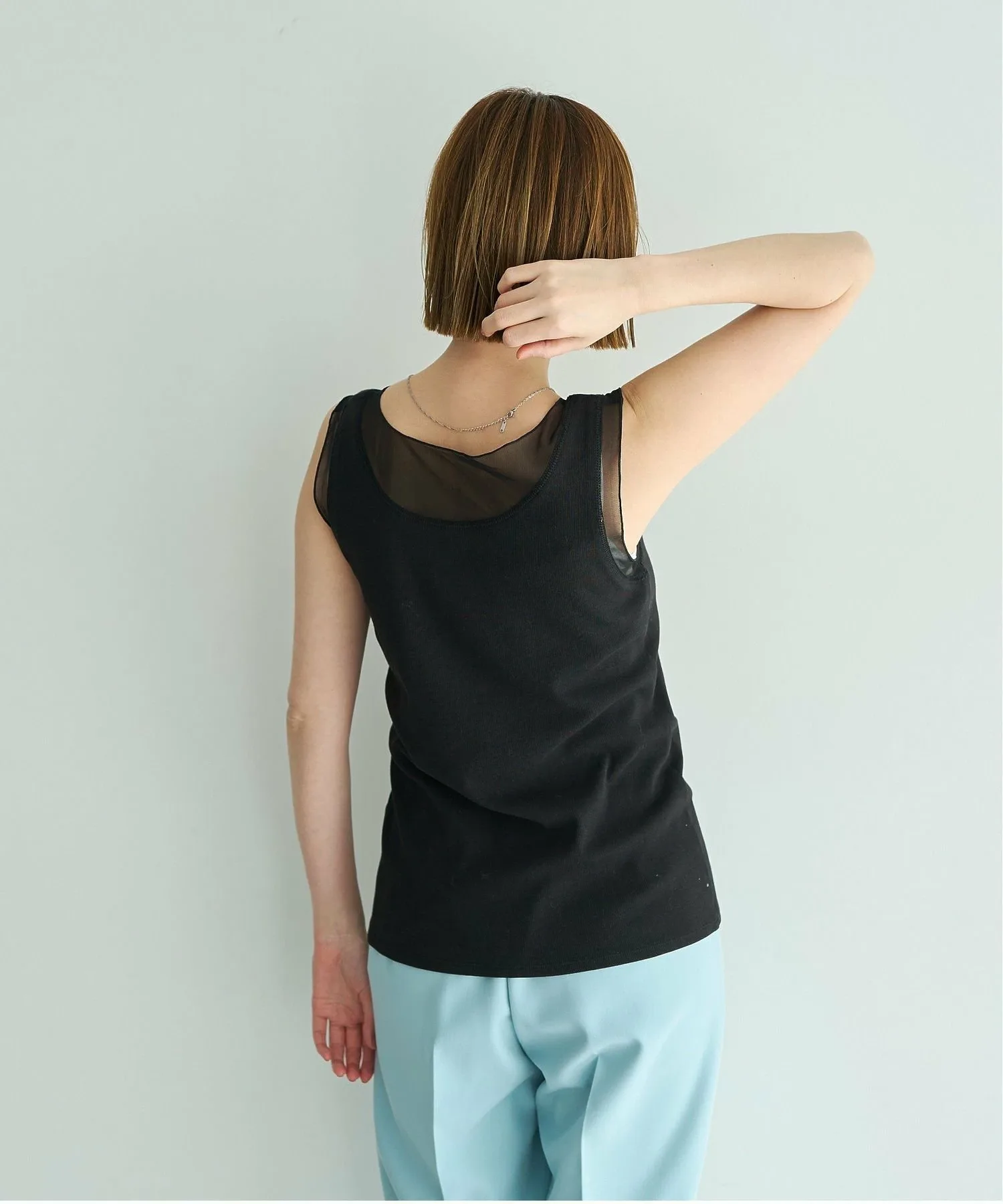 Эта майка имеет женственный дизайн с тюлем на воротнике.