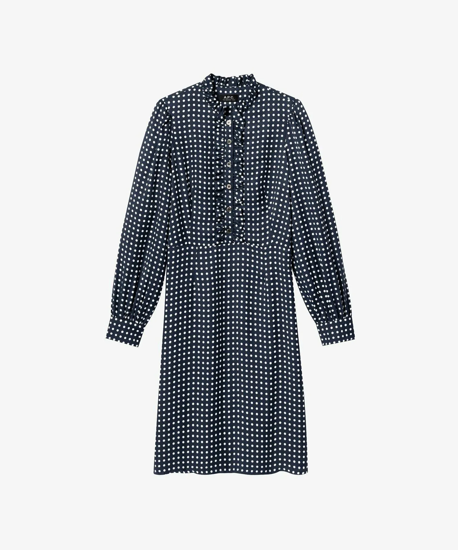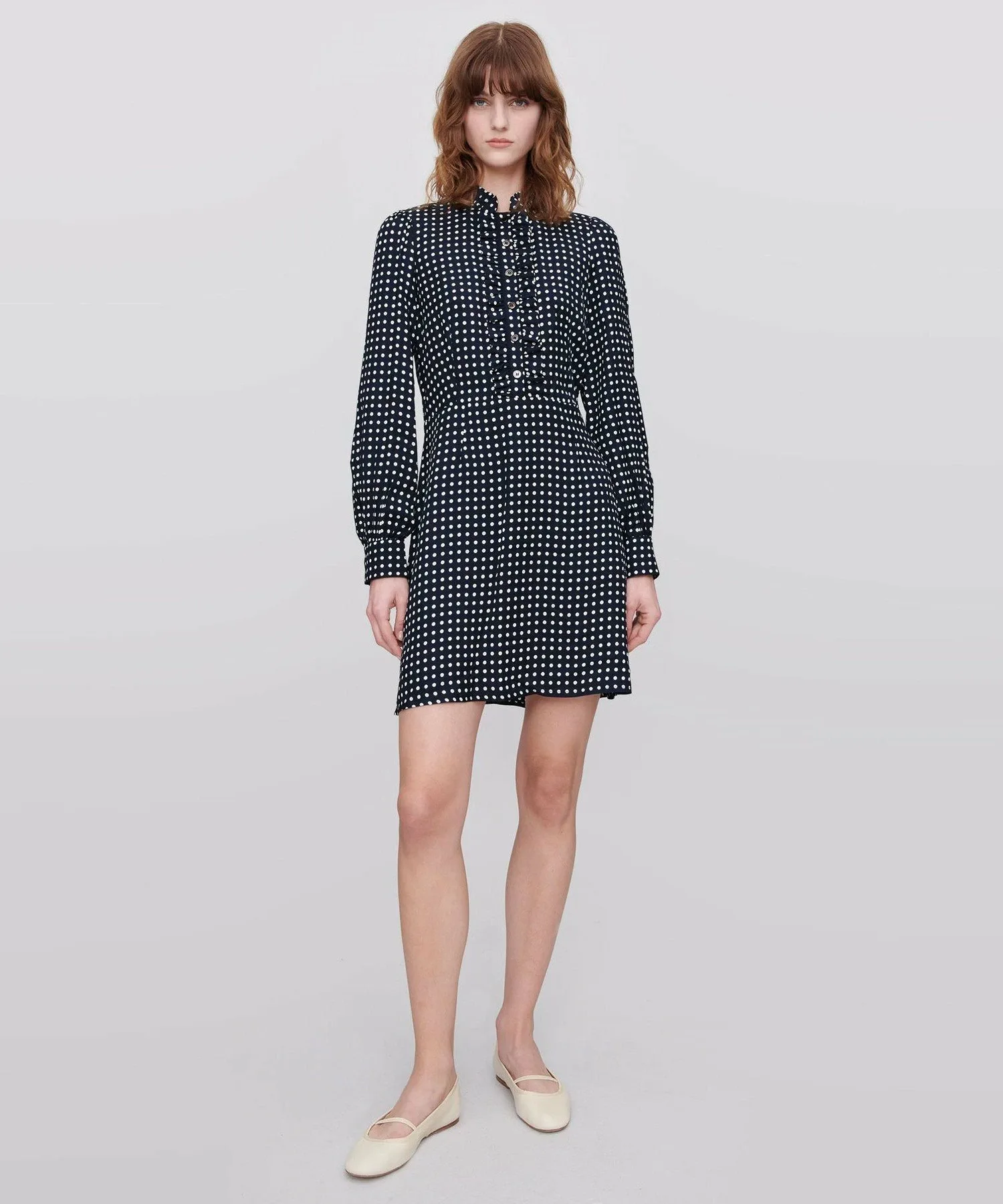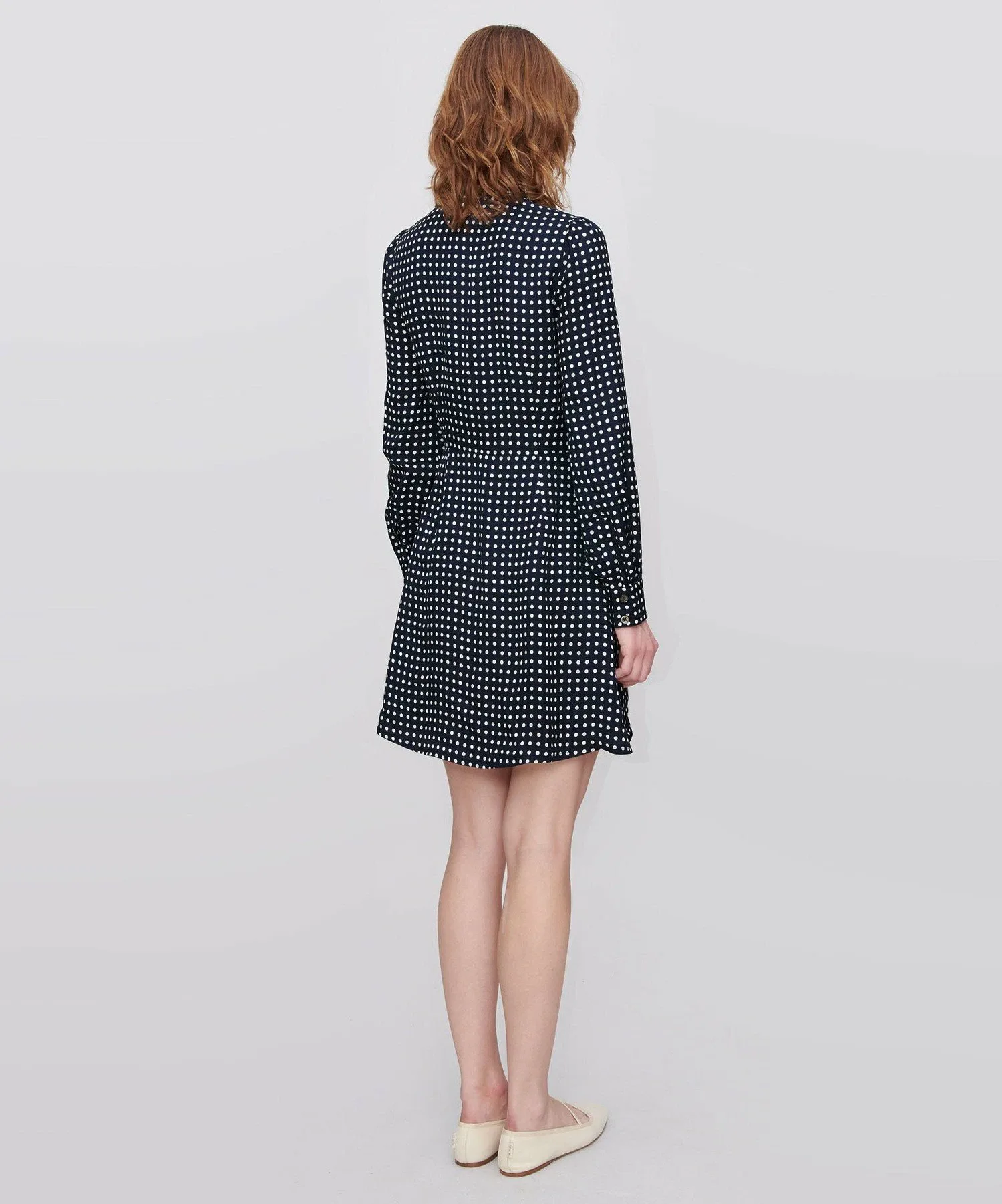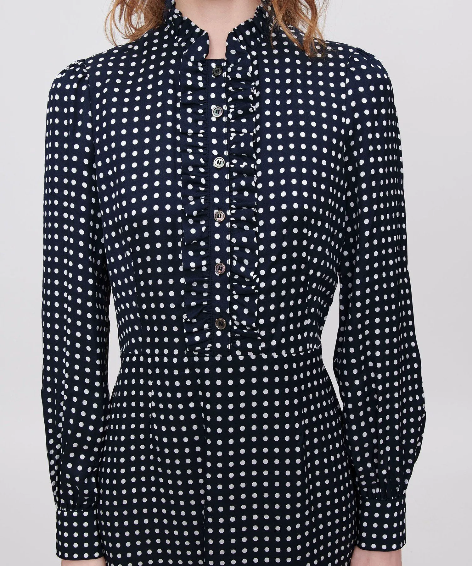 Темно-синее платье из вискозы в белый горошек.