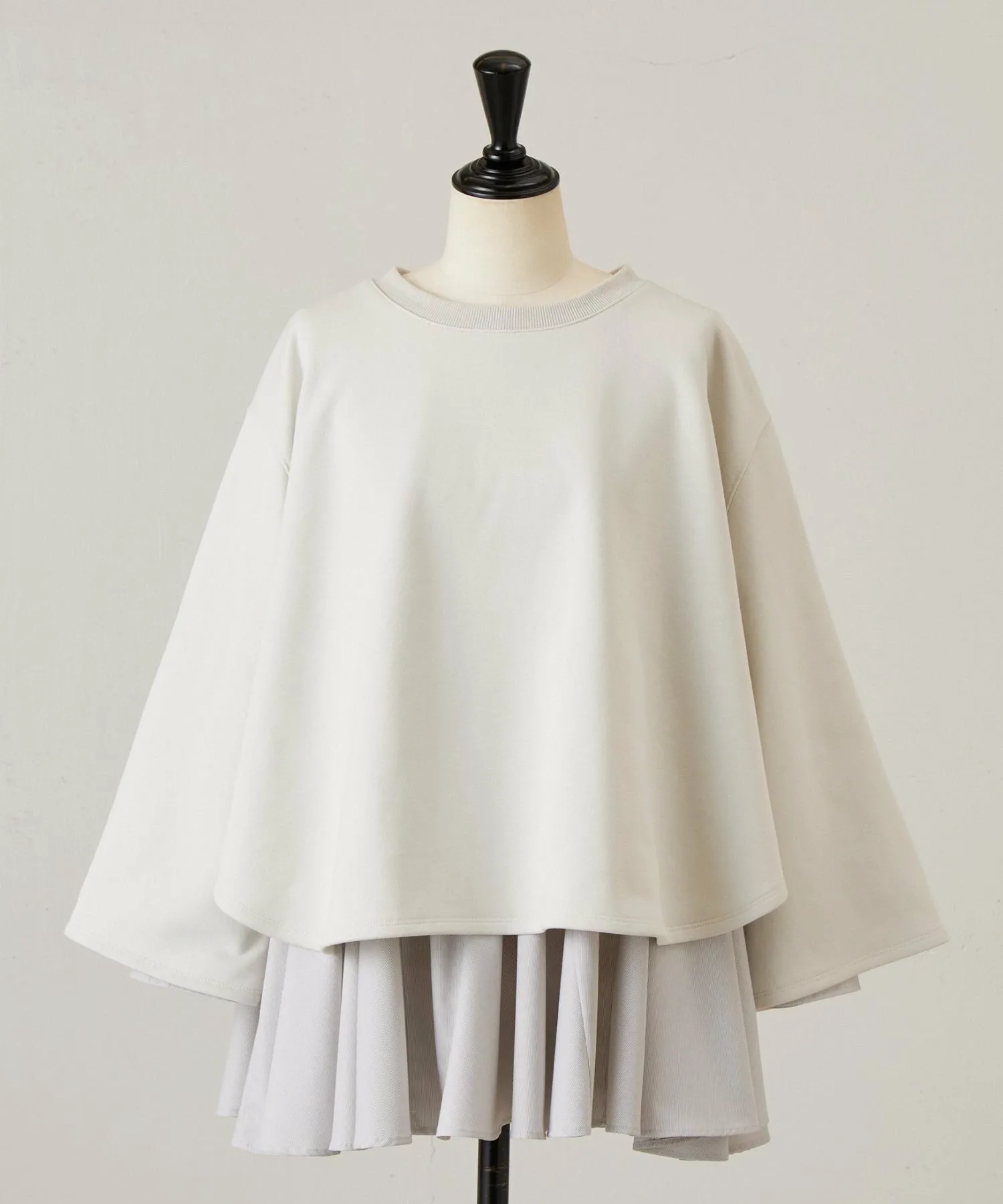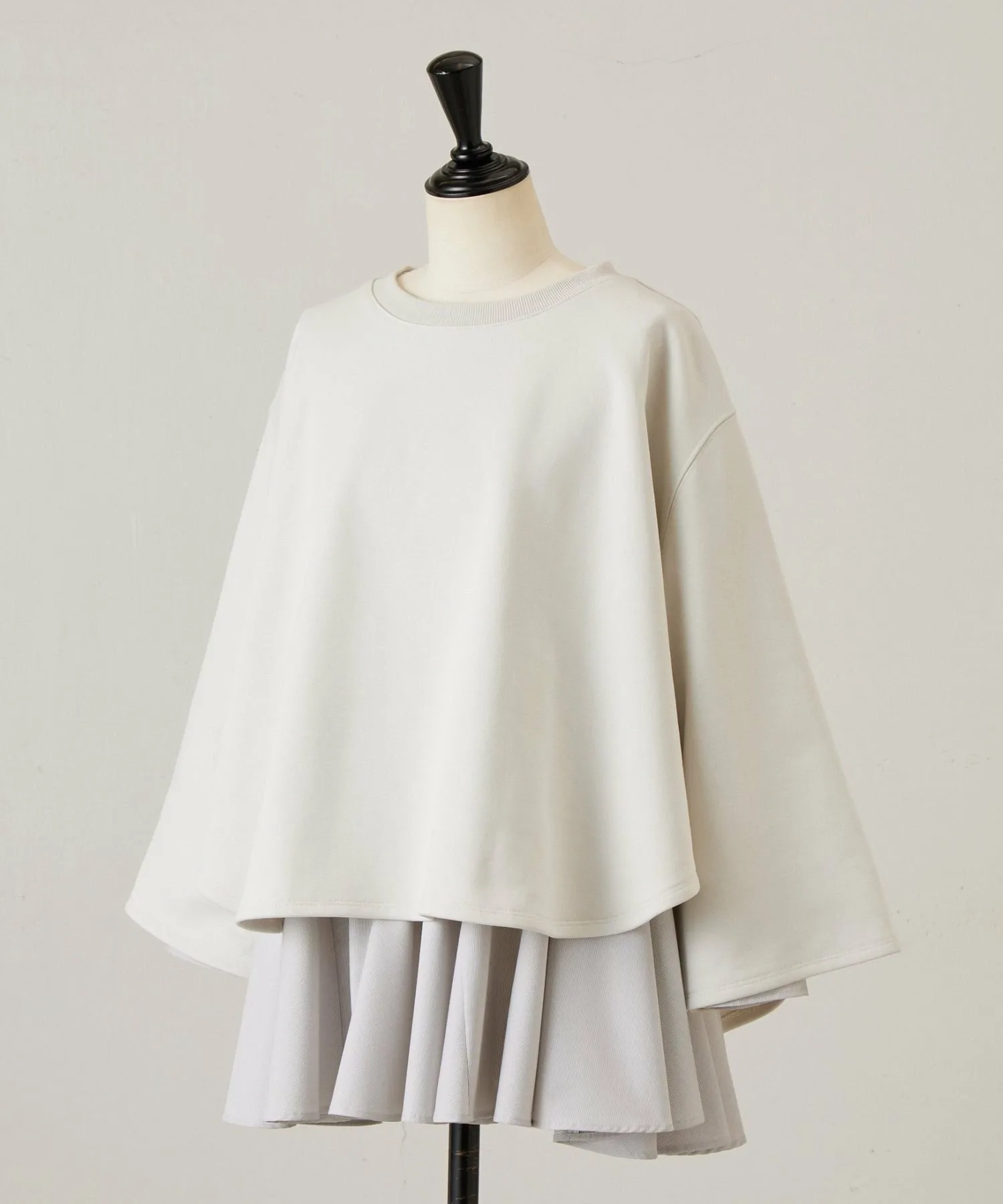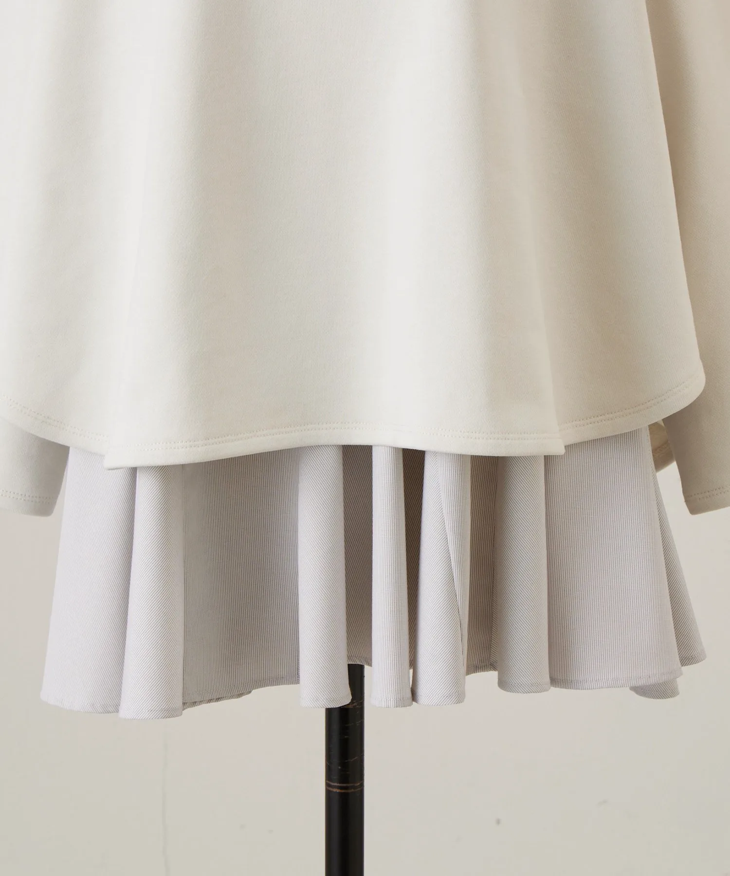 Блузка с длинными рукавами, выглядывающая из-под подола, выполнена из разных материалов для каждого цвета,