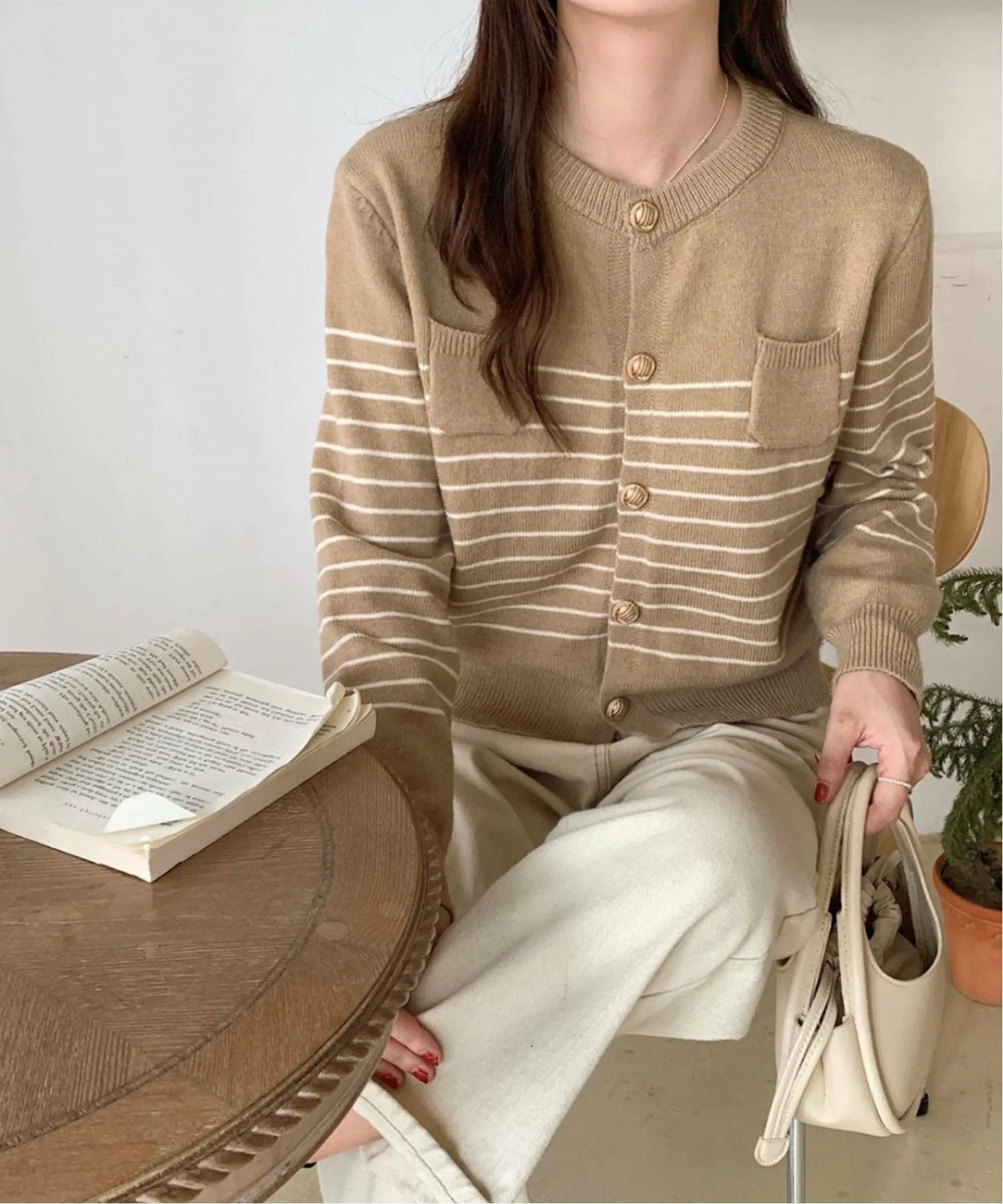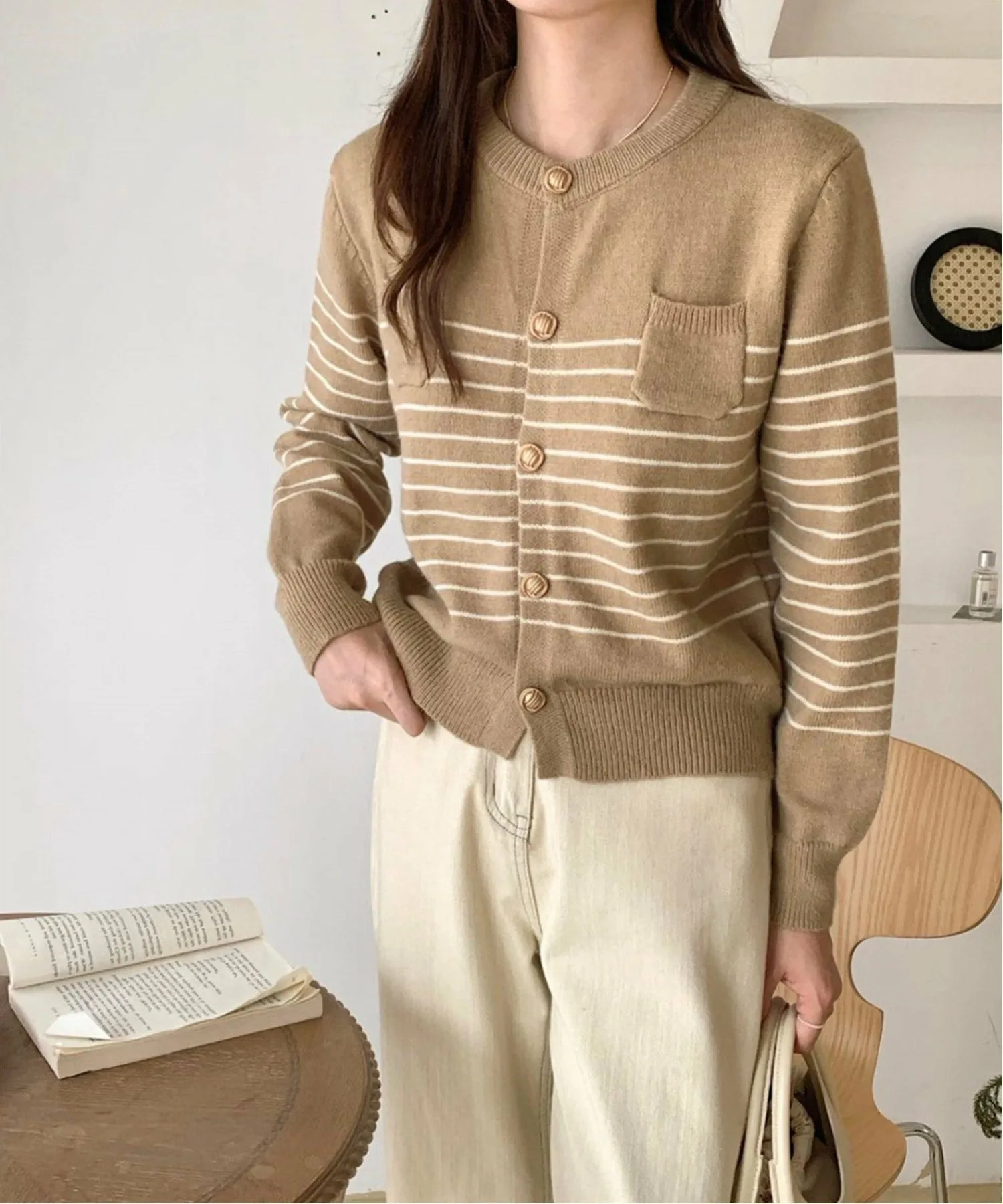 Этот элегантный кардиган украшен модным полосатым узором и золотыми пуговицами для аккуратной отделки.
