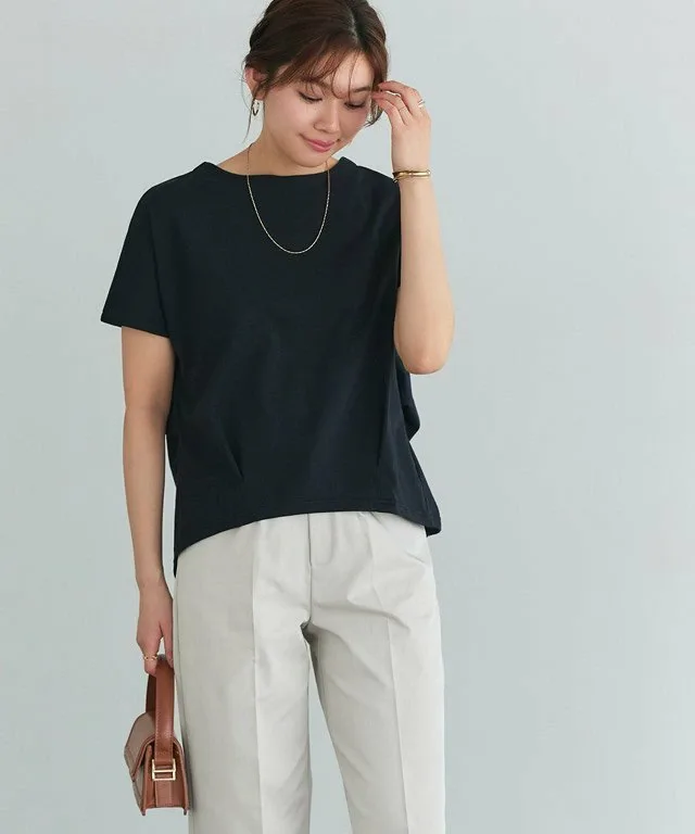 Складчатый дизайн спереди и сзади, а также аккуратный вырез горловины придают ему элегантный вид, не делая его слишком повседневным. Умеренно свободный силуэт естественным образом скрывает любые недостатки в области ягодиц. Заправив передний край в брюки, вы создадите изысканный образ.