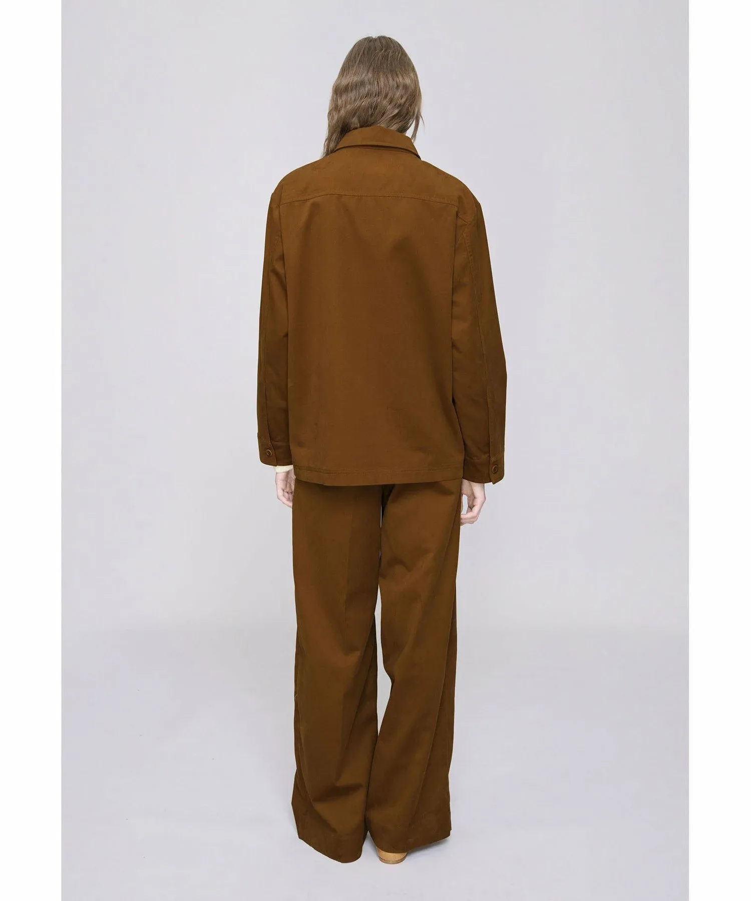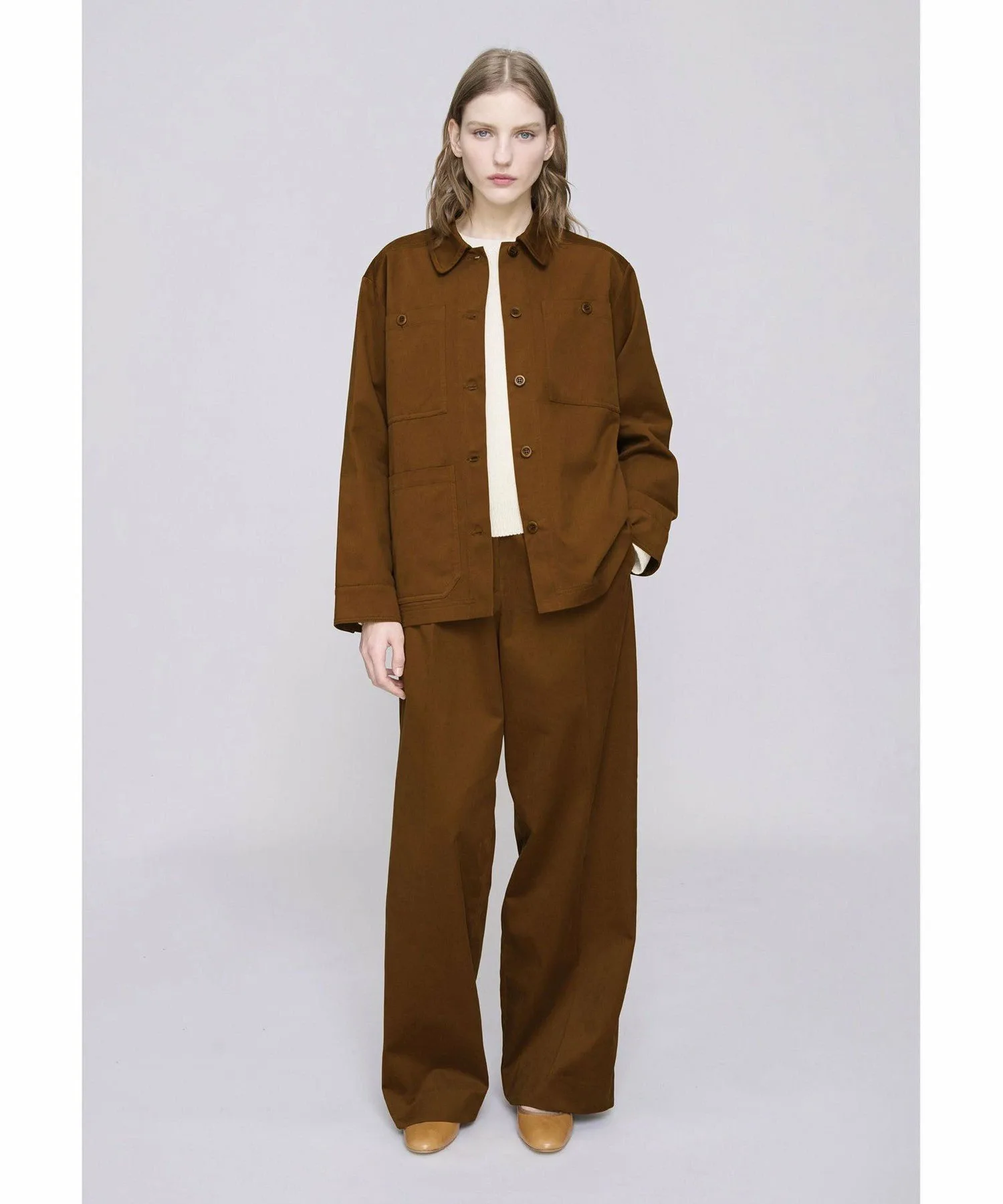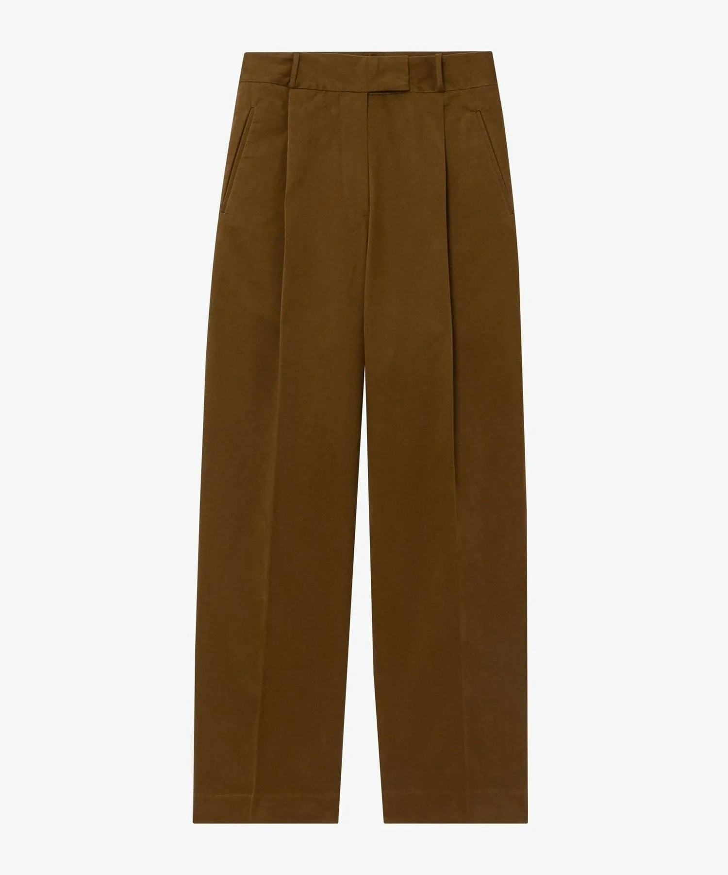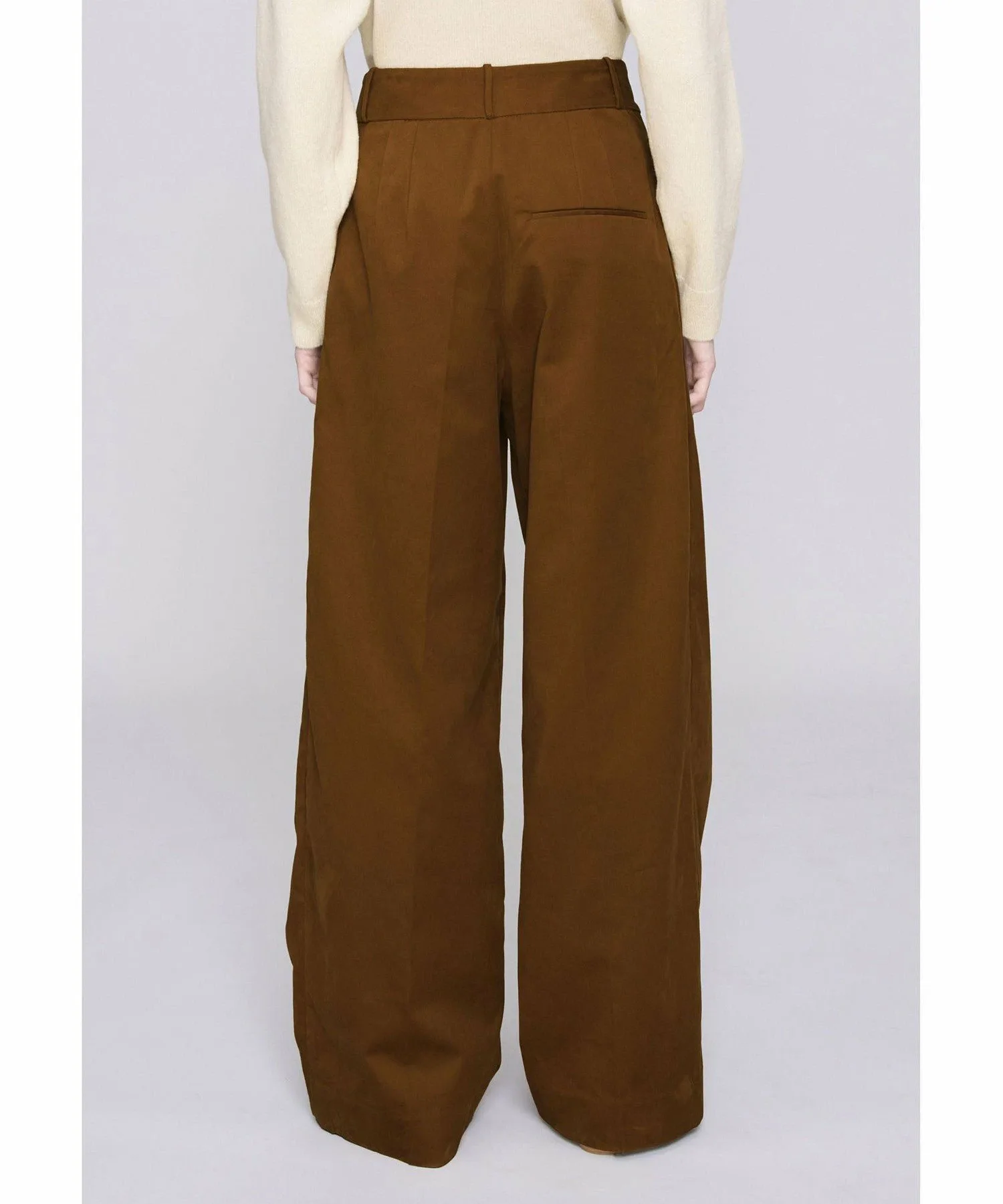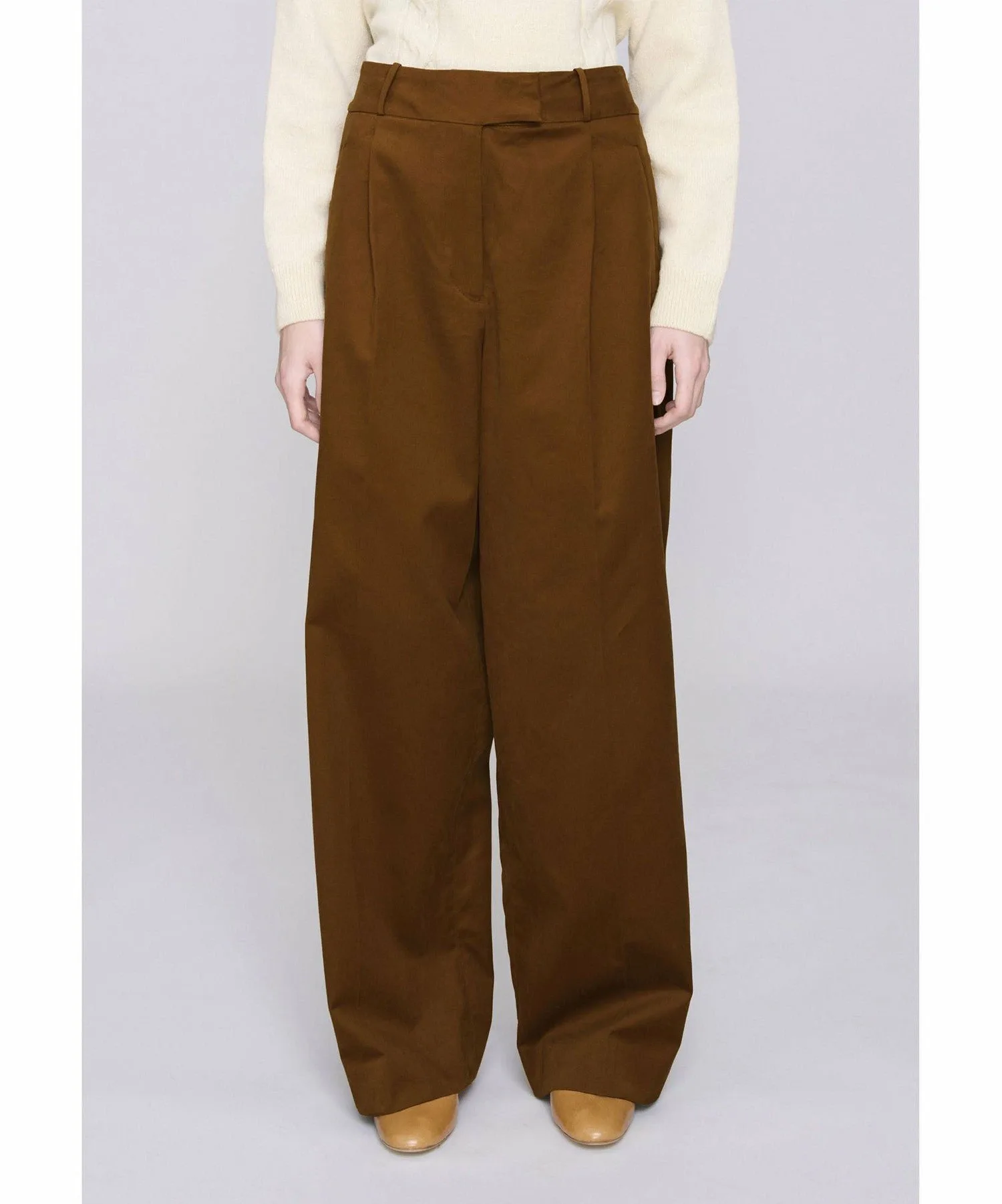 Длинные брюки верблюжьего цвета с широкими штанинами.