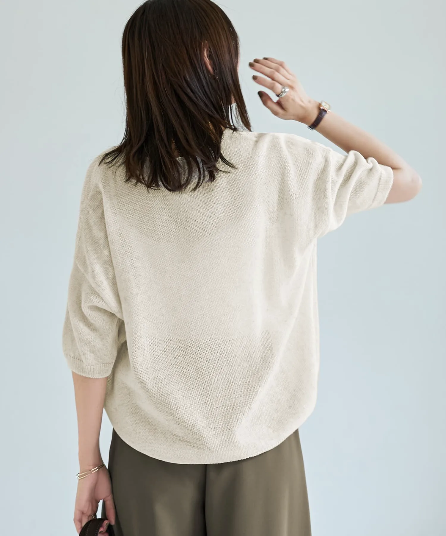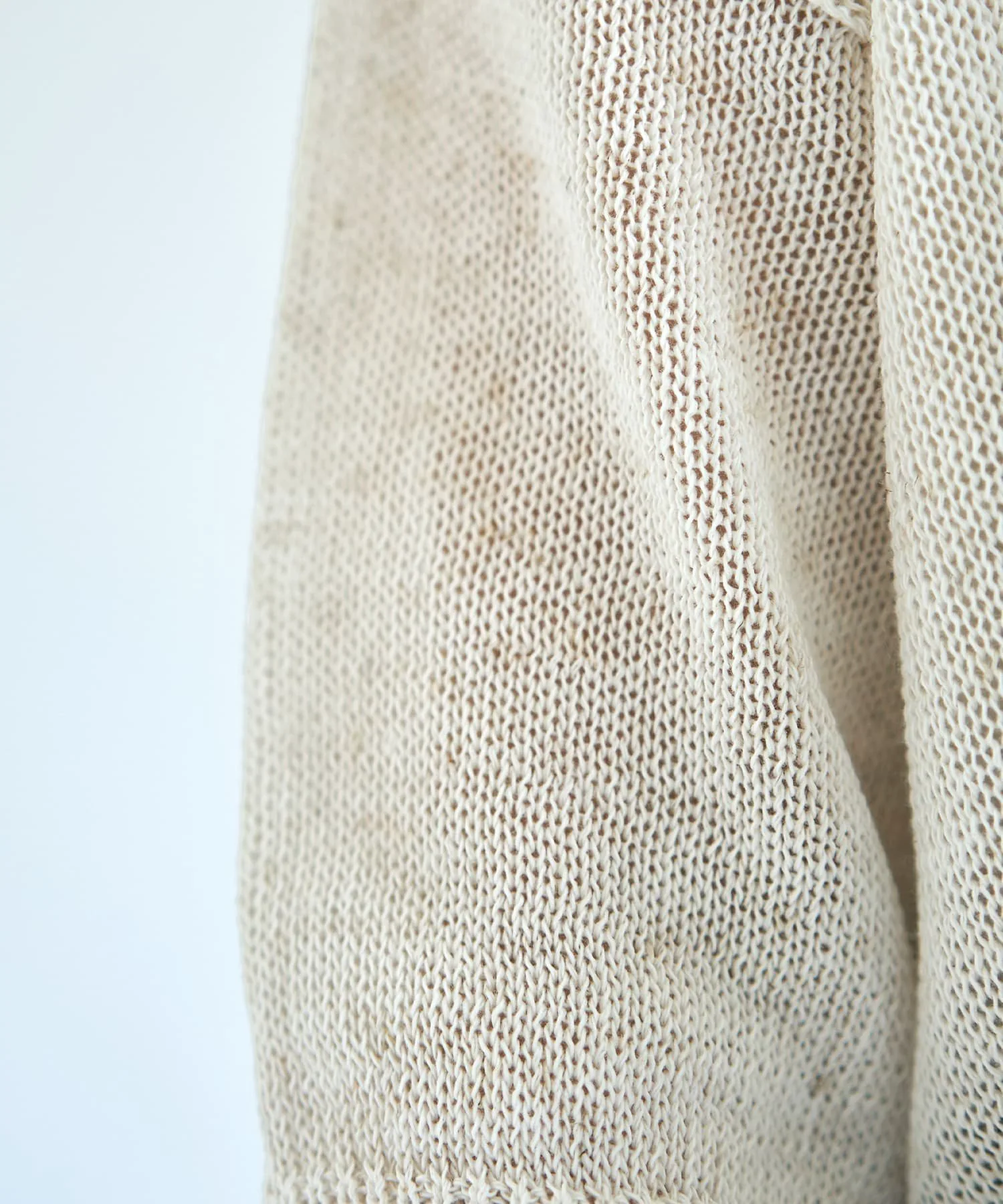 Ткань имеет легкую примесь льна для сухости. Открытая вязка создает естественный, полупрозрачный вид без плотных стежков. Он отлично смотрится поверх футболки или топа, майки или платья.