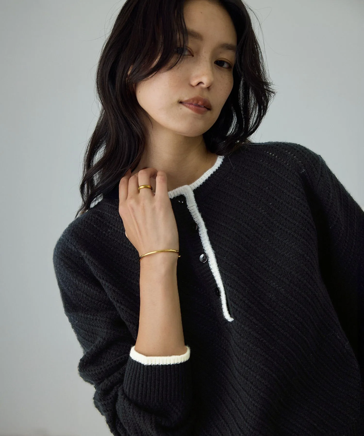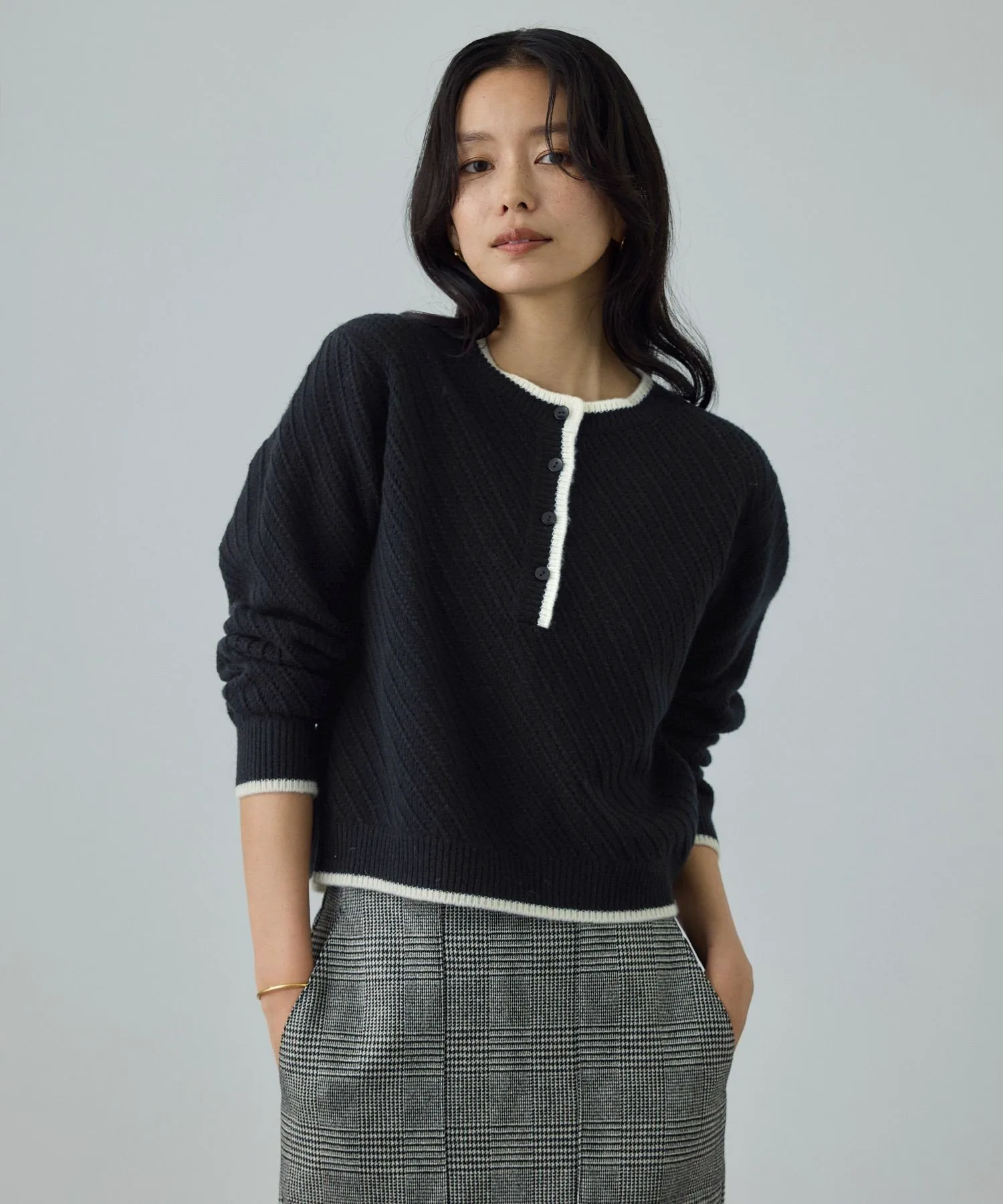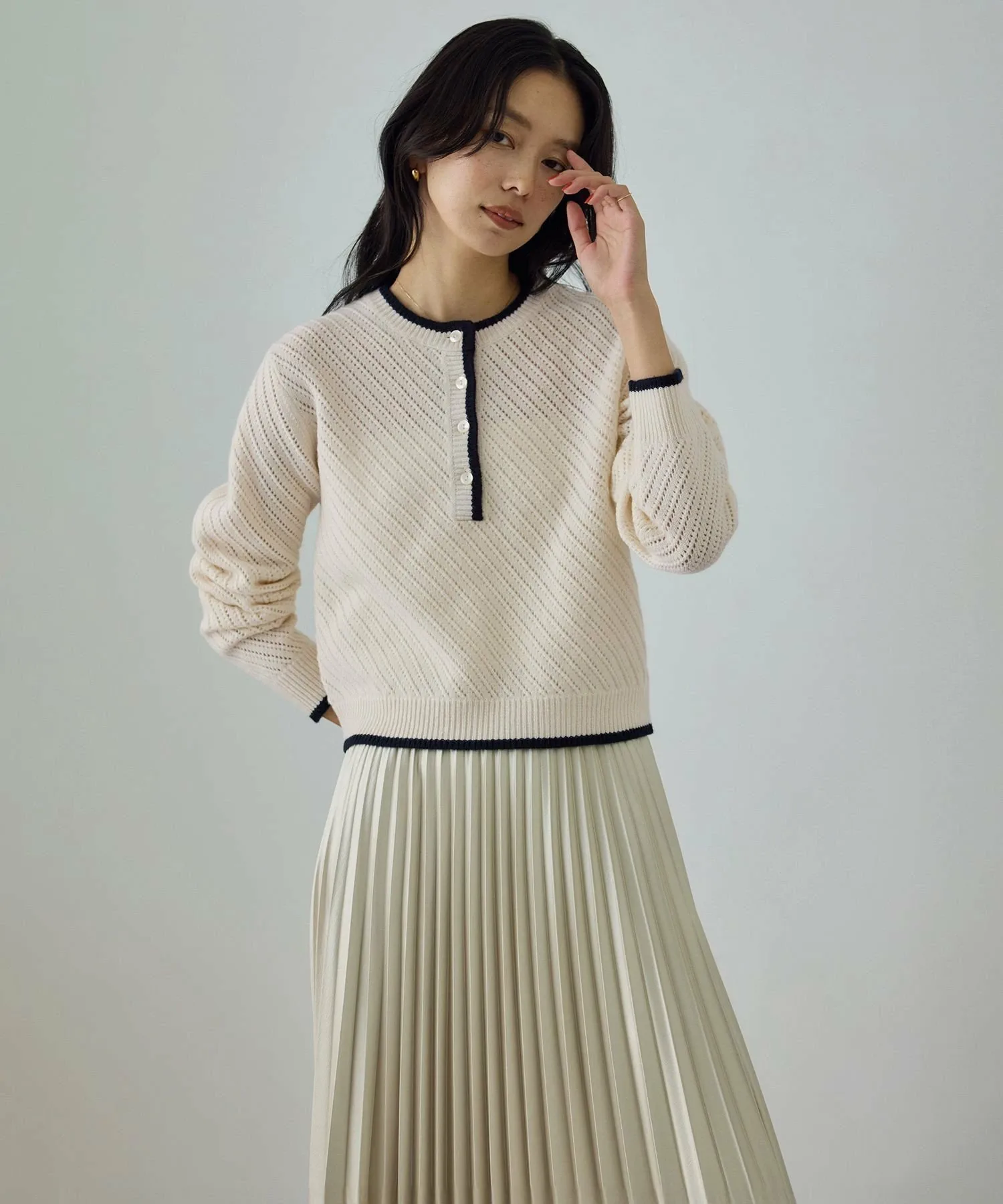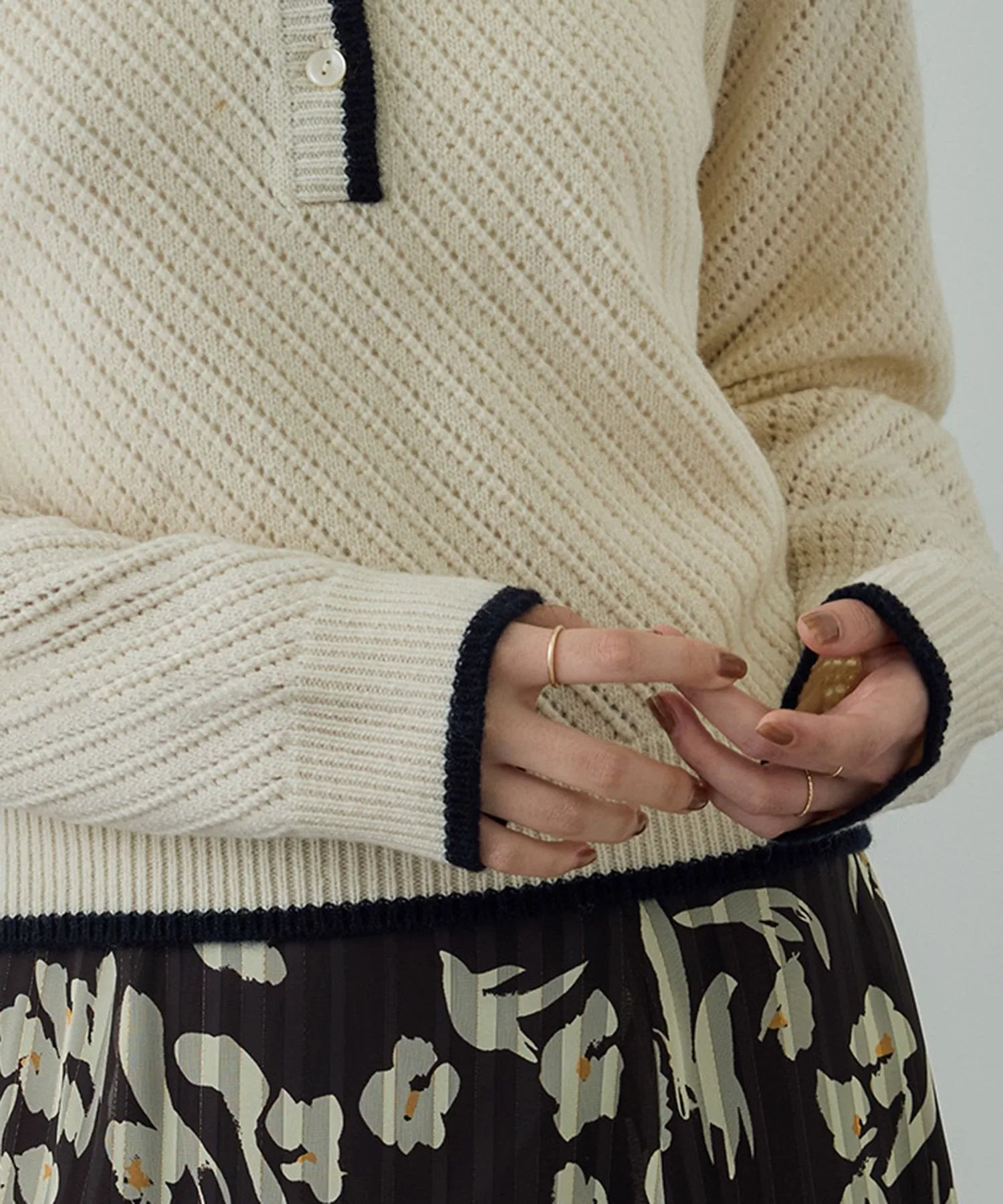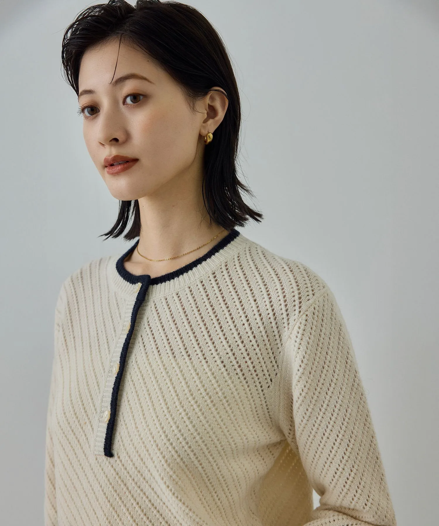 Легкий пуловер с ажурным узором. Изготовлен из смесовой ткани средней плотности с добавлением 5% кашемира, он пушистый и мягкий на ощупь. Контрастные цветовые линии на вырезе и планке добавляют тонкий акцент при ношении под пальто. Простая, но универсальная вещь для повседневной носки.
