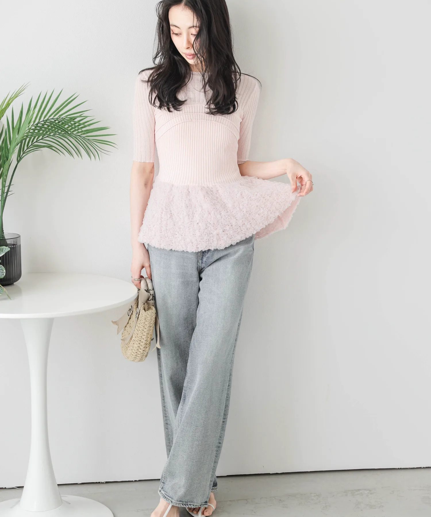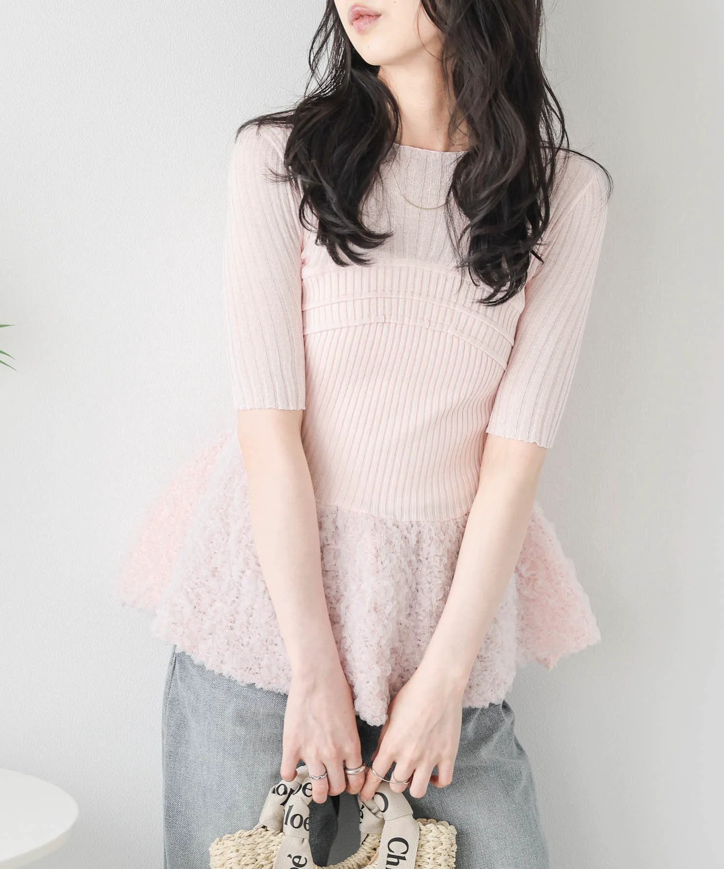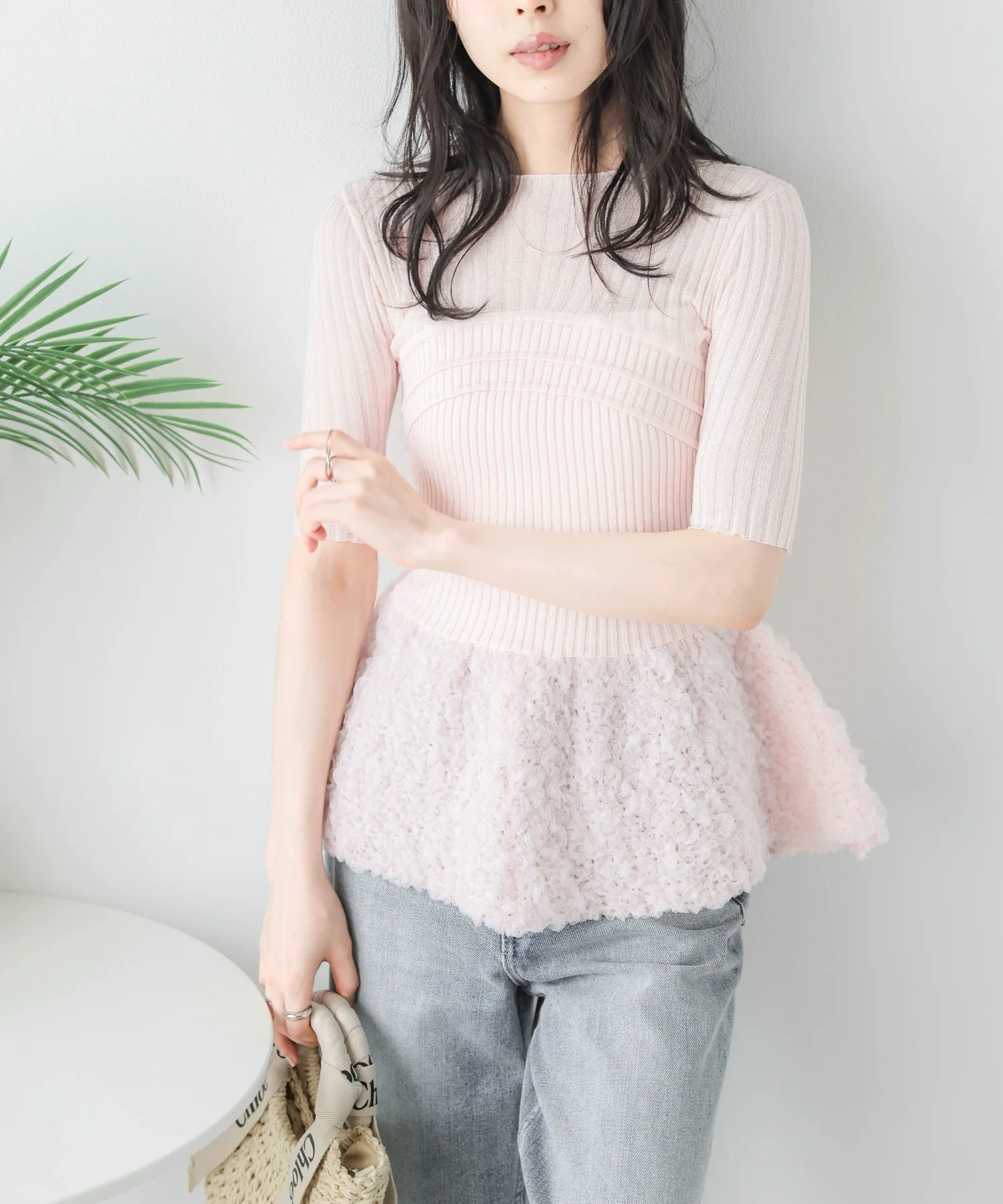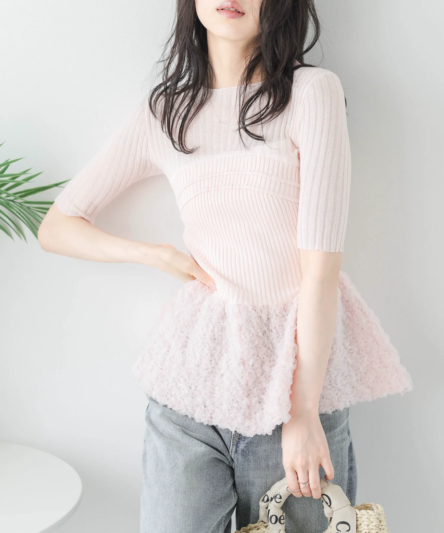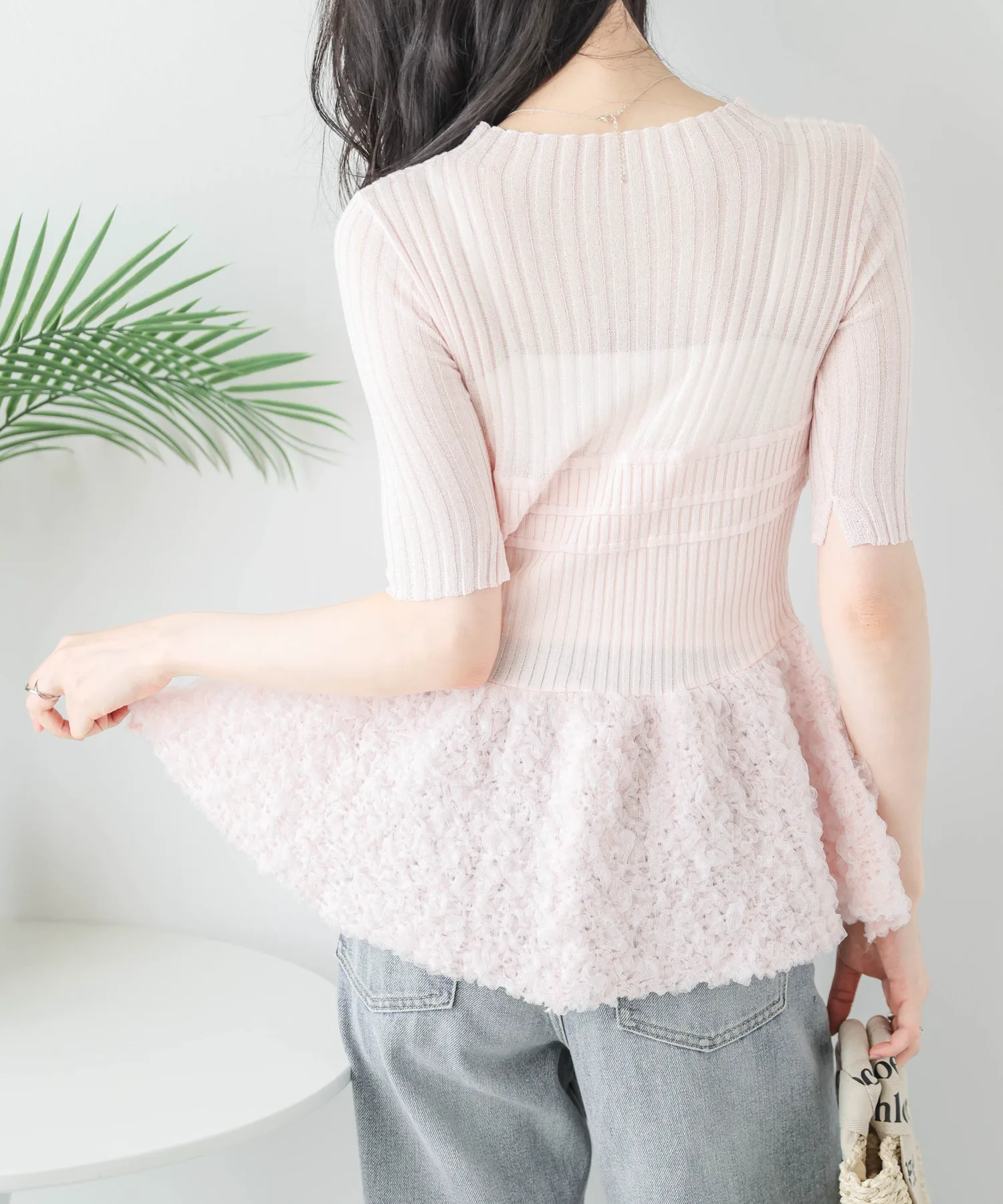 Прозрачный трикотажный топ с многослойным бюстье и свежей, объемной, похожей на пузырь, оборкой из жаккардовой ткани.