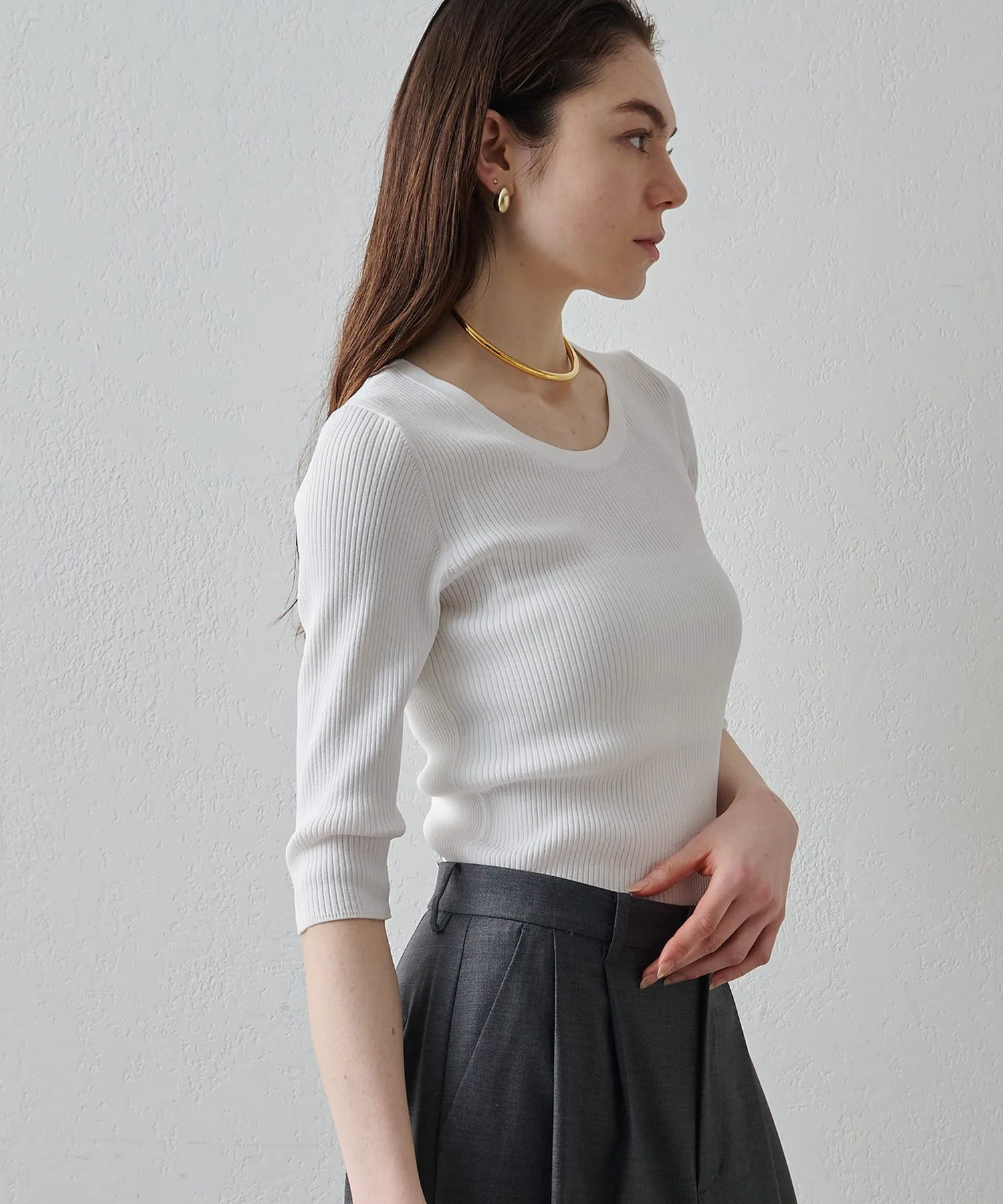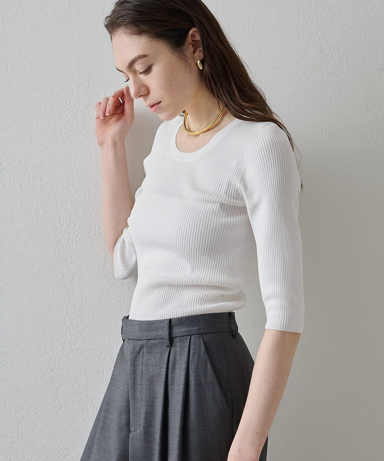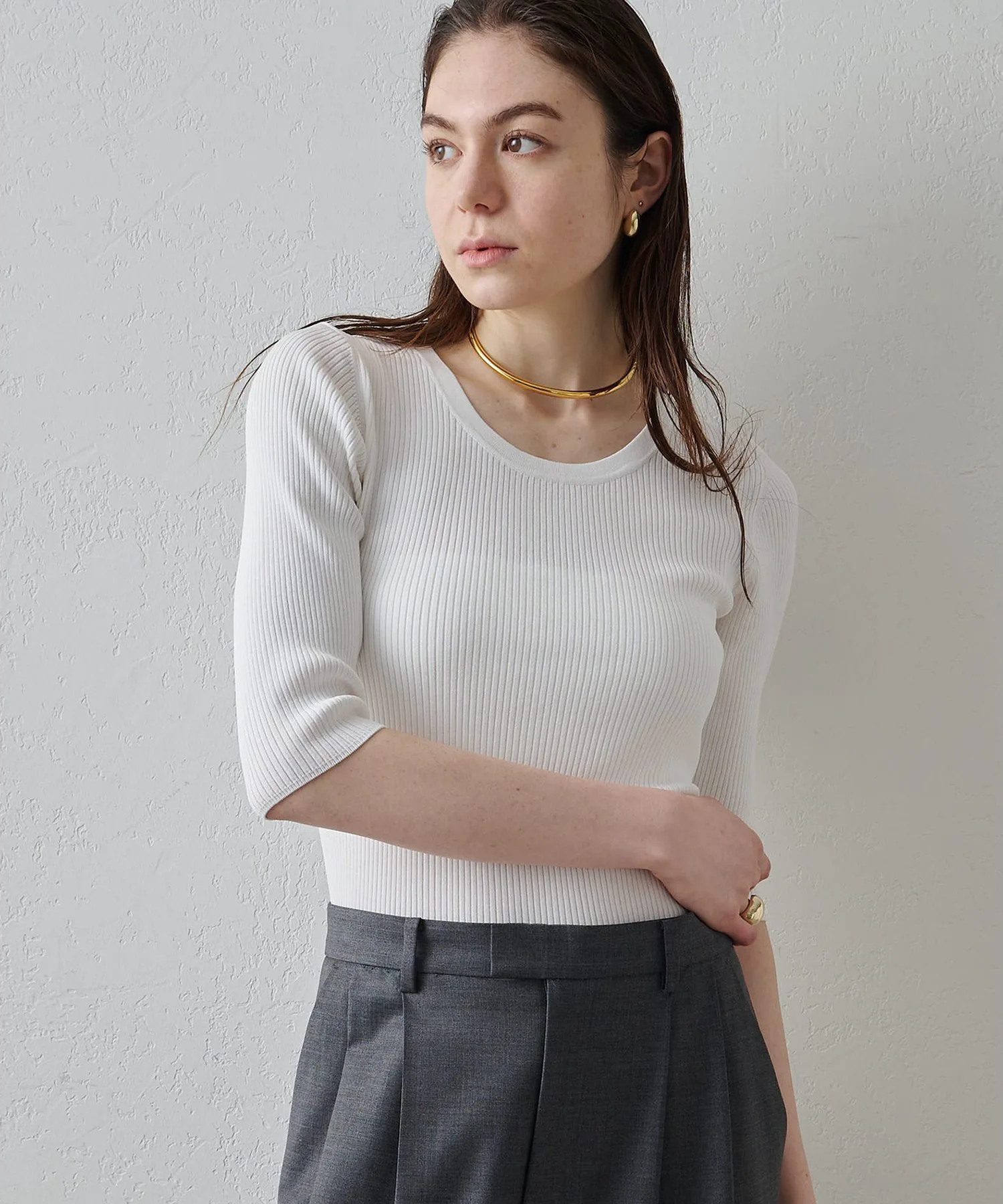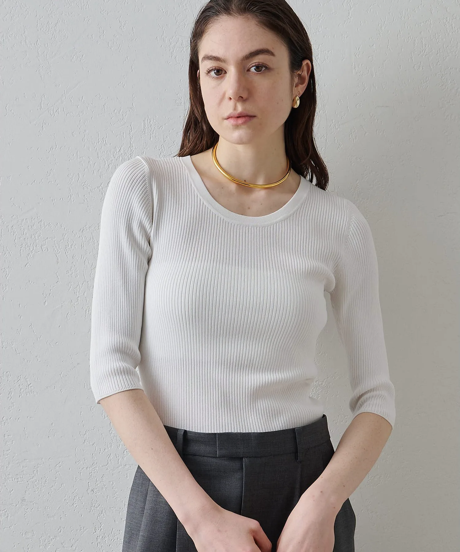 Трикотажная блузка в рубчик с рукавами три четверти, легко вписывающаяся в различные стили.