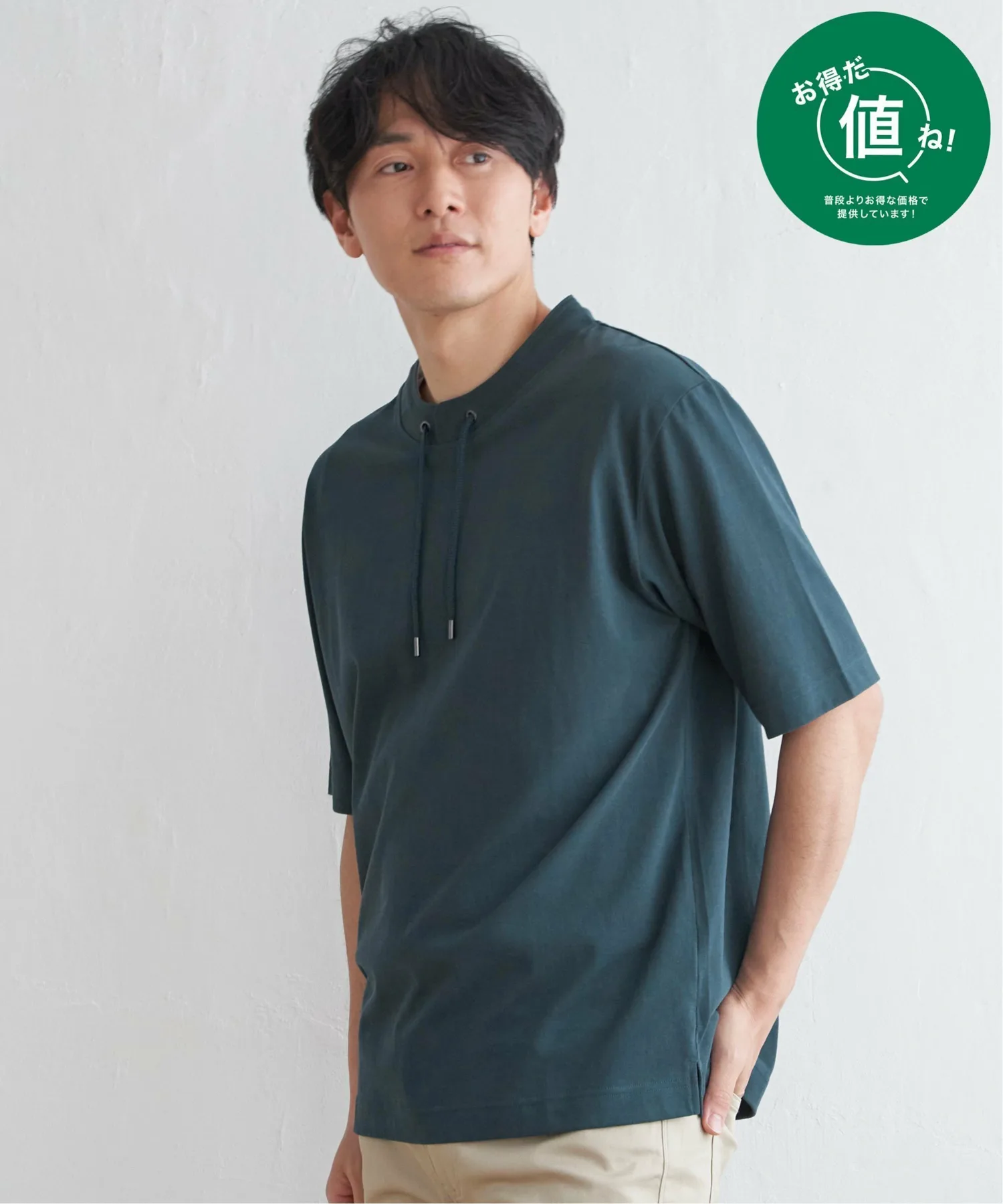 Эта футболка с рукавами 5/4 имеет воротник-стойку и шнурок.