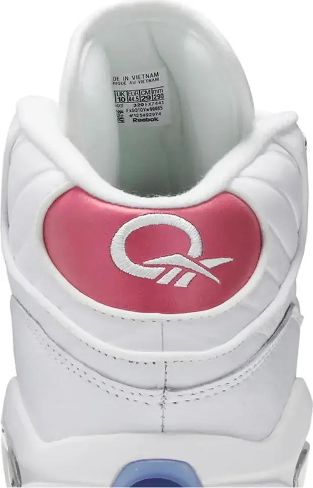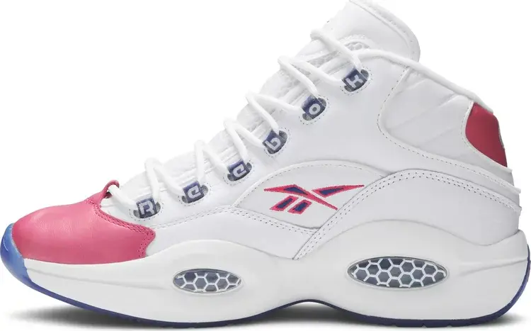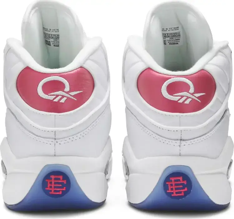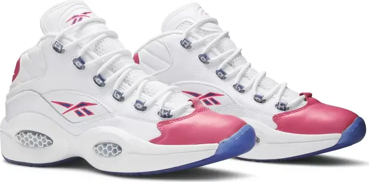 Созданные в сотрудничестве с нью-йоркским дизайнером спортивной одежды, кроссовки Eric Emanuel x Reebok Question Mid «Pink Toe» представляют собой яркую интерпретацию дебютной фирменной обуви Аллена Айверсона. Верх из белой мятой кожи украшен розовыми деталями на носке и язычке на пятке, последний вышит стандартным логотипом Question. Ледяная полупрозрачная подошва оборачивает пятку, обнажая монограмму Эрика Эмануэля, заменяющую цифру AI «3» на майке.