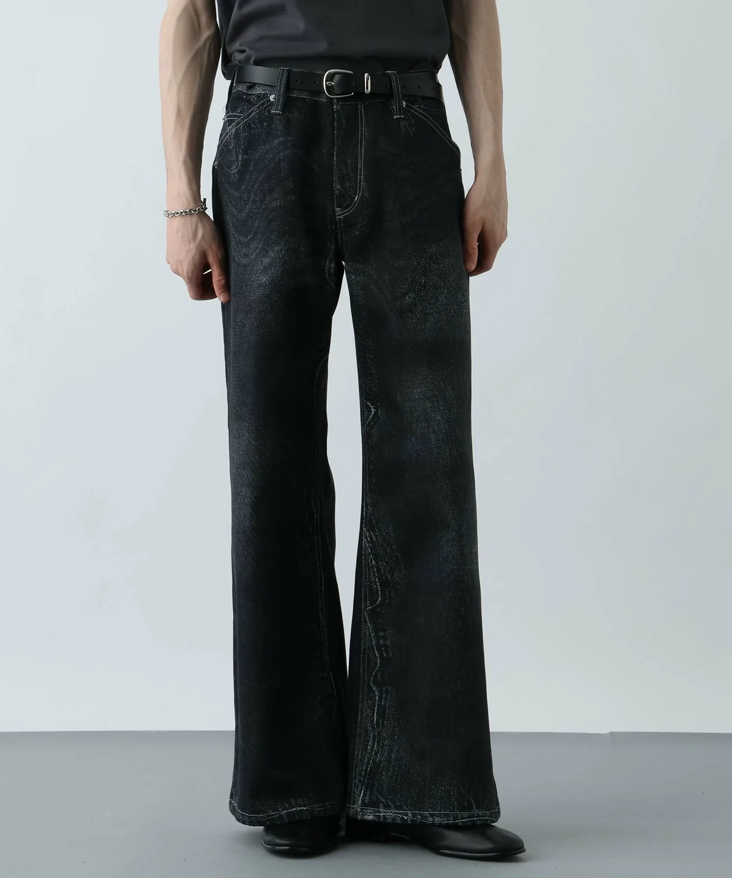 Принт имеет оттенки, напоминающие выцветшую отделку, характерную для джинсовой ткани, что позволяет легко вписать его в образ, не делая его слишком заметным.