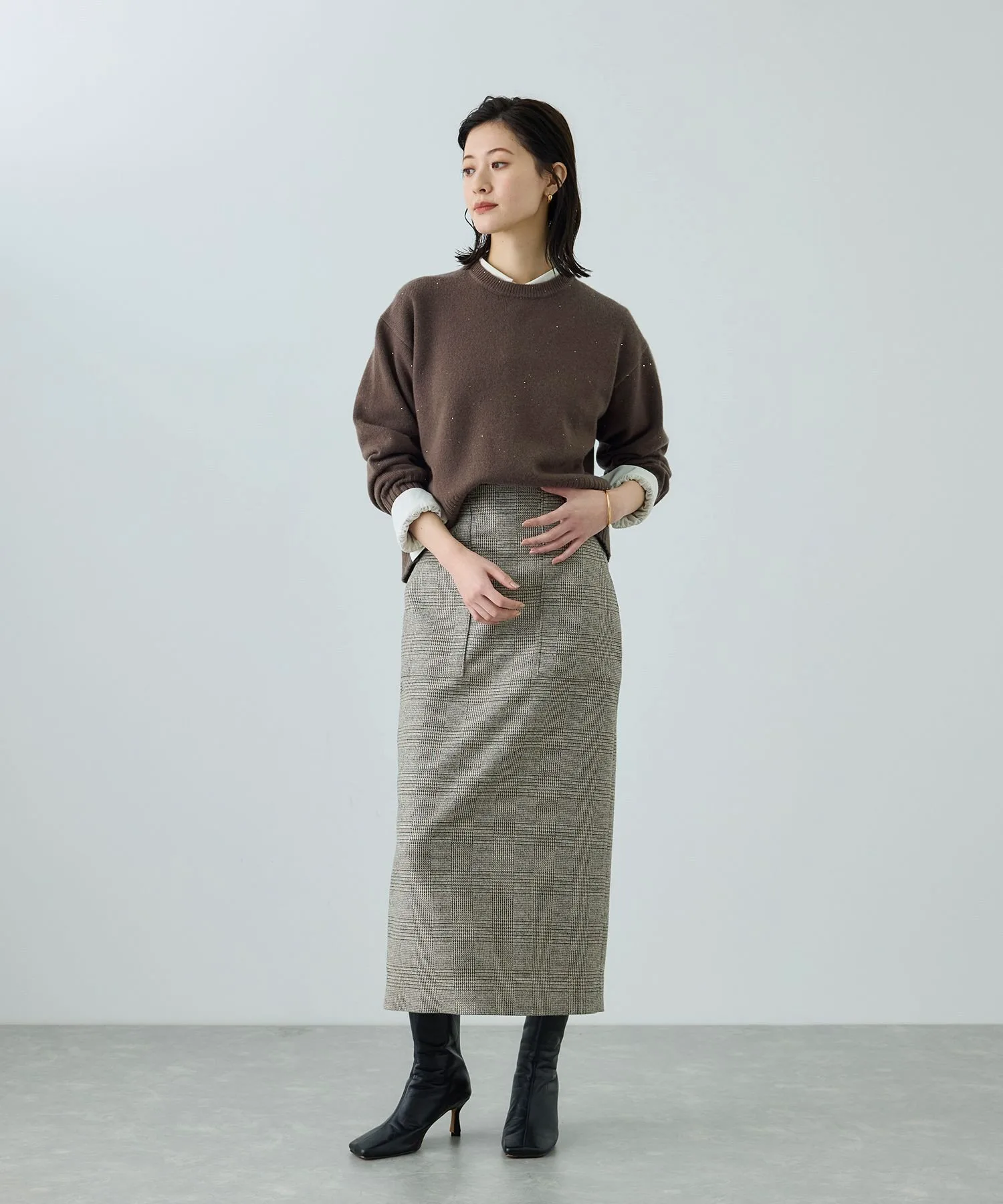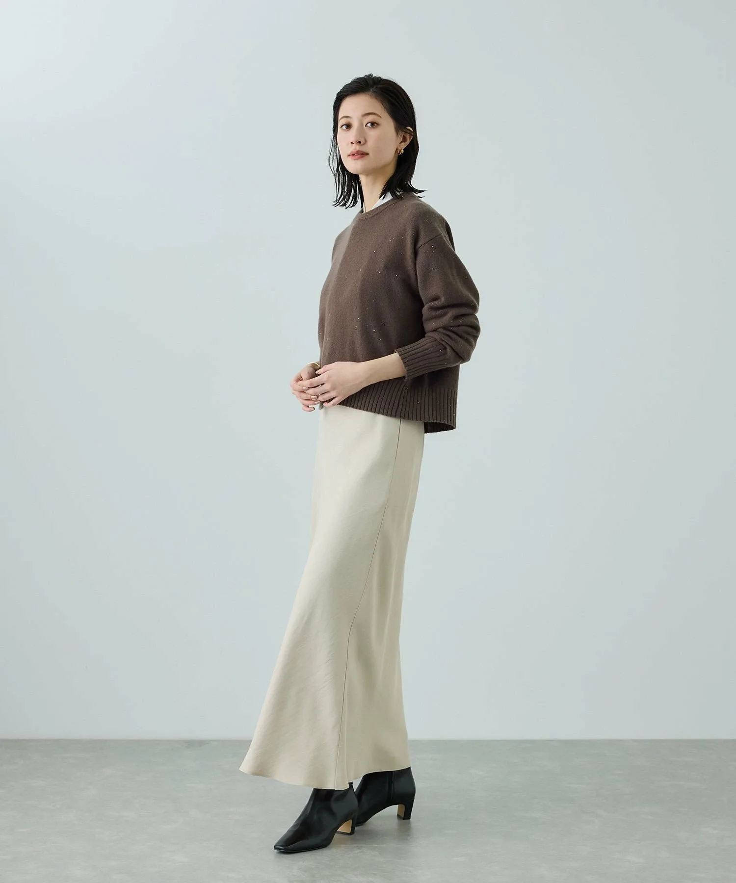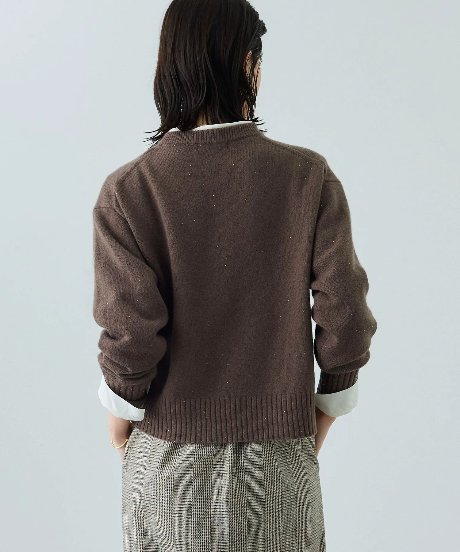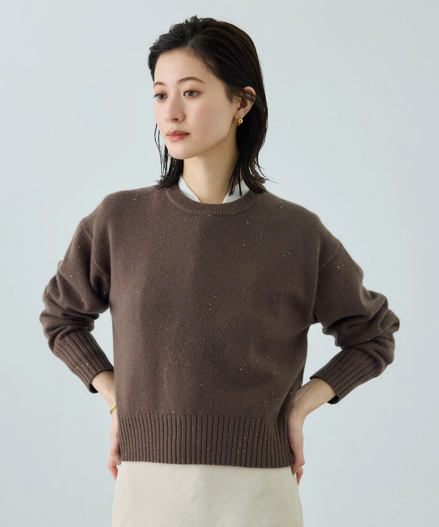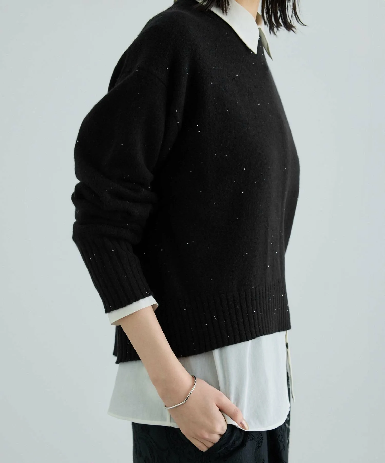 Идеально подходит для гламурных новогодних мероприятий и вечеринок, этот короткий трикотажный свитер украшен элегантными и нежными пайетками, которые подчеркнут вашу женственность. [Дизайн и силуэт] Этот свитер великолепен, пайетки покрывают все изделие. Элегантный круглый вырез и диагональные боковые швы, идущие от переднего края до заднего, создают эффект стройности даже при ношении с плотной внутренней подкладкой. Закругленный нижний край также усиливает мягкий, женственный образ. Этот свитер — эффектная вещь, блеск пайеток которой обязательно поднимет вам настроение в преддверии новогодних праздников. [Рекомендуемый стиль] Добавьте его к своему обычному стилю для создания повседневного образа с брюками или женственной юбкой для утонченного, элегантного штриха. [Материал] Это высококачественное натуральное волокно, изготовленное из 100% сверхтонкой мериносовой шерсти, очень мягкое и приятное на ощупь. Оно невероятно теплое, что делает его идеальным для холодных зимних дней.