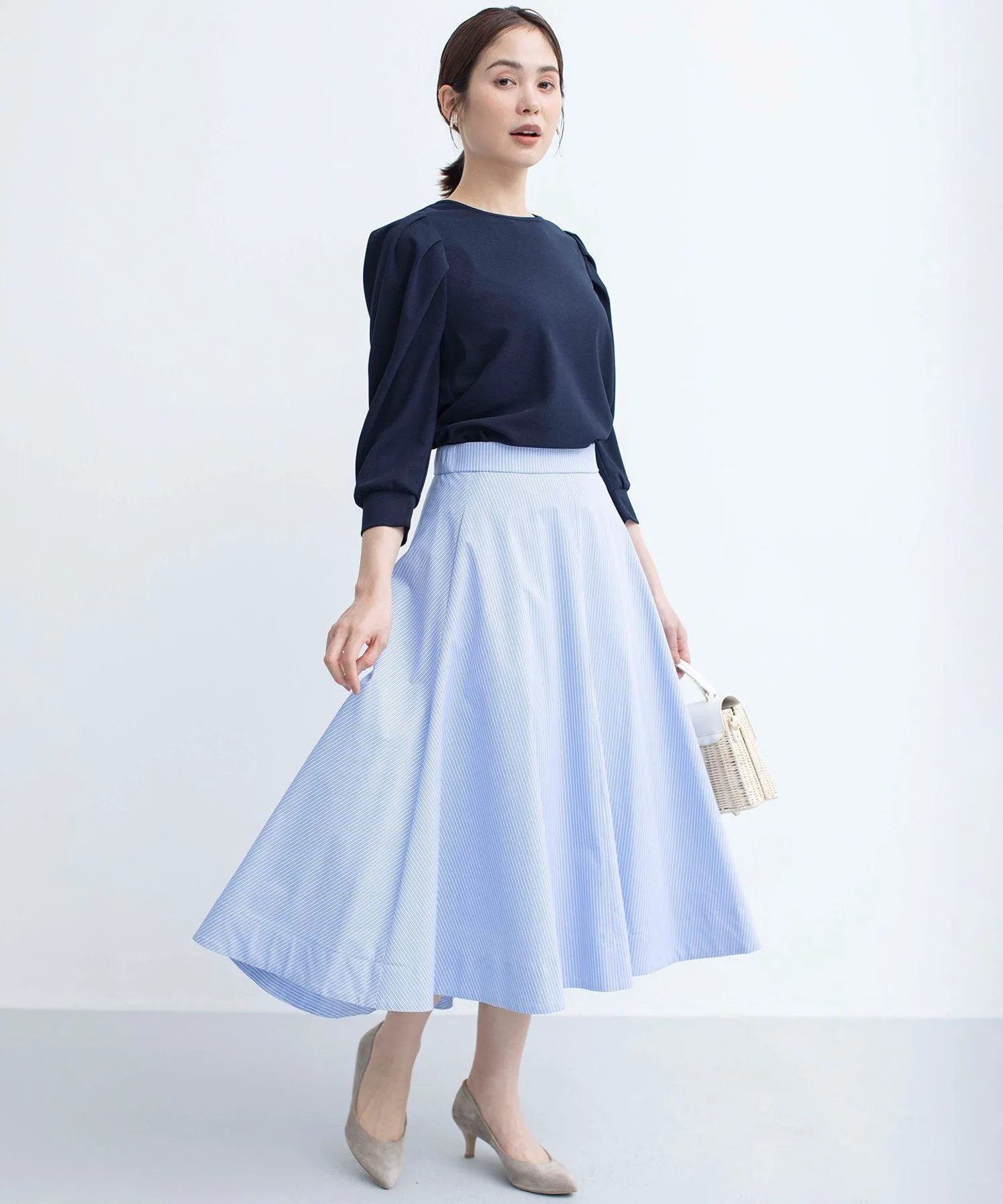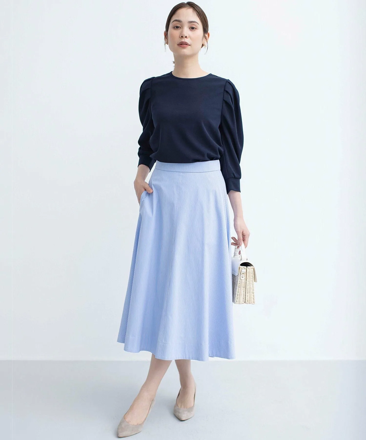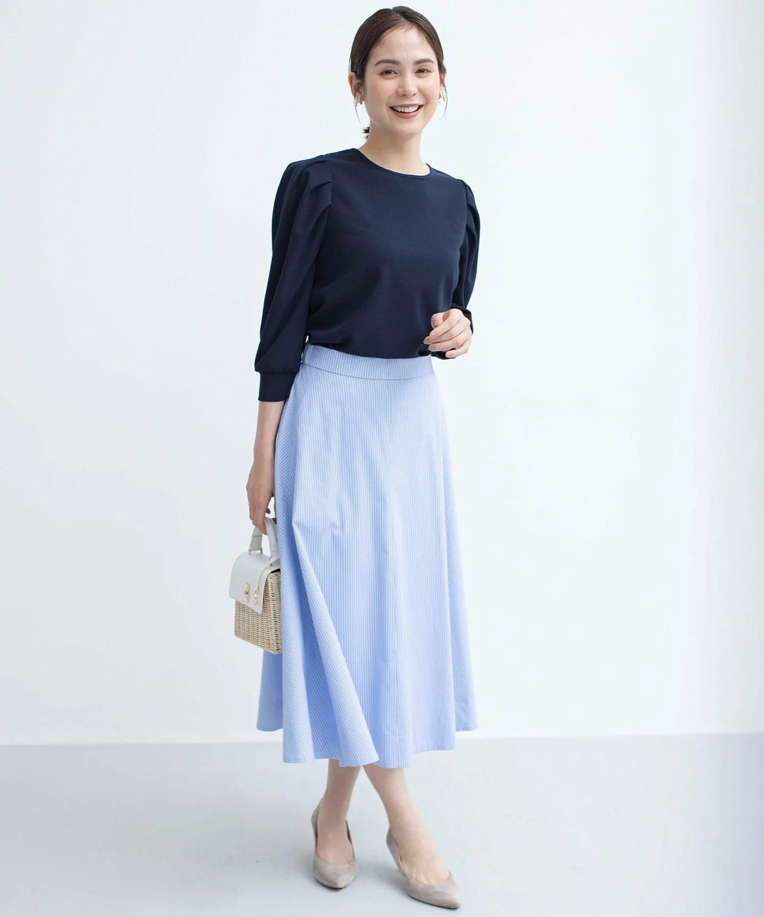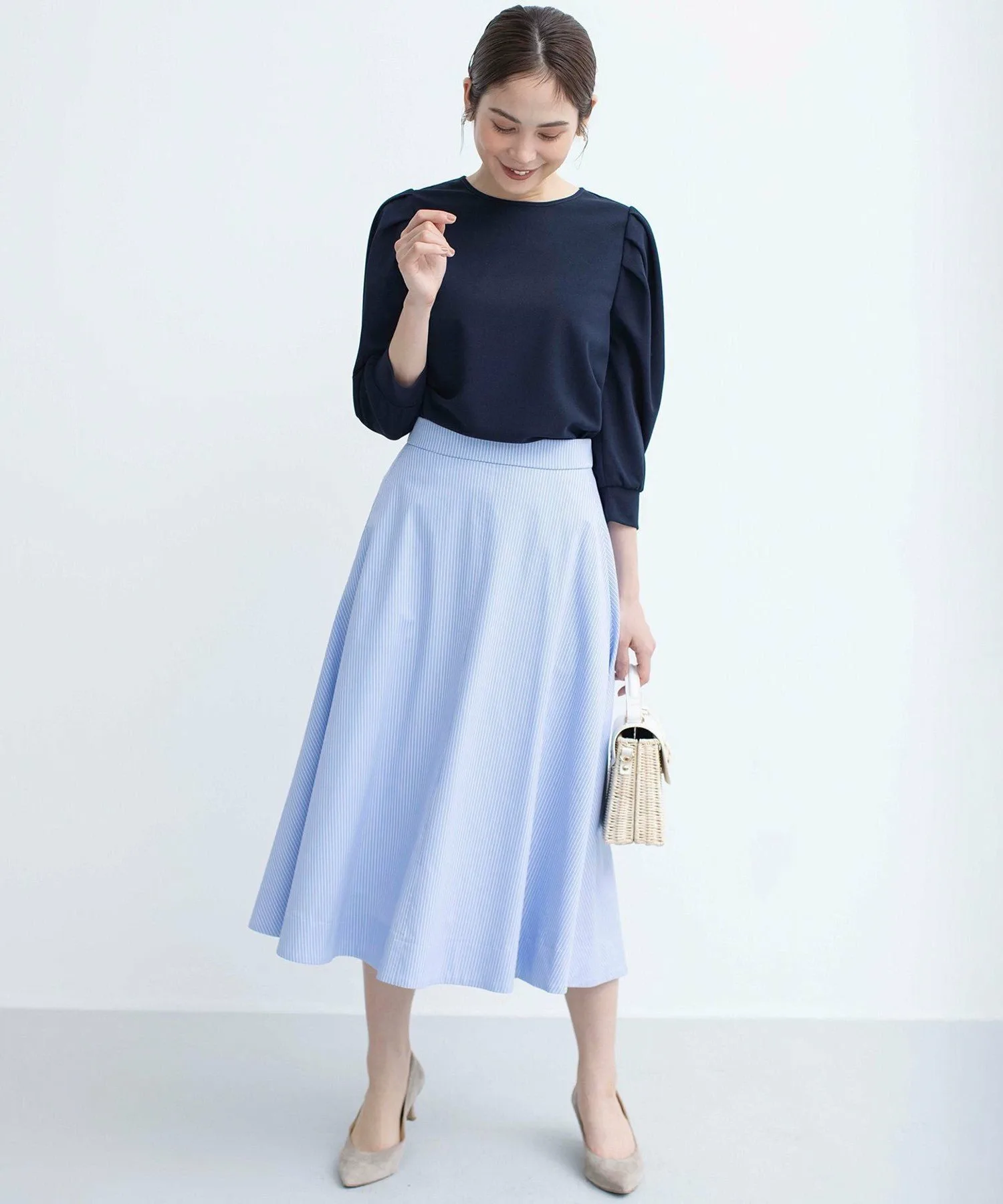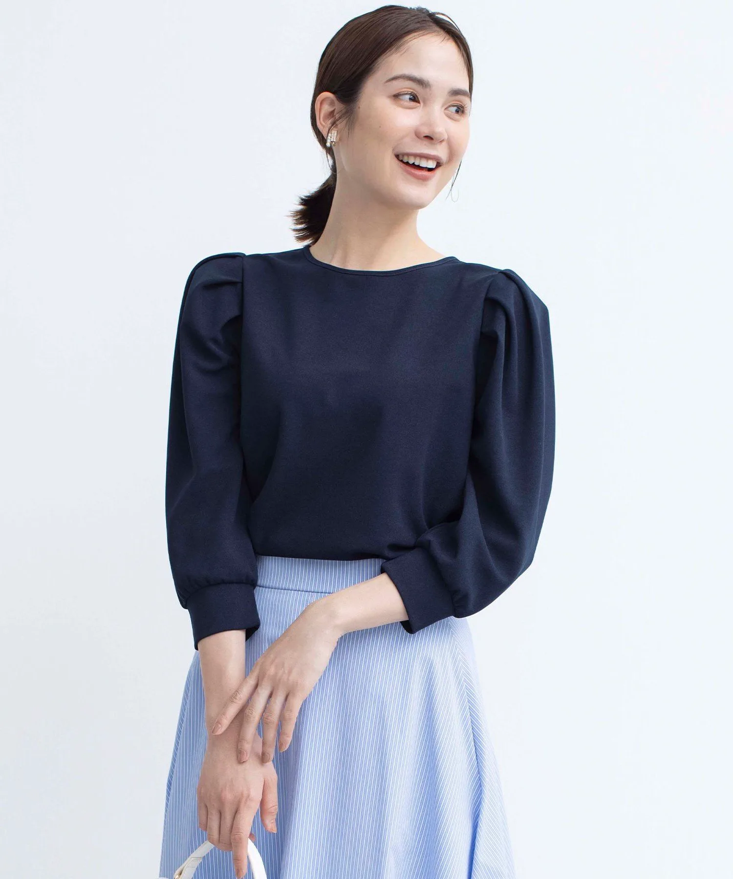 Дизайн: Элегантный топ, напоминающий блузку, со складками на плечах, которые добавляют объем и визуально сужают манжеты. Подвернутые манжеты создают естественный объем рукавов, что делает его универсальным вариантом для любого сезона. Розово-бежевый цвет дополнен черной отделкой, чтобы не выглядеть слишком приторно, добавляя нотку гламура. Цвета слоновой кости и темно-синий сочетаются по цветовой гамме, что позволяет легко носить их под жакетами и кардиганами.