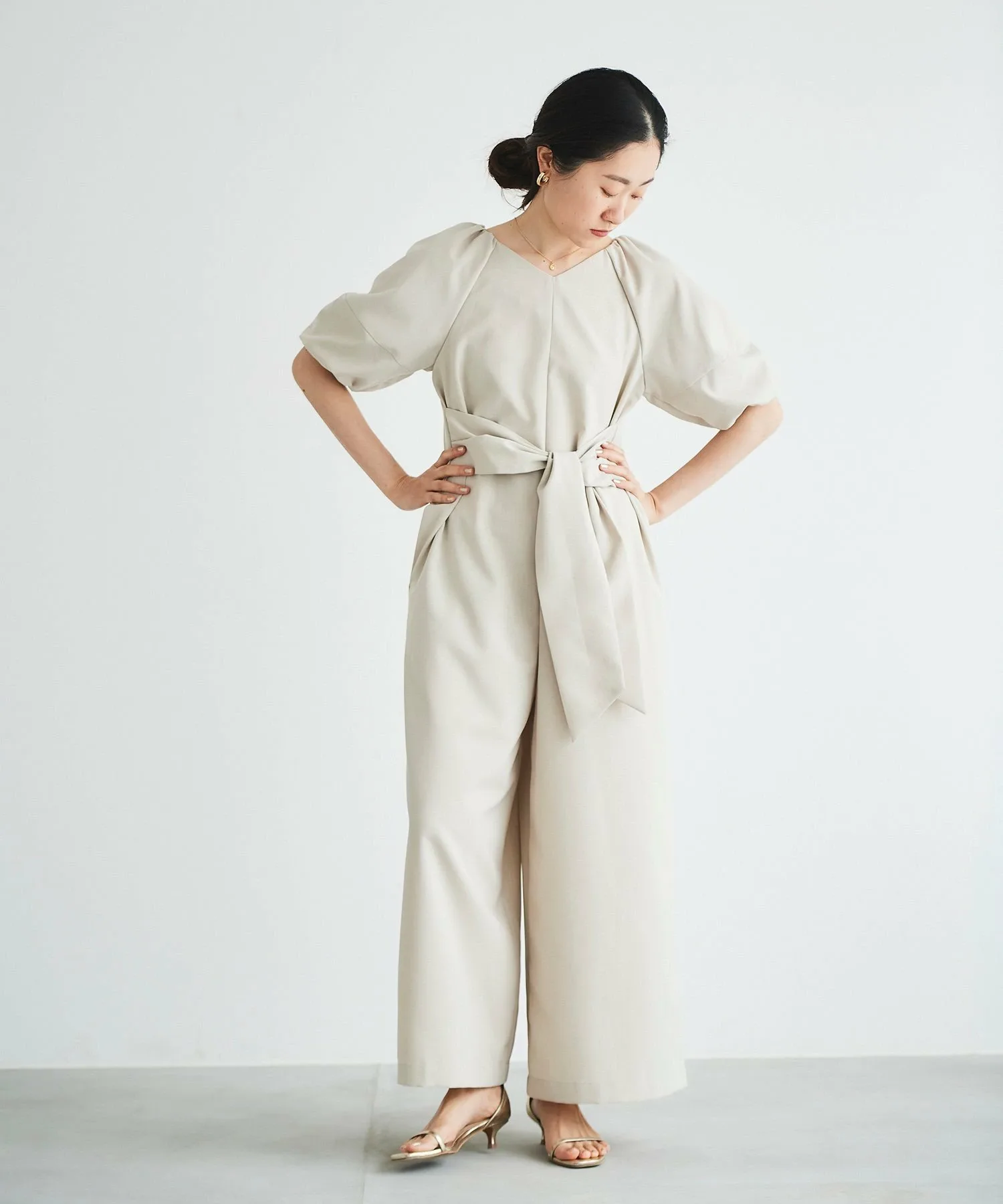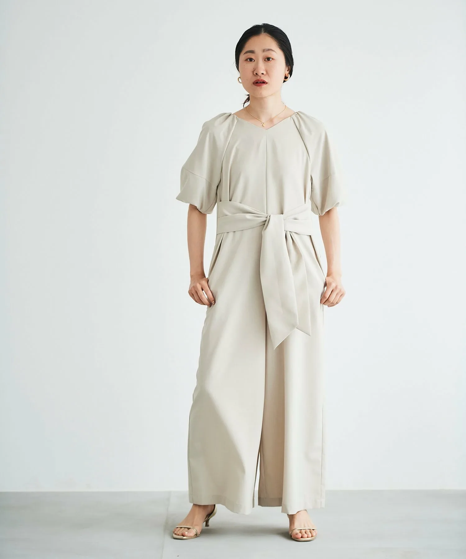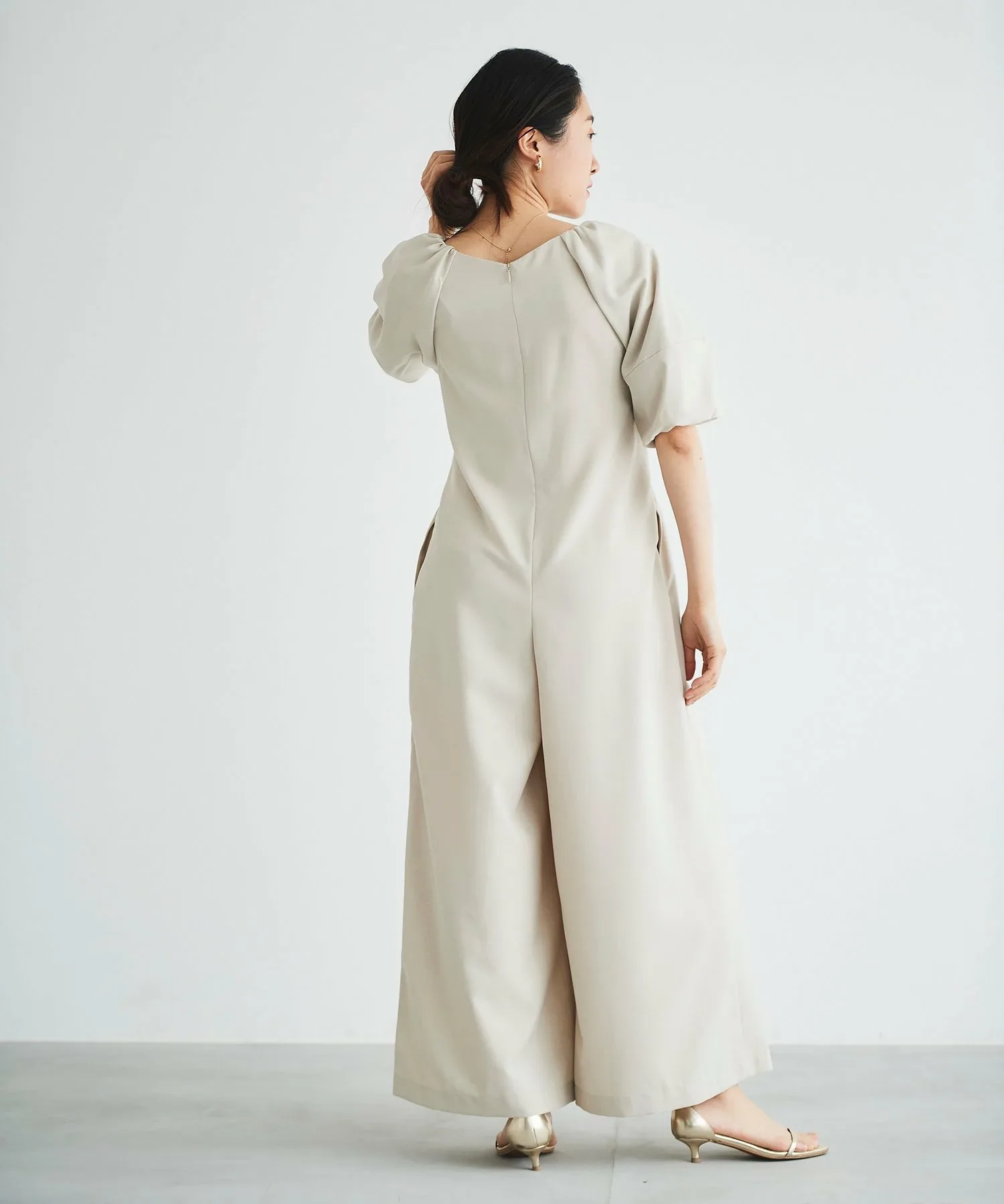 Изготовлен из легкой, гладкой, тонкой ткани с легким блеском, этот комбинезон излучает утонченность.