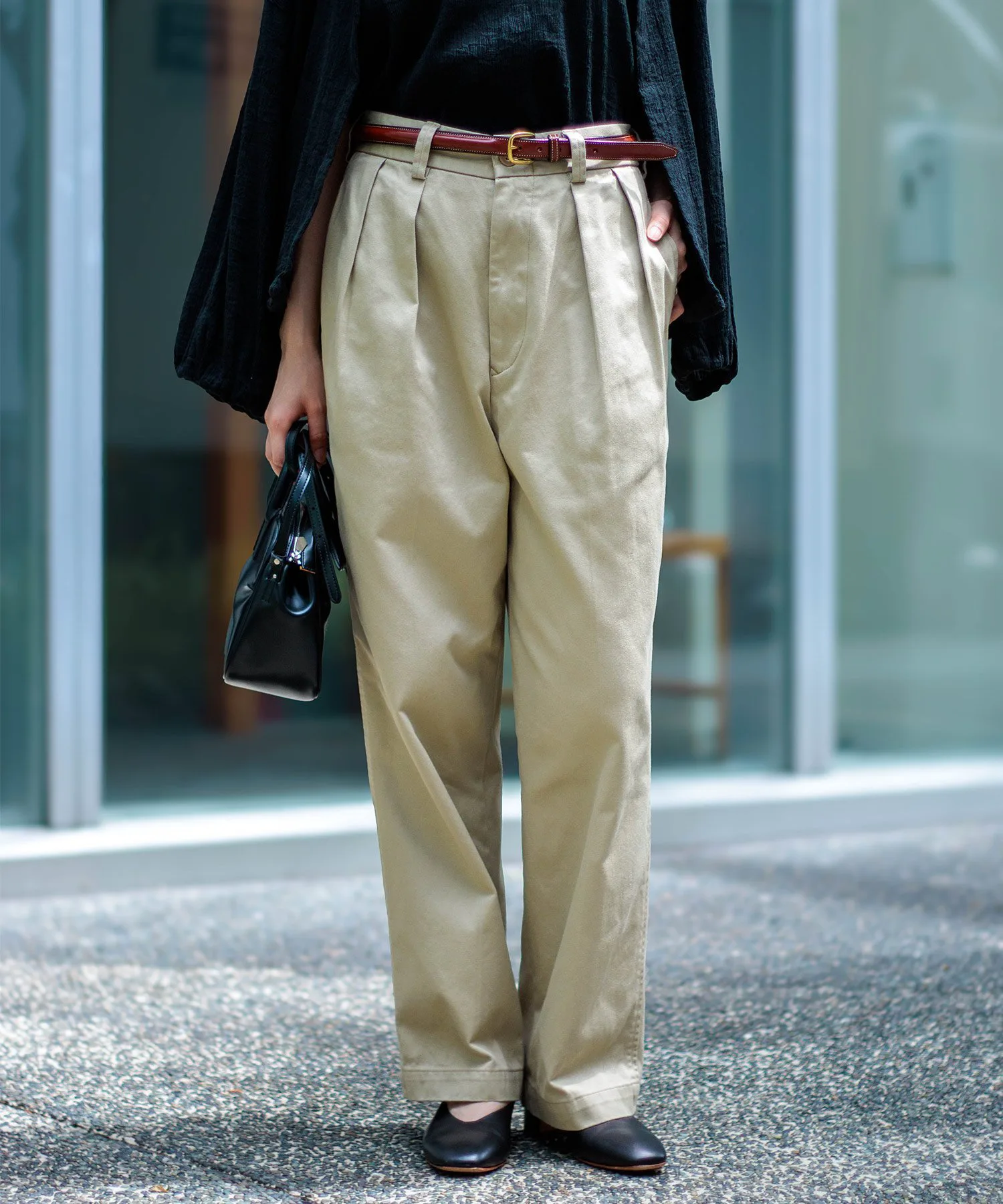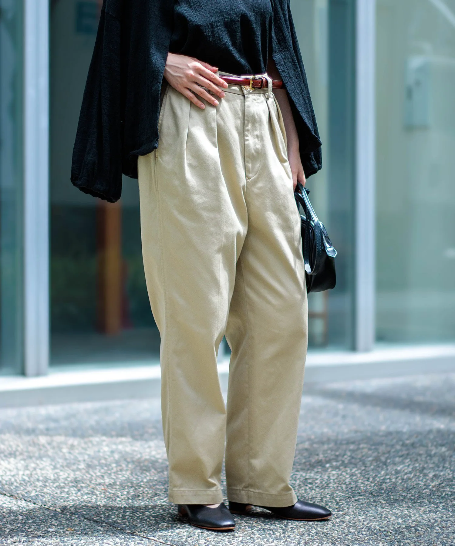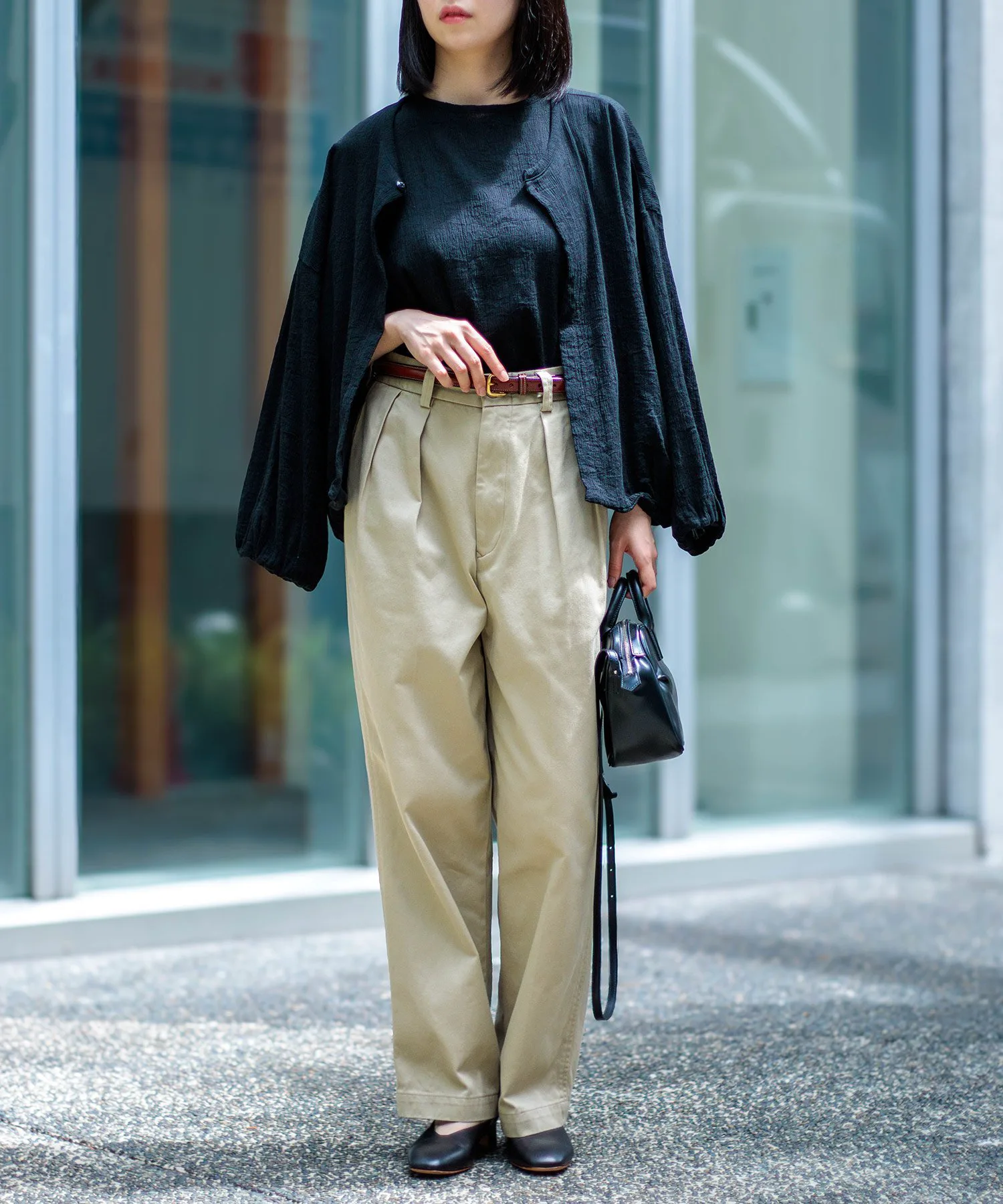 ◇ Отзыв о ношенииРычаг 160 см/Размер MДлина достаточно большая, чтобы закрыть пятку, а умеренно свободный пояс можно отрегулировать с помощью ремня. Хотя у него две складки, ткань не стягивает и удобна в носке.Также доступен в различных приглушенных цветах, идеально подходящих для осени и зимы. ◎