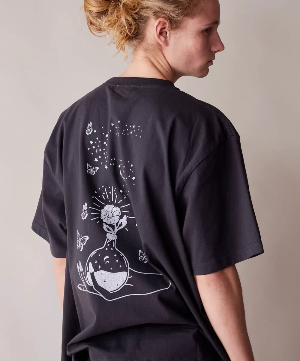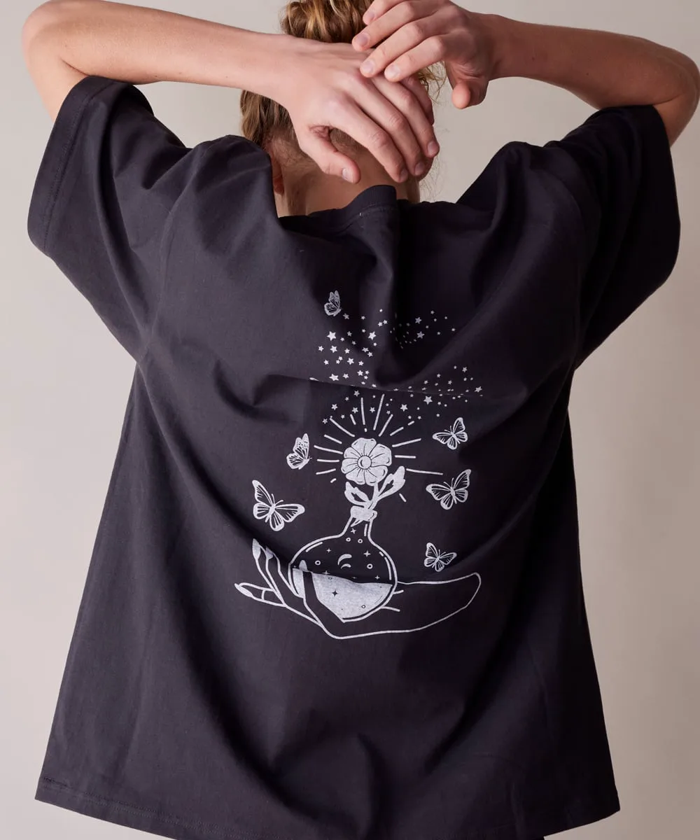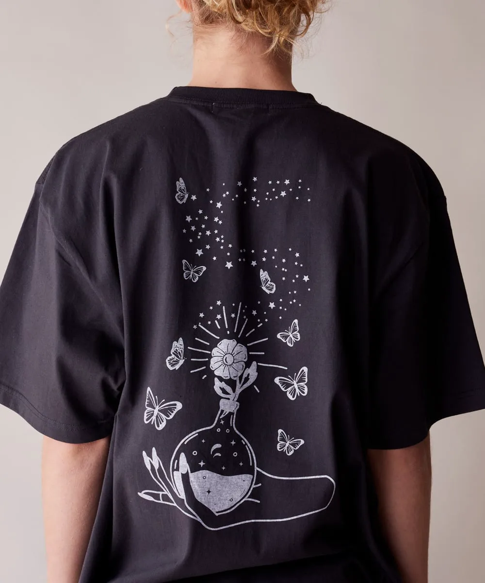 Фантастический шелковый принт на спине привлекает внимание: цветы, распускающиеся из флакона на ладони, и фантастический рисунок танцующих звезд и бабочек.