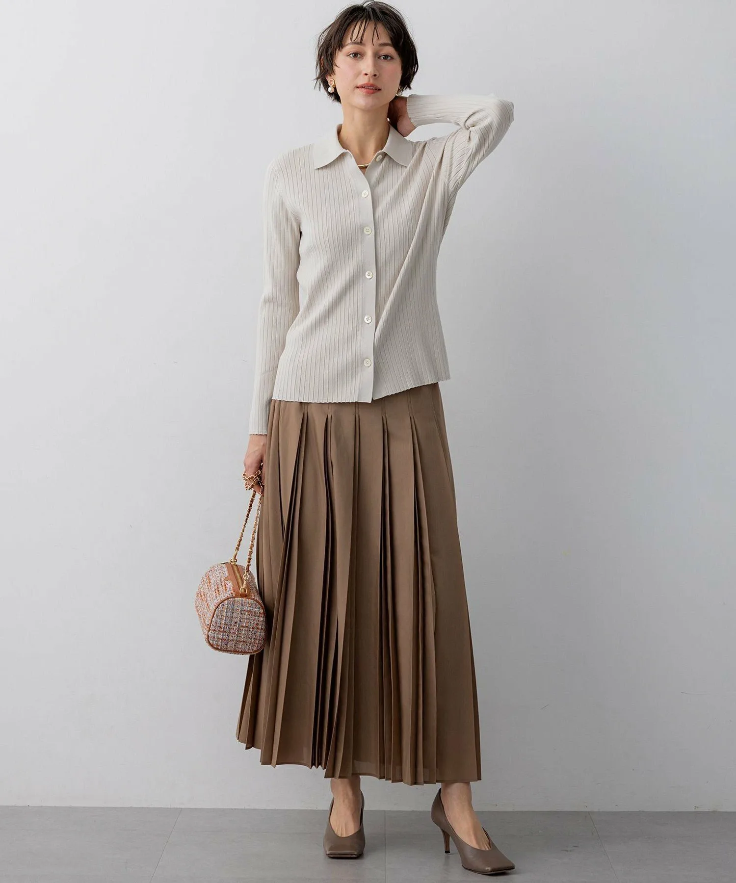 Этот современный трикотажный поло отличается обтекаемым вертикальным эффектом. Широкая резинка позволяет носить его застегнутым на все пуговицы как пуловер или как кардиган. Расстегнув несколько нижних пуговиц, он хорошо сочетается с широкими брюками и объемными юбками, позволяя создавать разнообразные силуэты в сочетании с различными вариантами низа. Этот универсальный предмет гардероба предлагает широкий спектр вариантов стилизации. Доступен в трех цветах: шикарный черный (#005), элегантный и мягкий бежевый (#033) и глубокий, приглушенный темно-коричневый (#035).