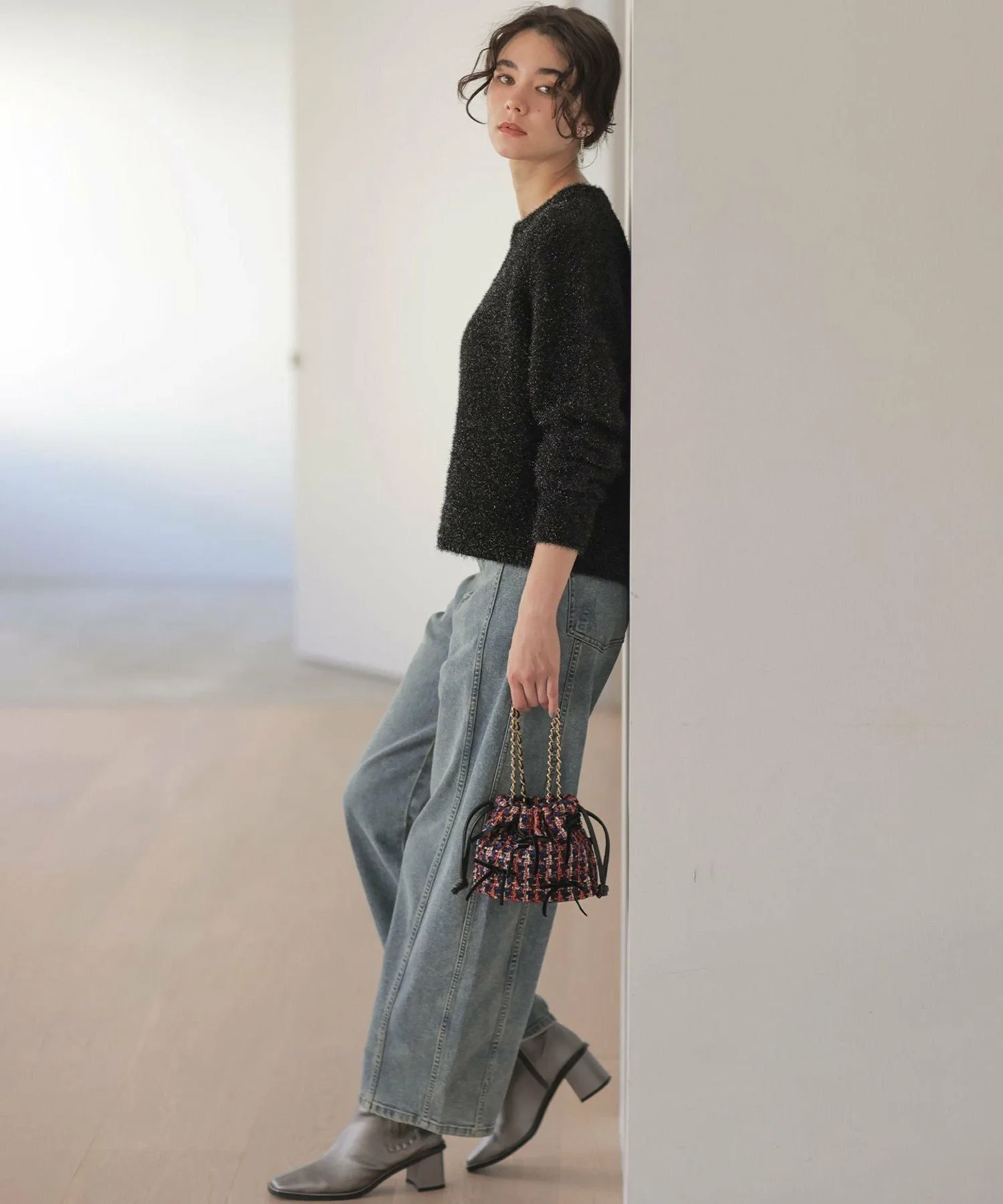 Материал・Этот материал представляет собой смесь фактурного ворса и блесток. Он отличается пышным объемом и легкостью. ・Материал имеет привлекательную металлическую, мерцающую поверхность.