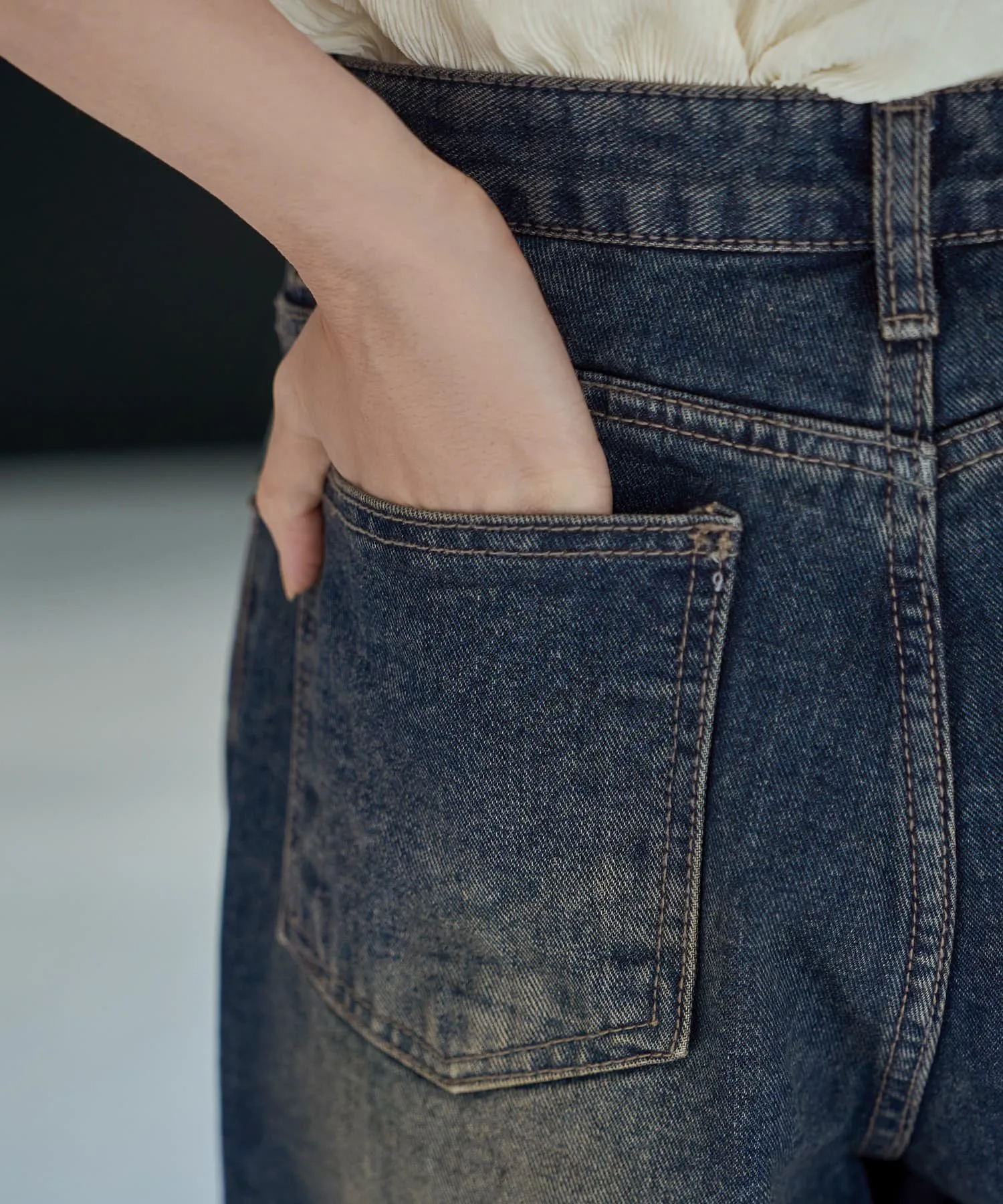 Эти модные джинсы с широкими штанинами и облегающим силуэтом получили более изысканный вид. Нежный глубокий синий цвет с легким выцветанием создает утонченный образ, напоминающий джинсы из винтажного магазина.
