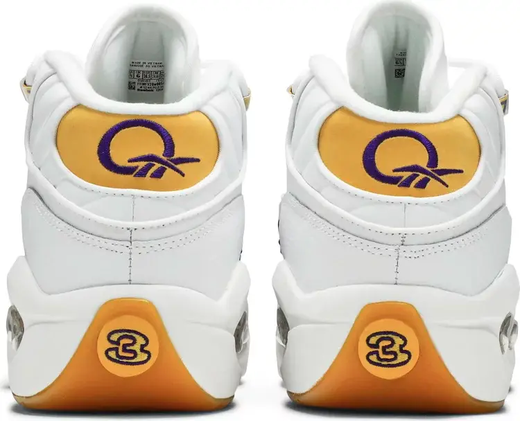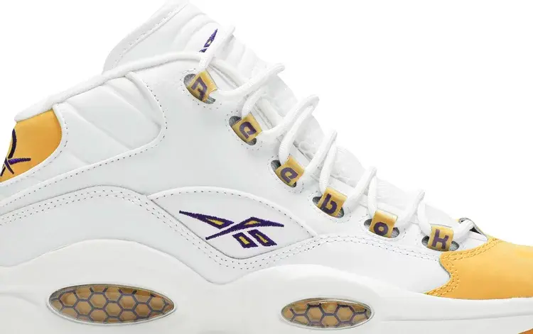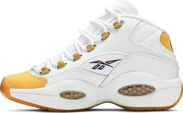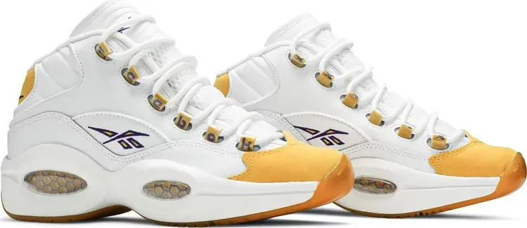 Созданные для школьников, Reebok Question Mid GS «Yellow Toe» основаны на цветовой гамме PE, которую Коби Брайант классно носил в сезоне НБА 2002–2003 годов, который запомнился спортсмену как период свободы действий в кроссовках. Дебютные фирменные кроссовки Аллена Айверсона неуместно одеты в фирменные оттенки «Лейкерс», подчеркнутые верхом из белой помятой кожи с желтым кожаным носком. Контрастные фиолетовые акценты нанесены на фирменные элементы кроссовок, включая вышитые логотипы Vector и надпись «Reebok» на проушинах из ТПУ.