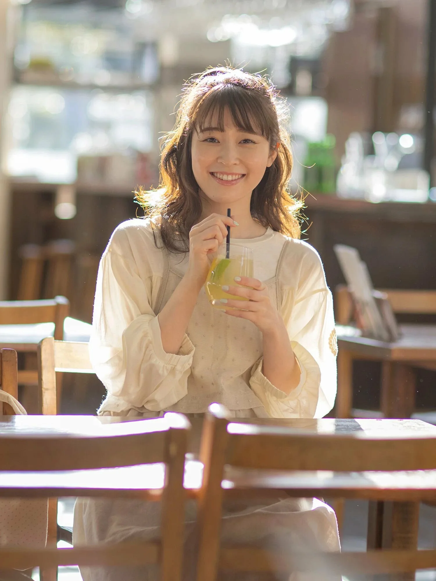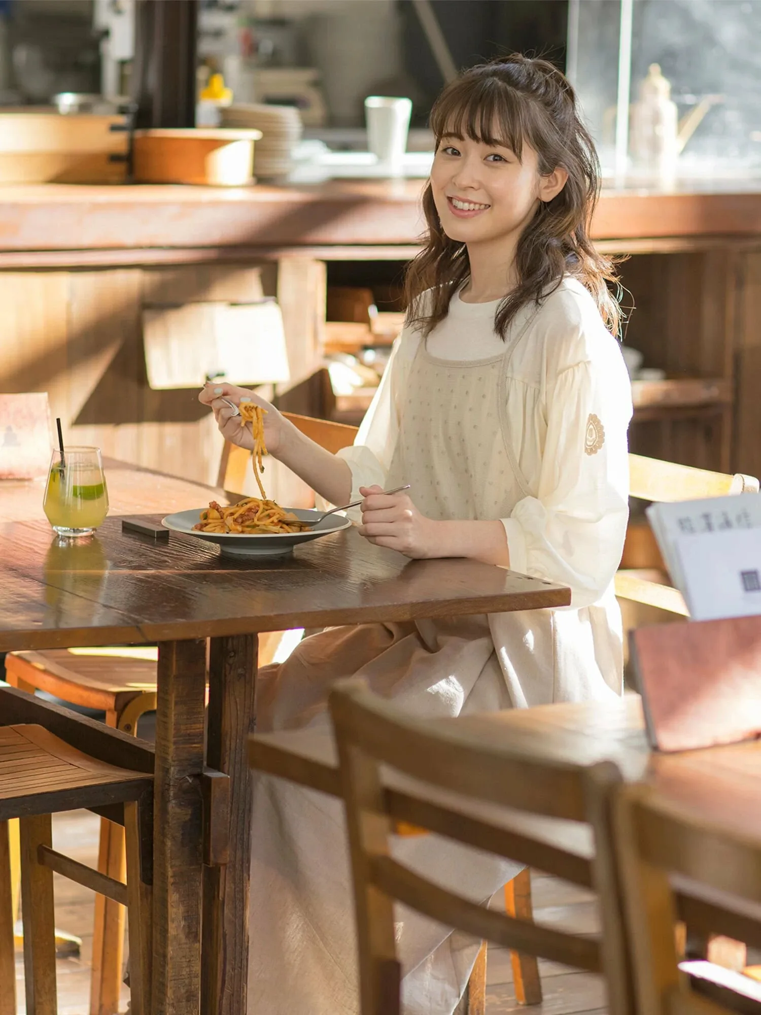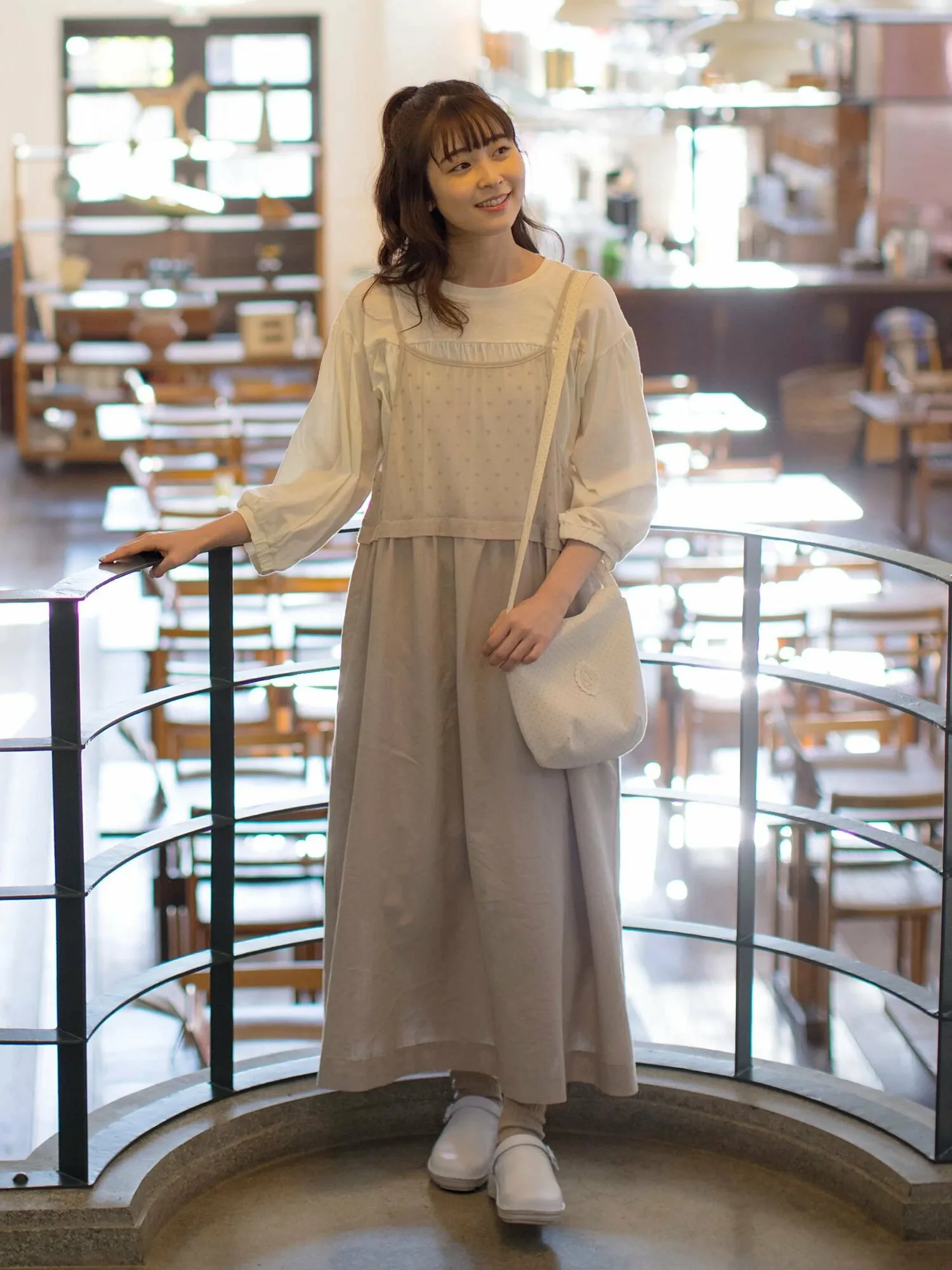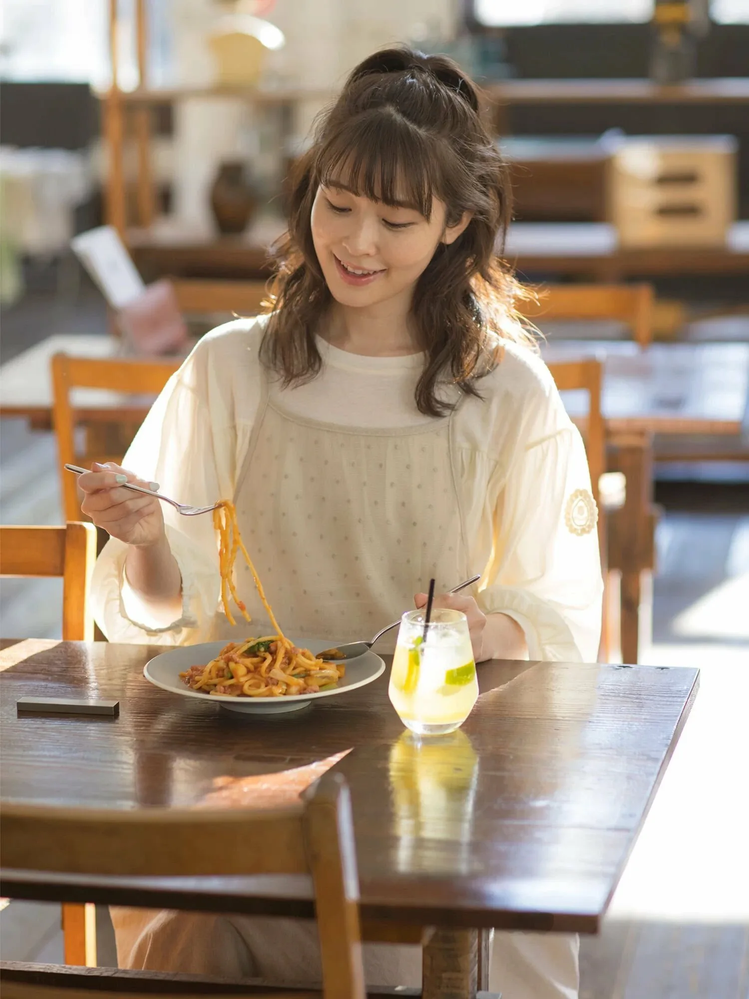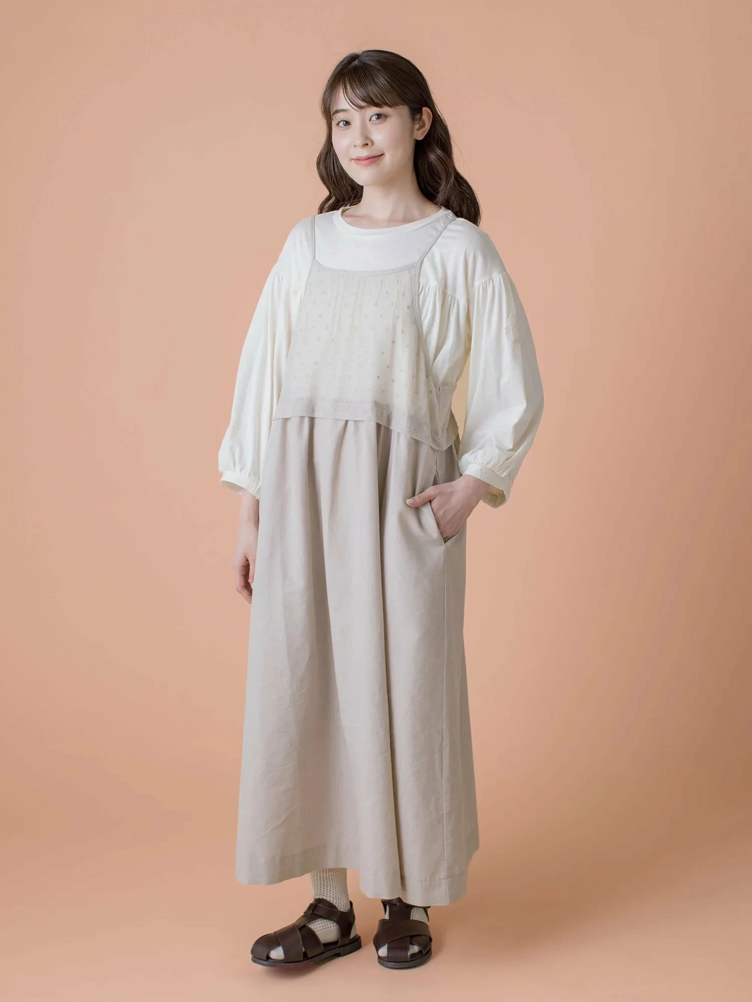 Внутренний топ имеет пышные рукава с кружевным акцентом. Сборки на расклешенной юбке также сами по себе выглядят эффектно. ◎