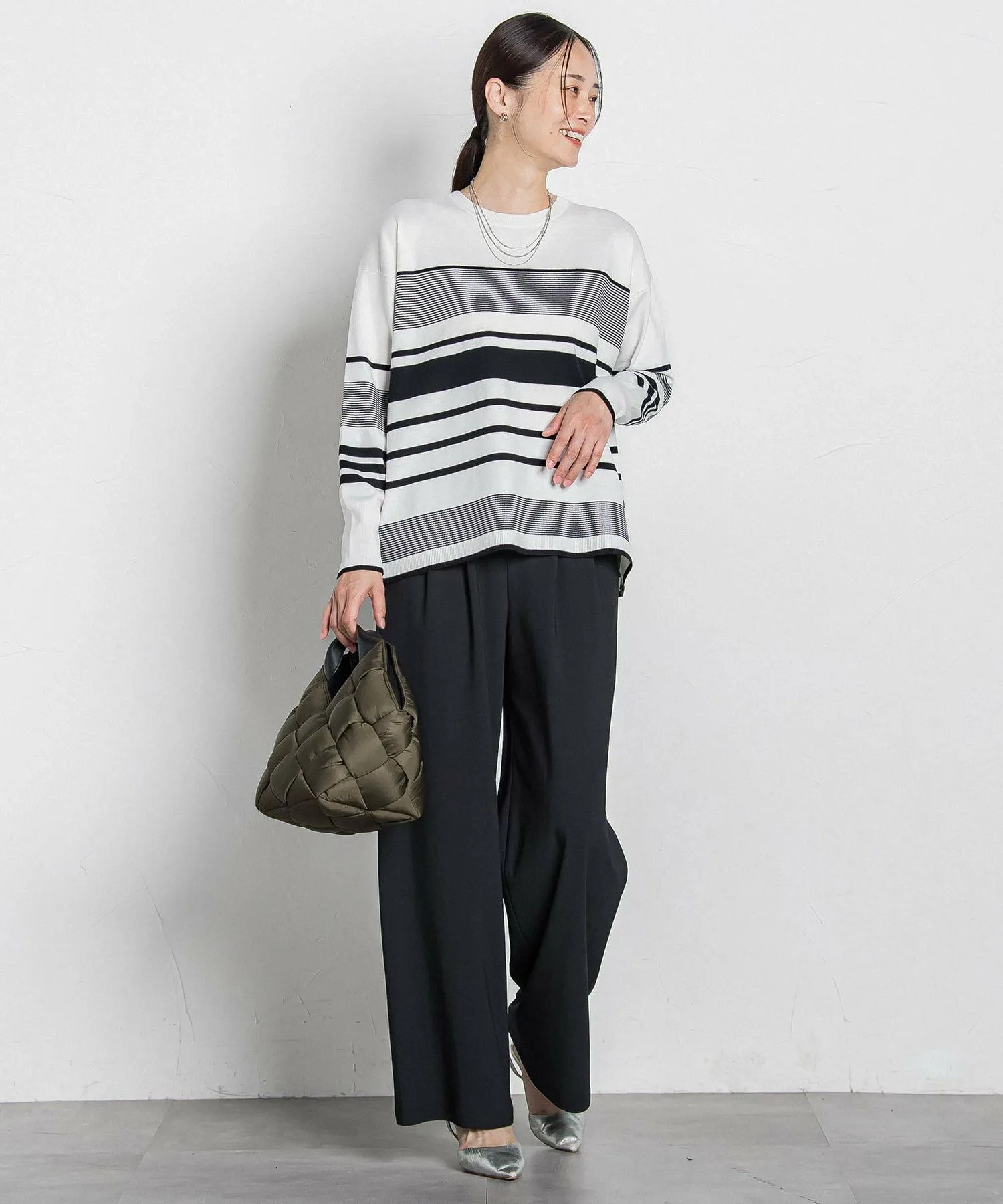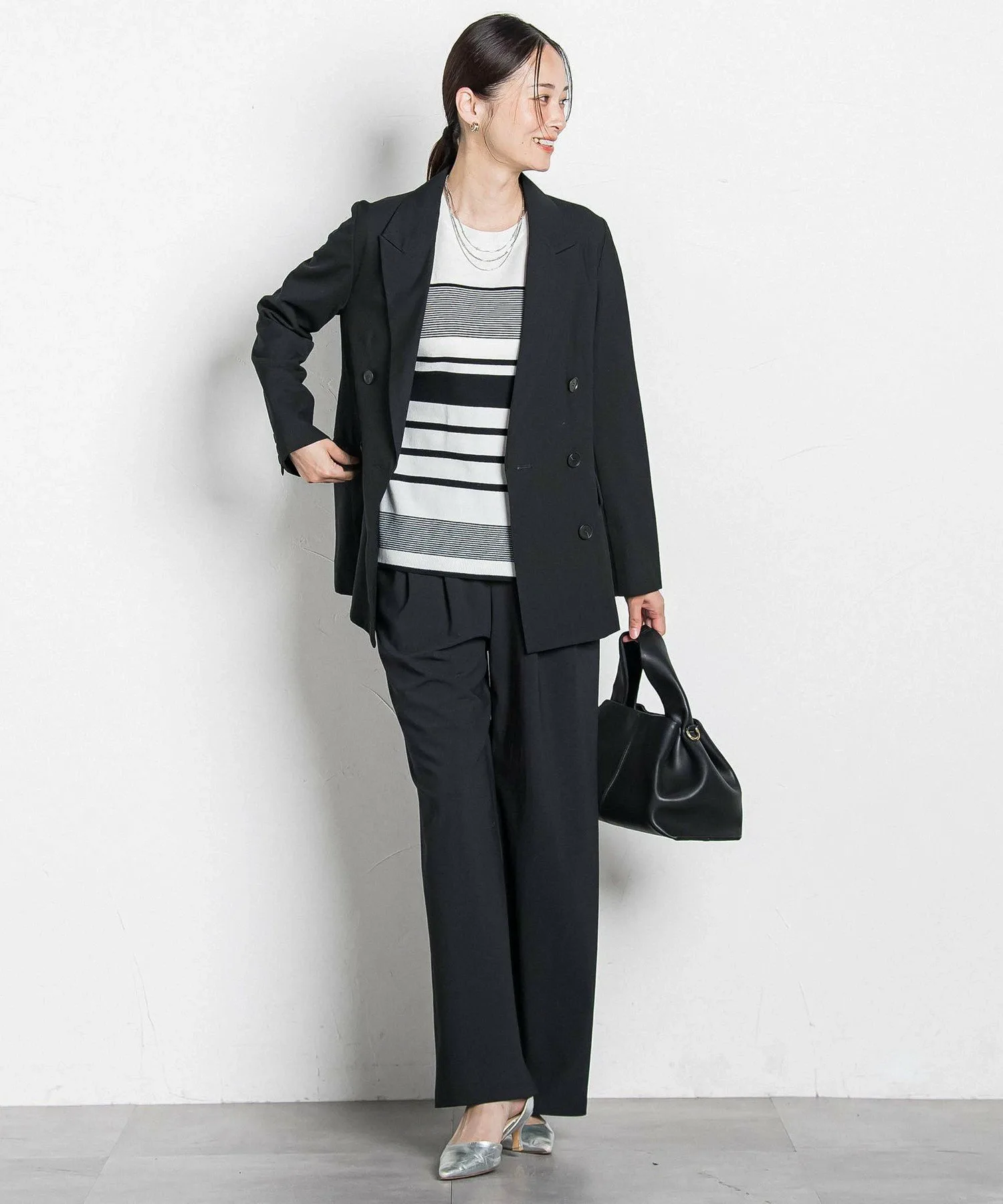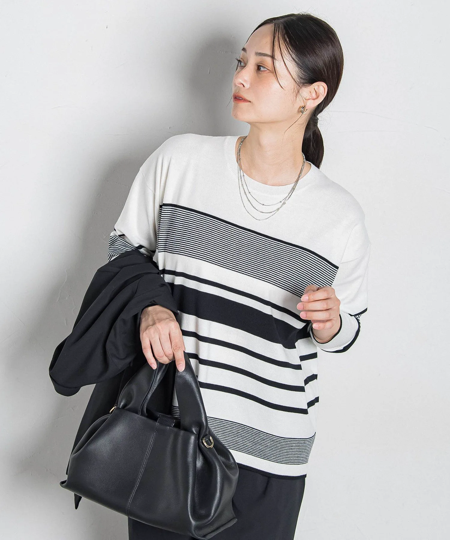 Спущенные плечи и свободный силуэт создают расслабленный, но при этом лаконичный образ.