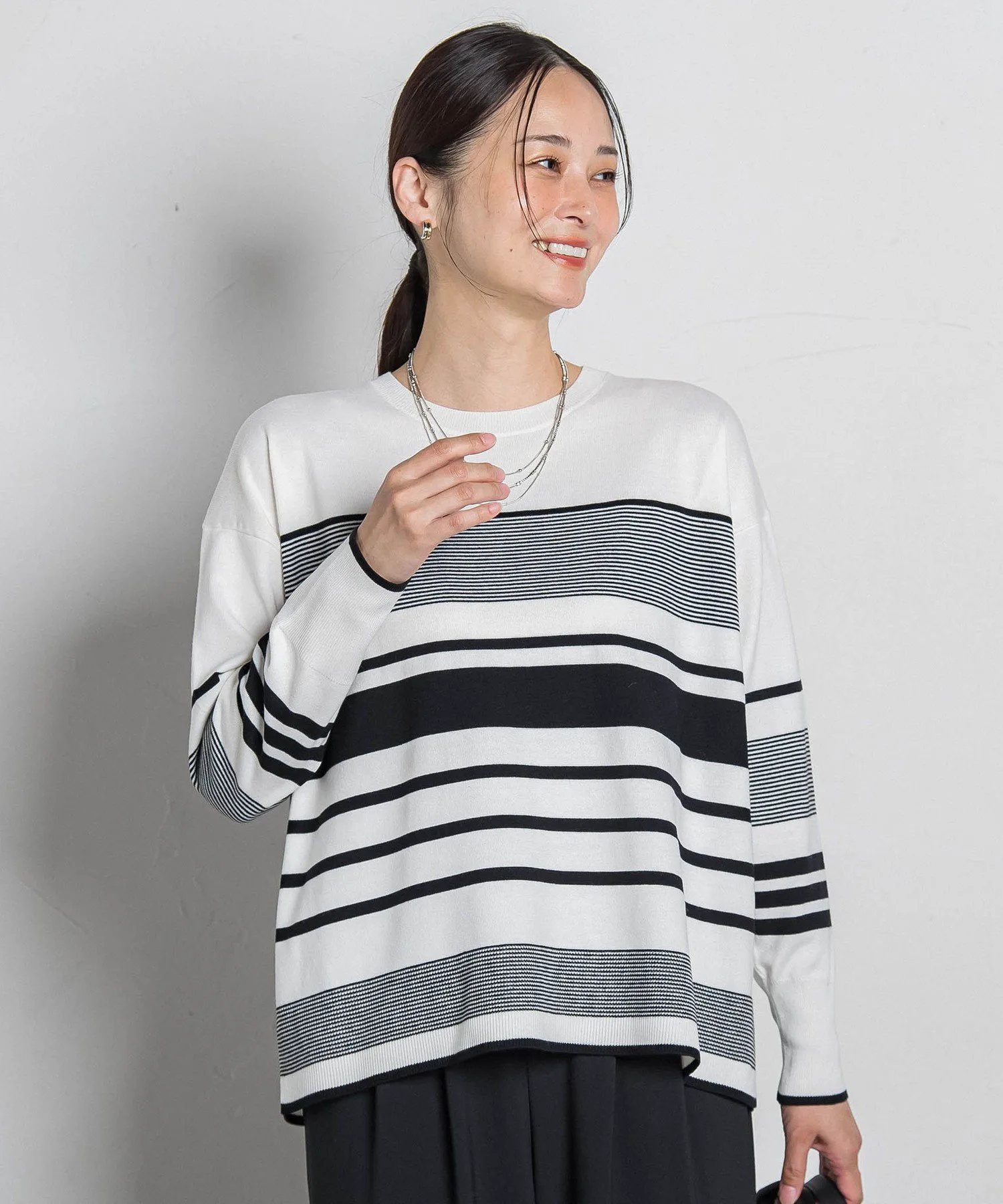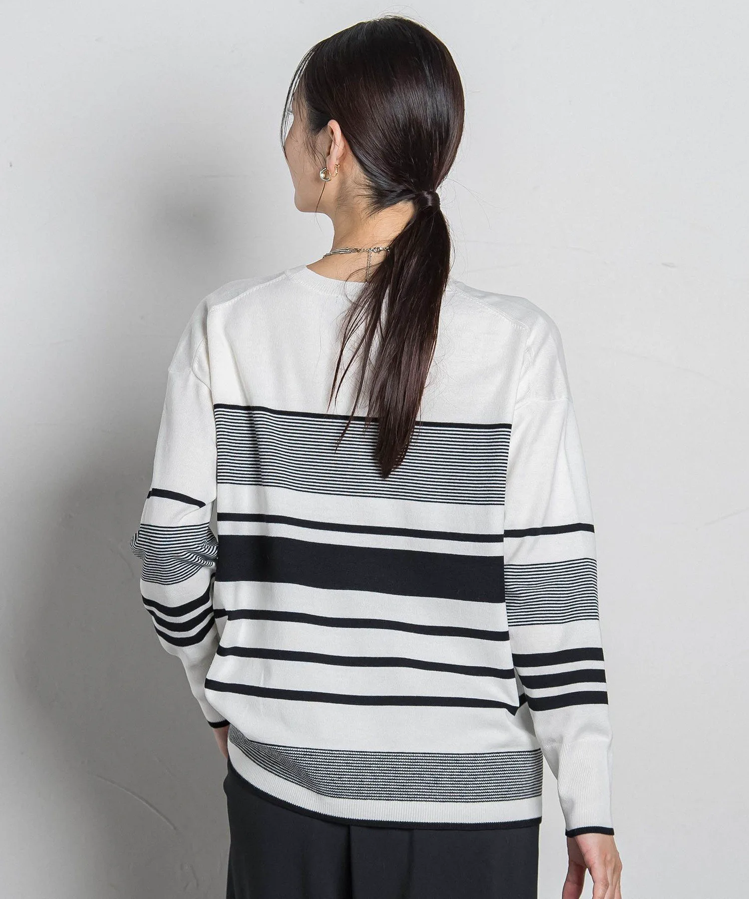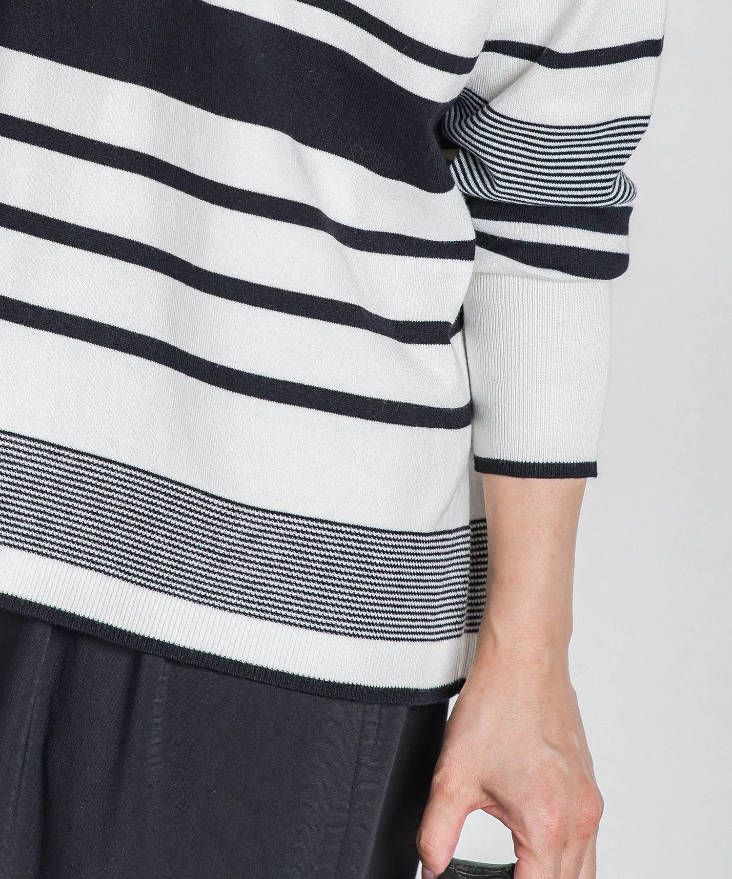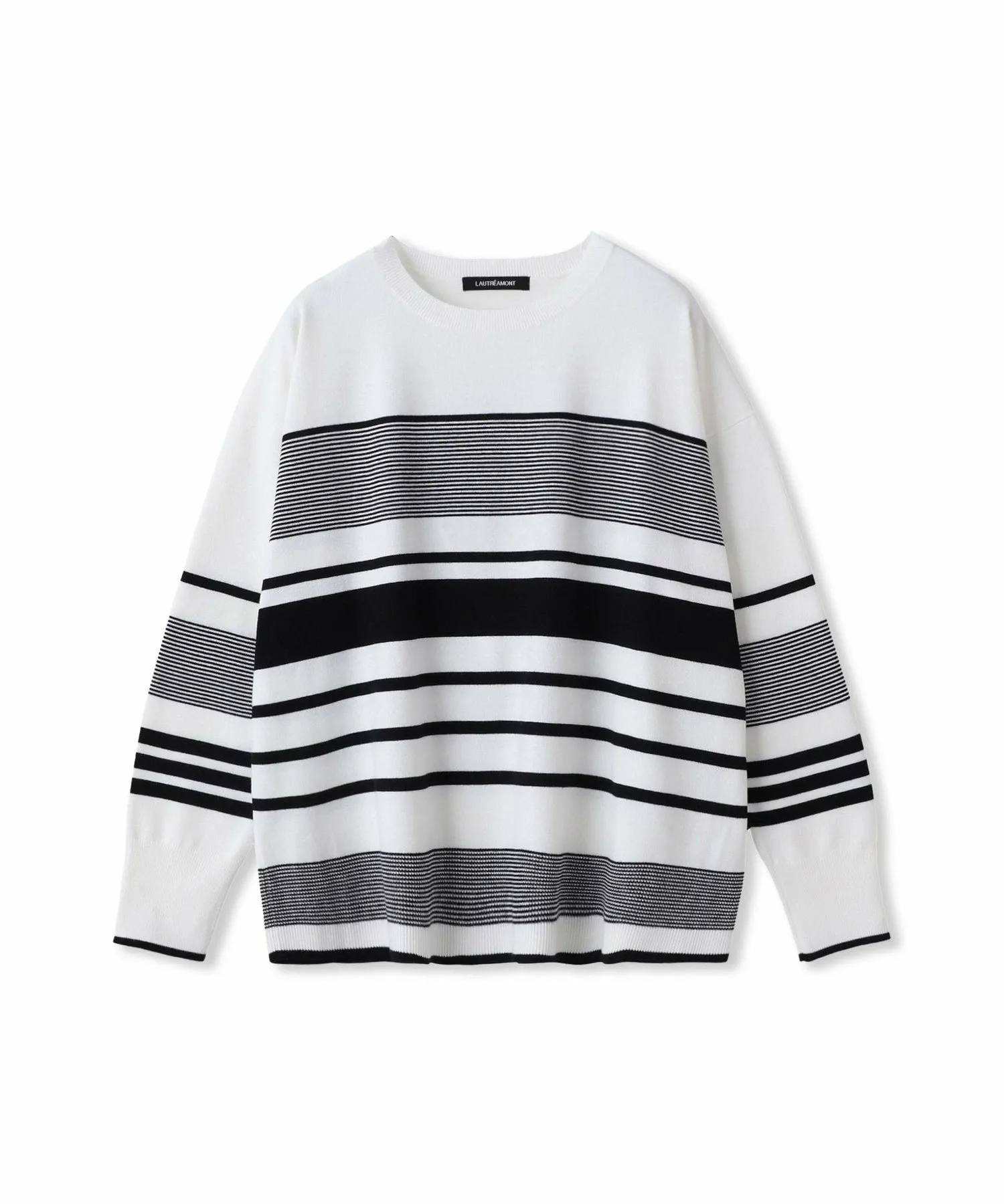 Этот вязаный пуловер украшен полосатым узором, расположенным в произвольном порядке, что добавляет легкости повседневному стилю для взрослых.
