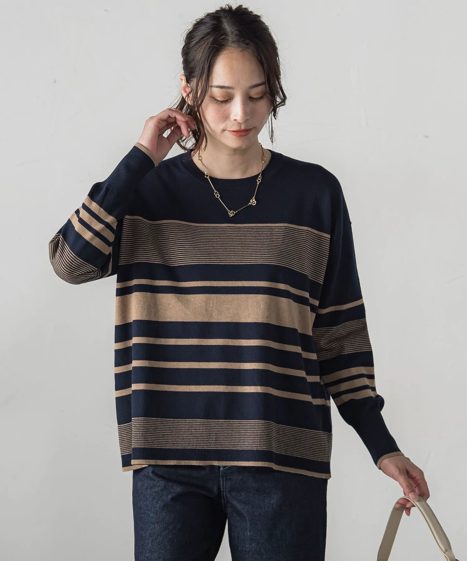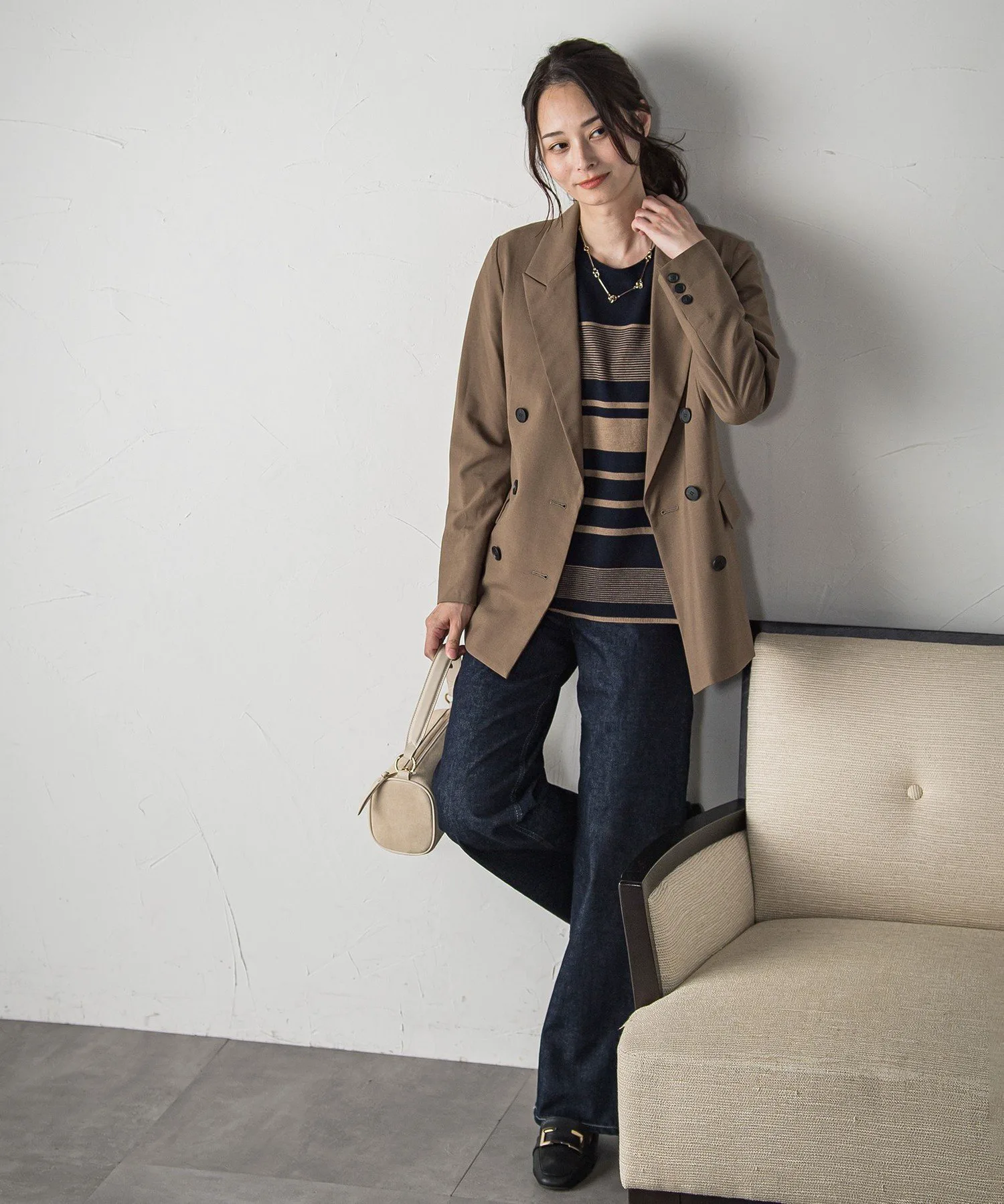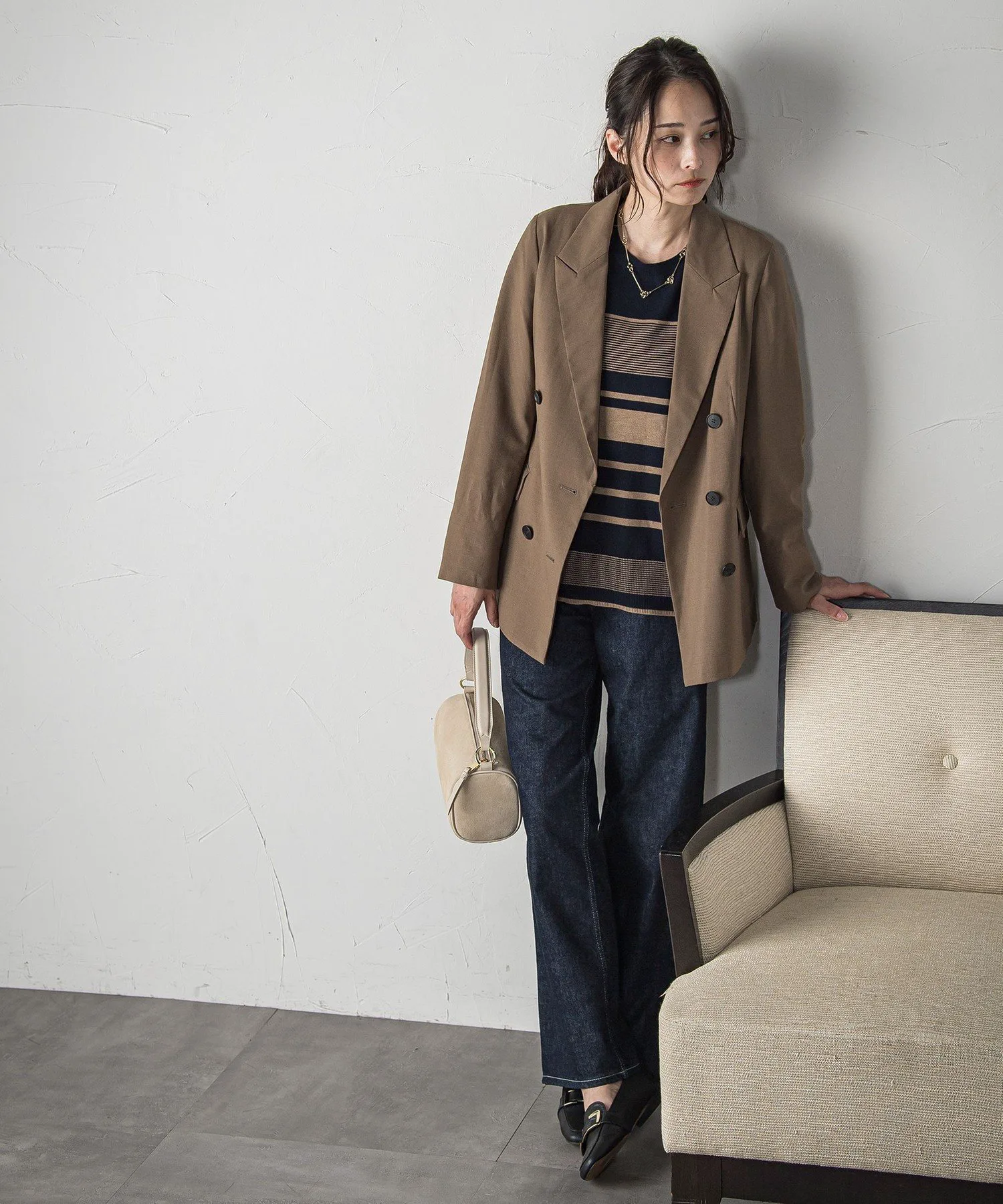 Спущенные плечи и свободный силуэт создают расслабленный, но при этом лаконичный образ.