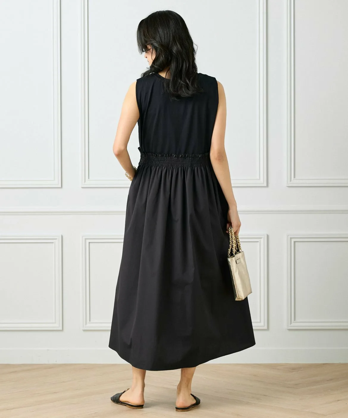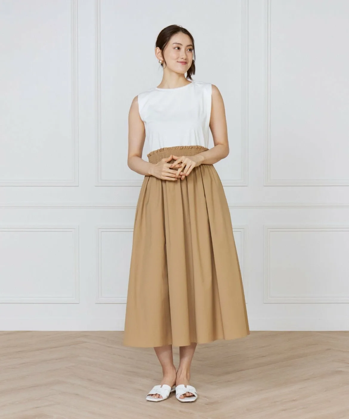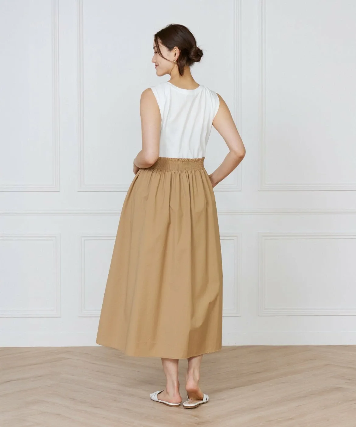 Это платье, напоминающее сочетание футболки и юбки, сшито из ткани с чистым, четким кроем, что позволяет избежать излишней повседневности. Эластичный пояс со сборками делает его удобным и комфортным в носке. Вы можете изменить образ, сочетая его с аксессуарами и обувью. И верх, и низ выполнены из материалов, не требующих особого ухода, что делает его идеальным вариантом для летних путешествий.