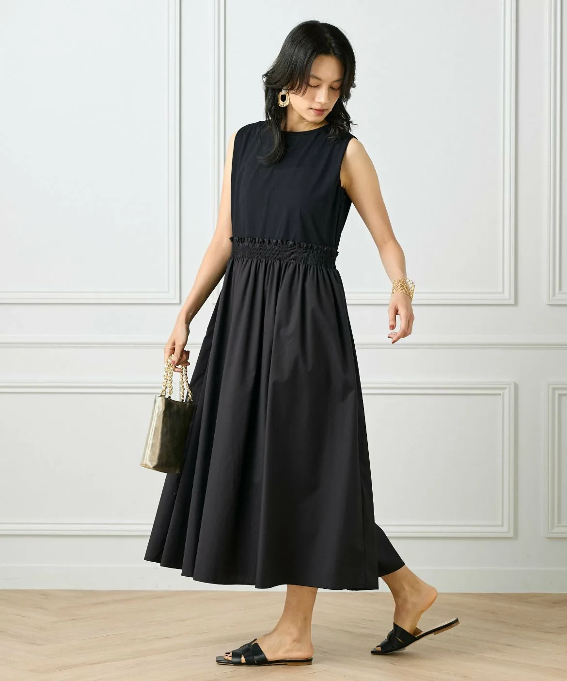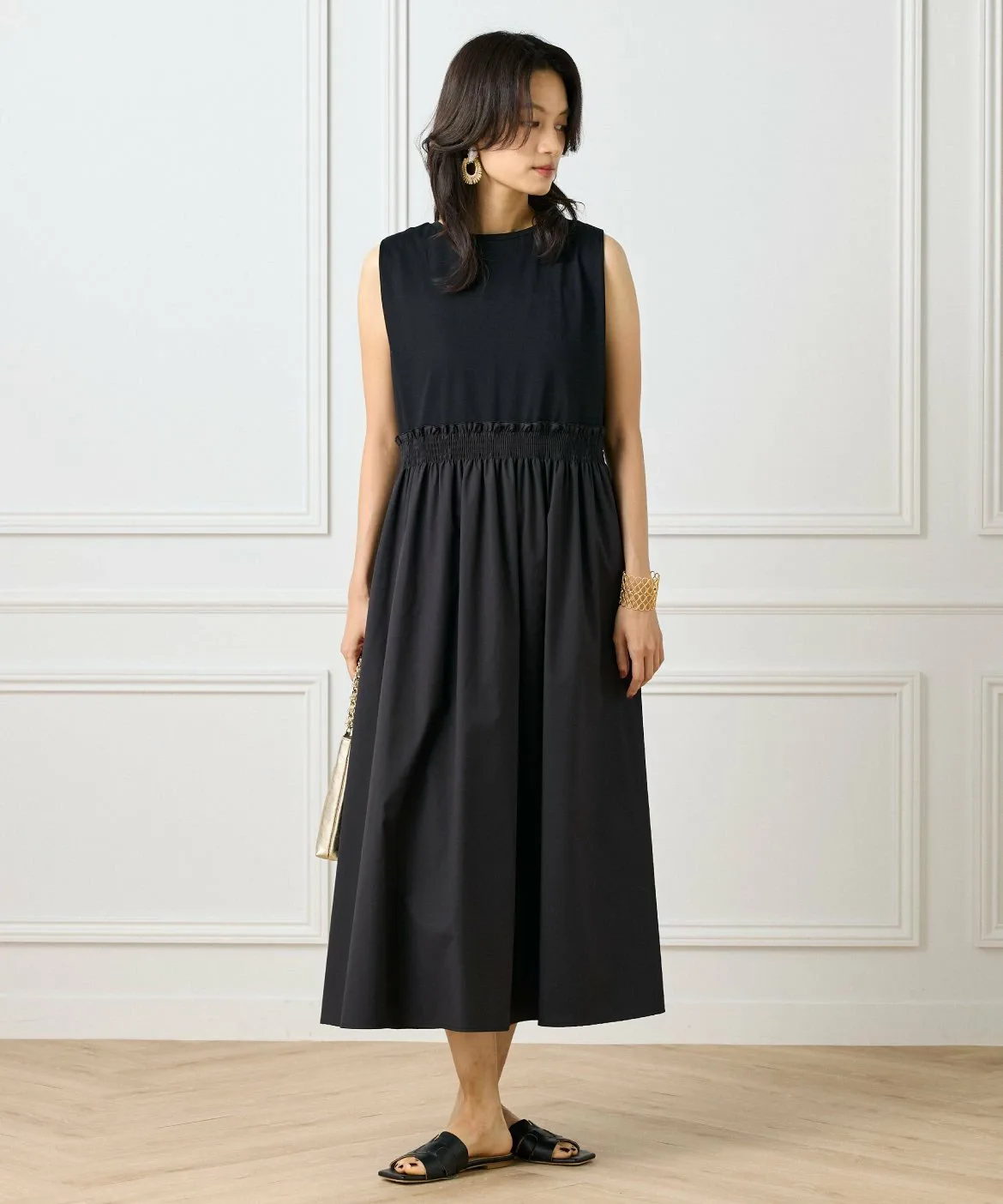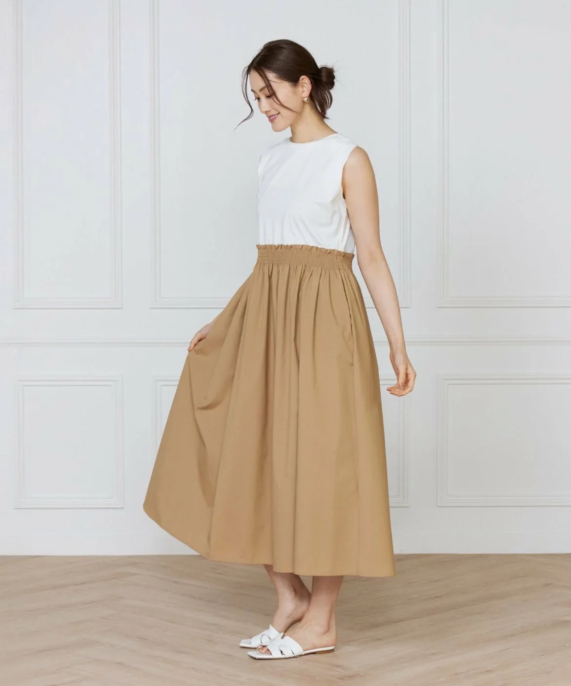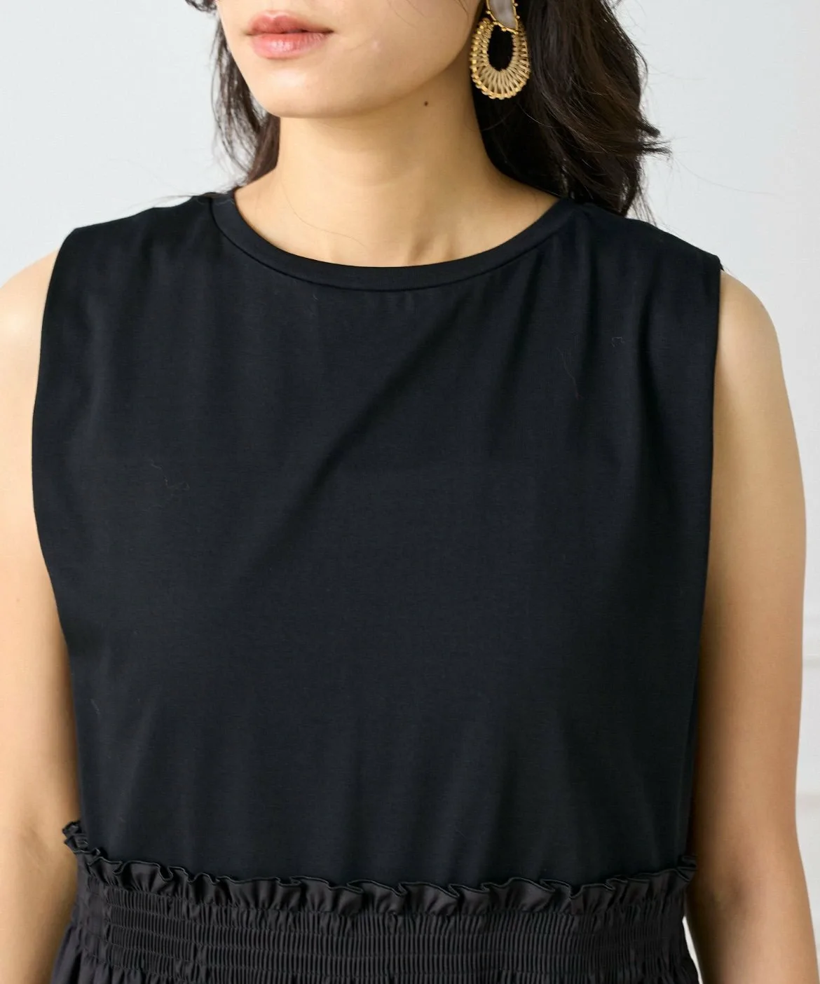 Это платье, напоминающее сочетание футболки и юбки, сшито из ткани с чистым, четким кроем, что позволяет избежать излишней повседневности. Эластичный пояс со сборками делает его удобным и комфортным в носке. Вы можете изменить образ, сочетая его с аксессуарами и обувью. И верх, и низ выполнены из материалов, не требующих особого ухода, что делает его идеальным вариантом для летних путешествий.