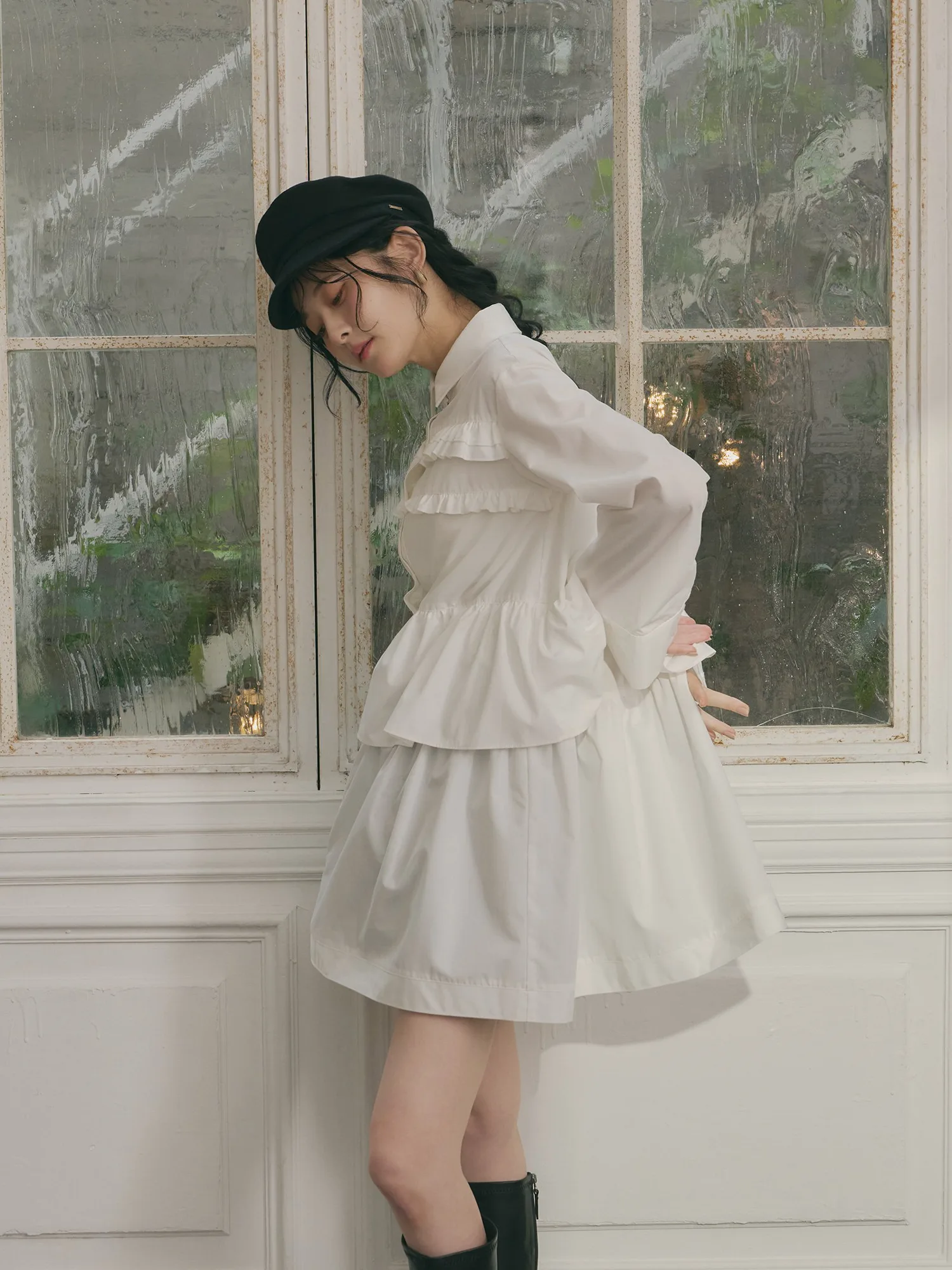 Это платье украшено струящимися оборками и имеет свободную длину туники.