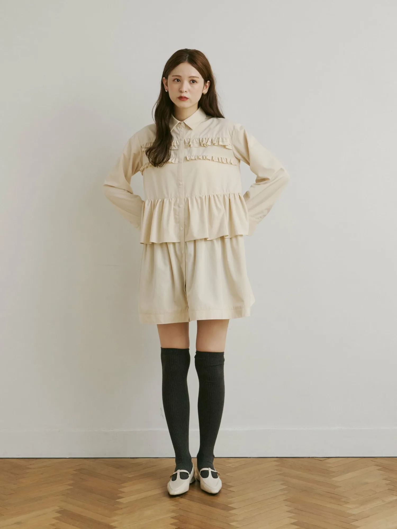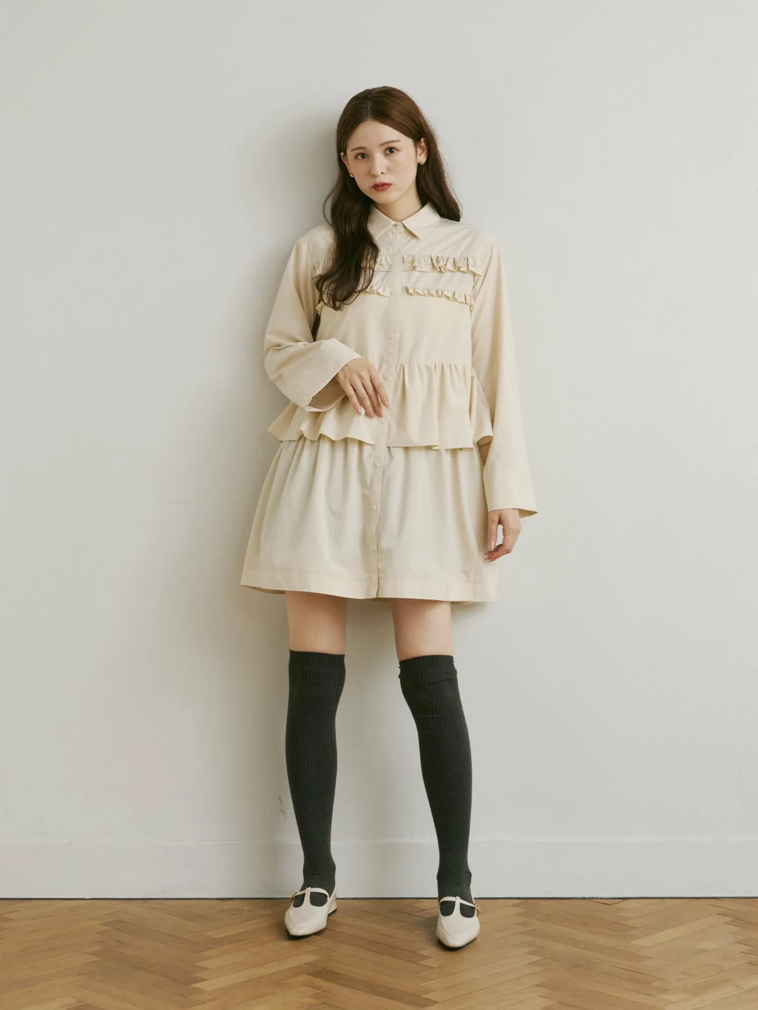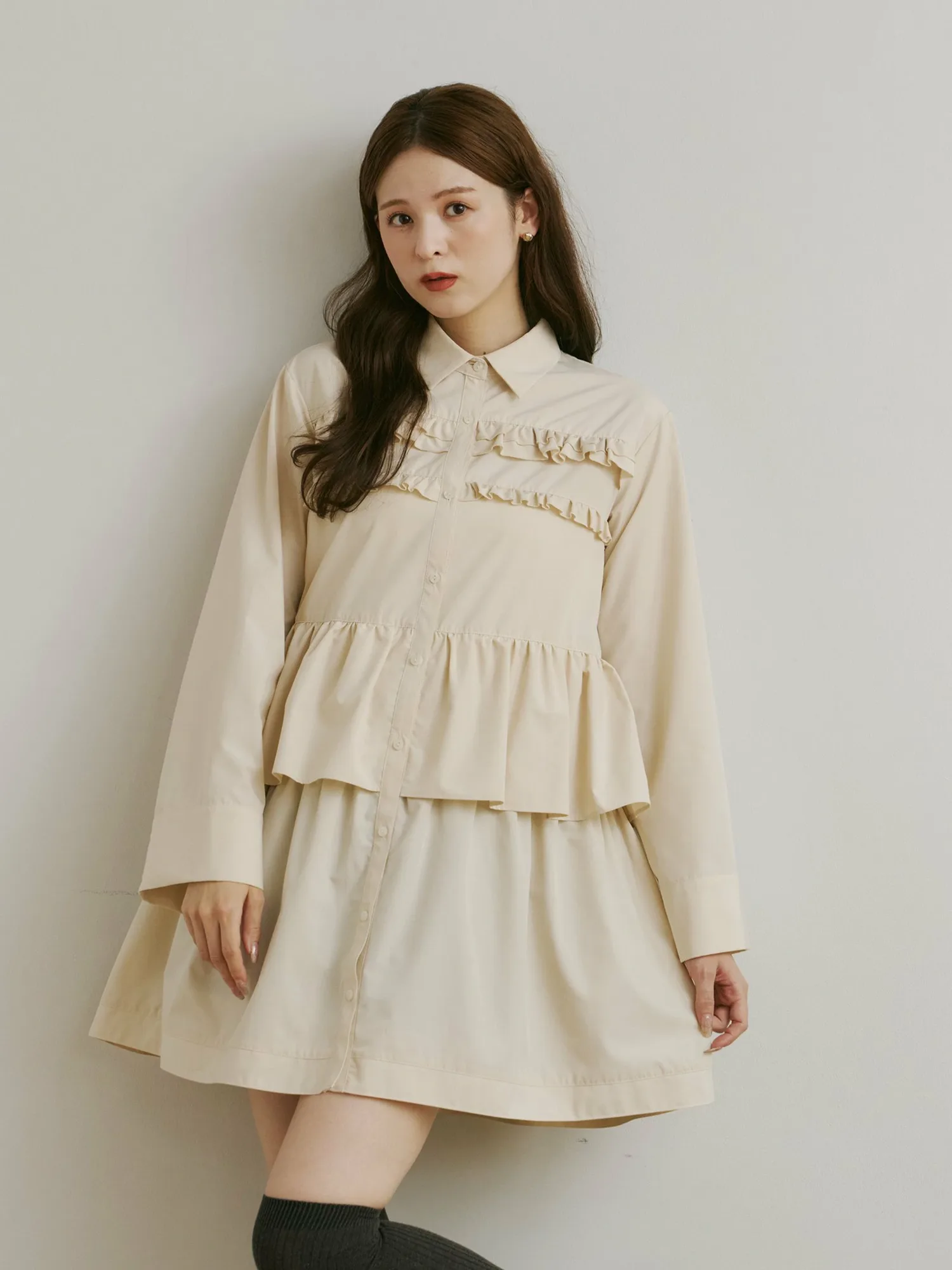 Это платье украшено струящимися оборками и имеет свободную длину туники.