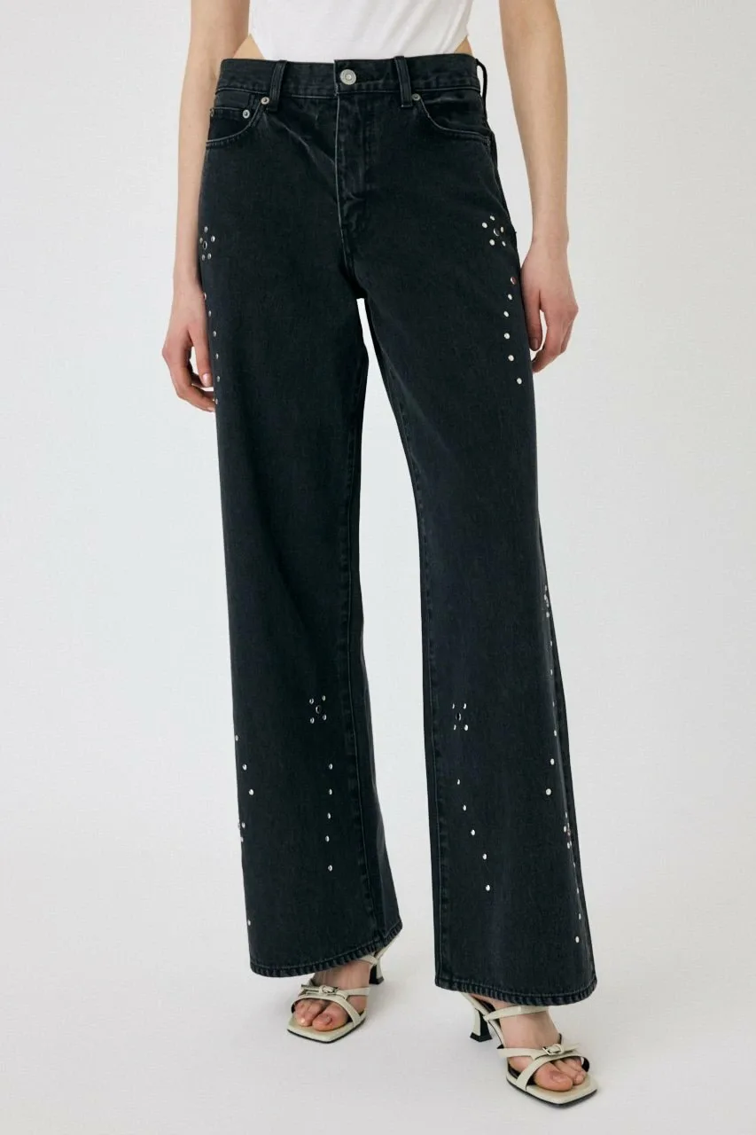 Использование смелых элементов, таких как заклепки, позволяет сочетать эти джинсы с мягкими, женственными рубашками и блузками.