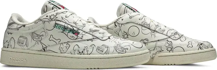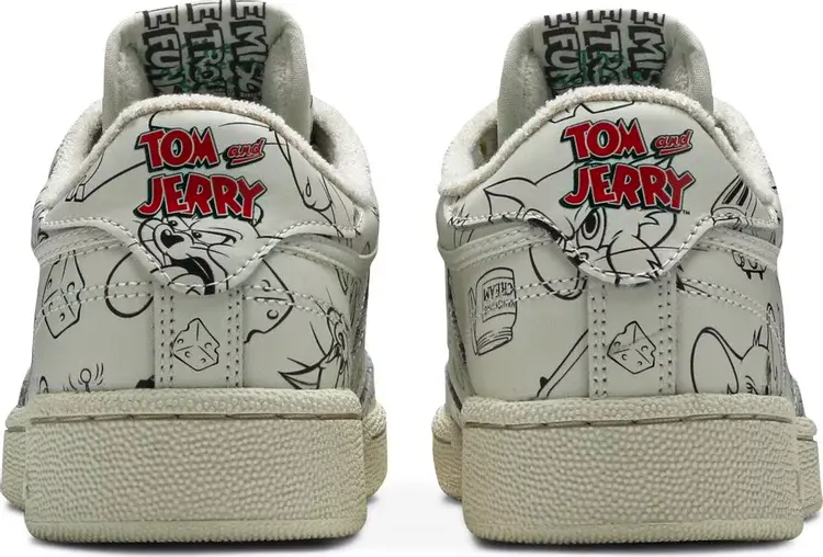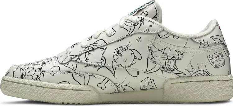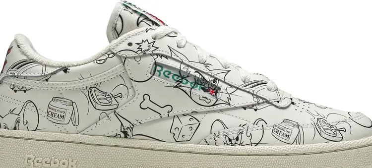 Tom & Jerry x Club C 'Sketch' взят из большой коллекции, посвященной классическому мультсериалу Warner Bros. Винтажные кроссовки Reebok имеют кожаный верх Off-White, покрытый серией иллюстраций ручкой и тушью, а также логотип Тома и Джерри на пятке. На тканой бирке на язычке написано «Втрое больше озорства, втрое больше удовольствия», а на специальной стельке изображены кот и мышь, пожимающие друг другу руки.