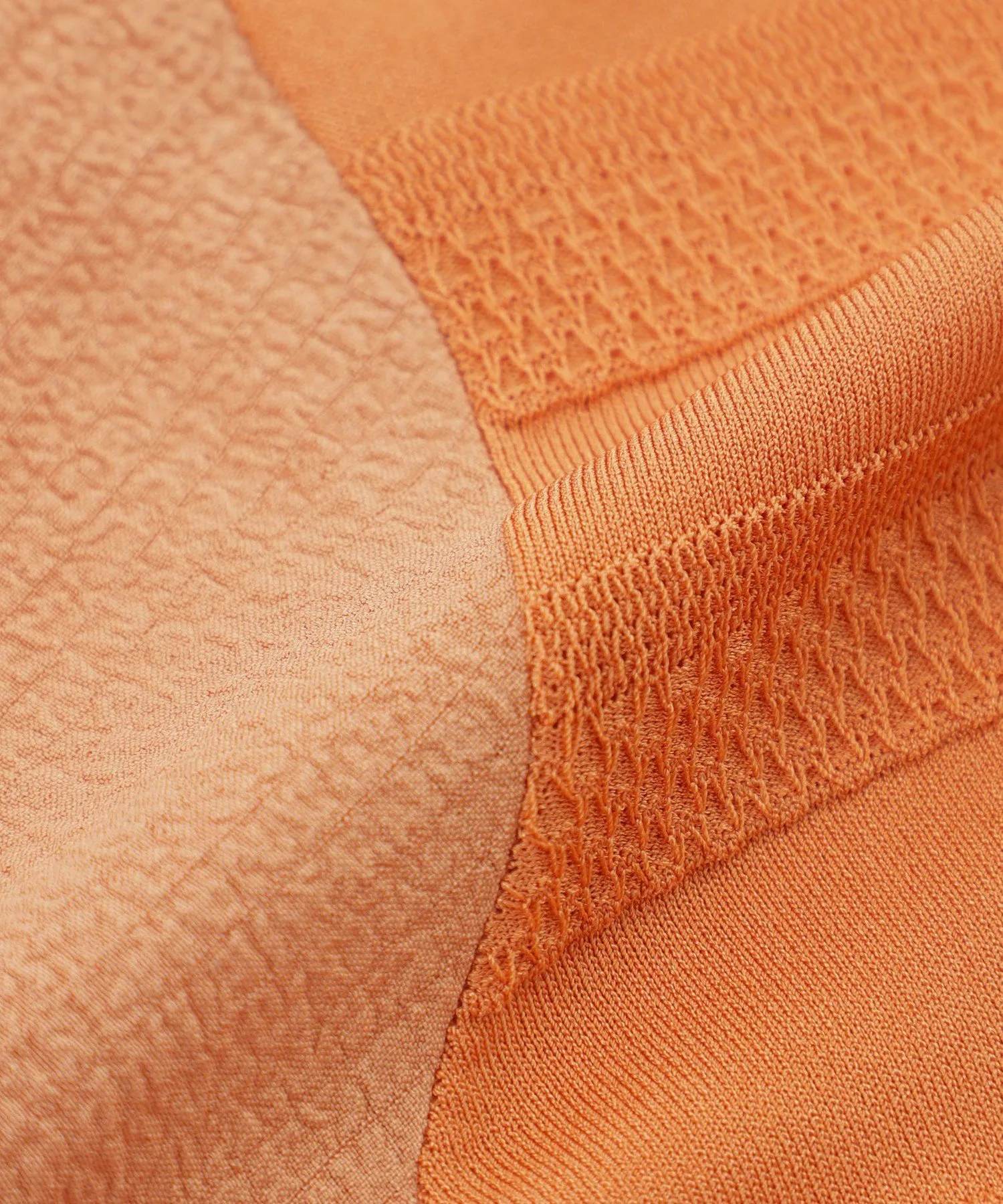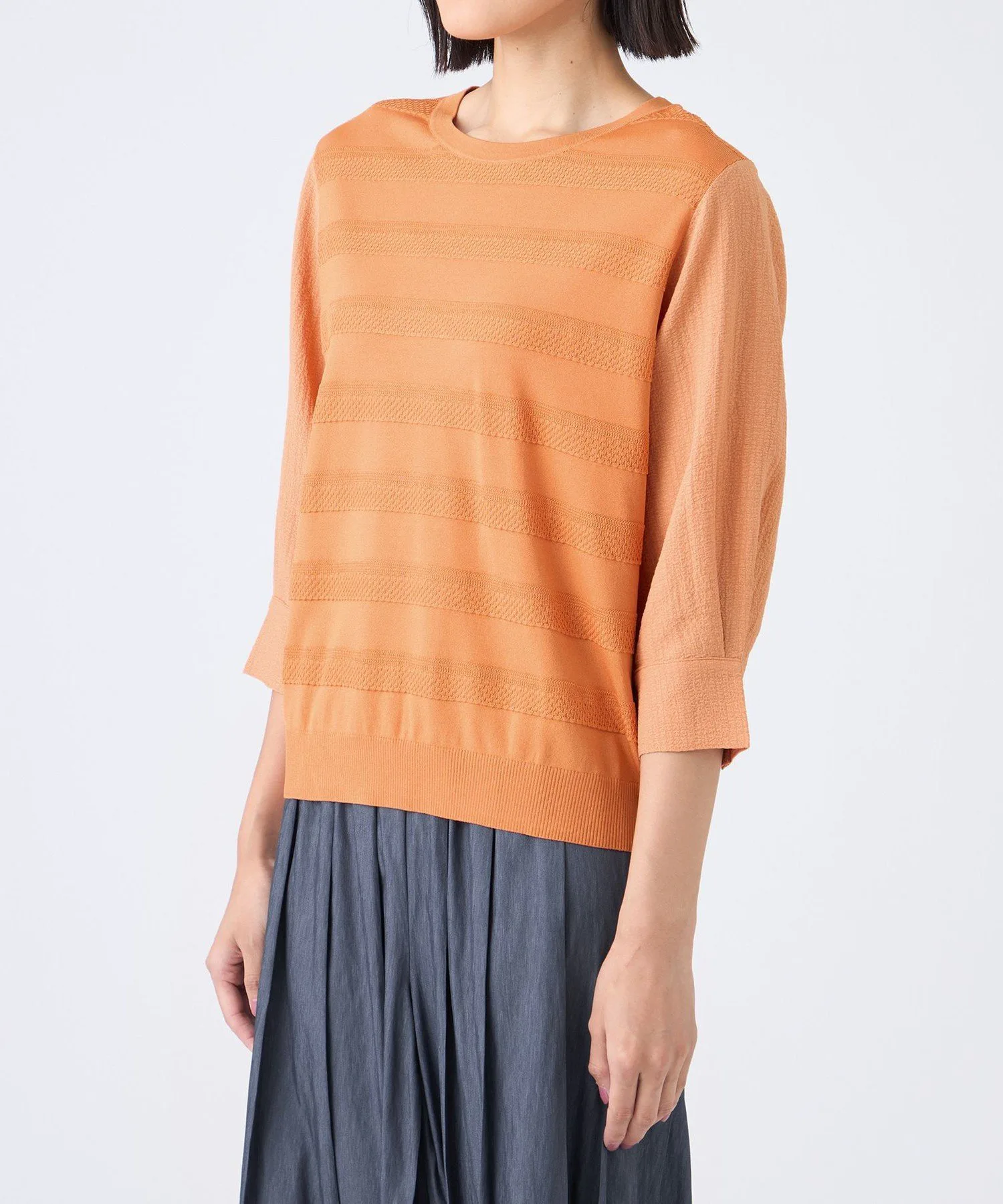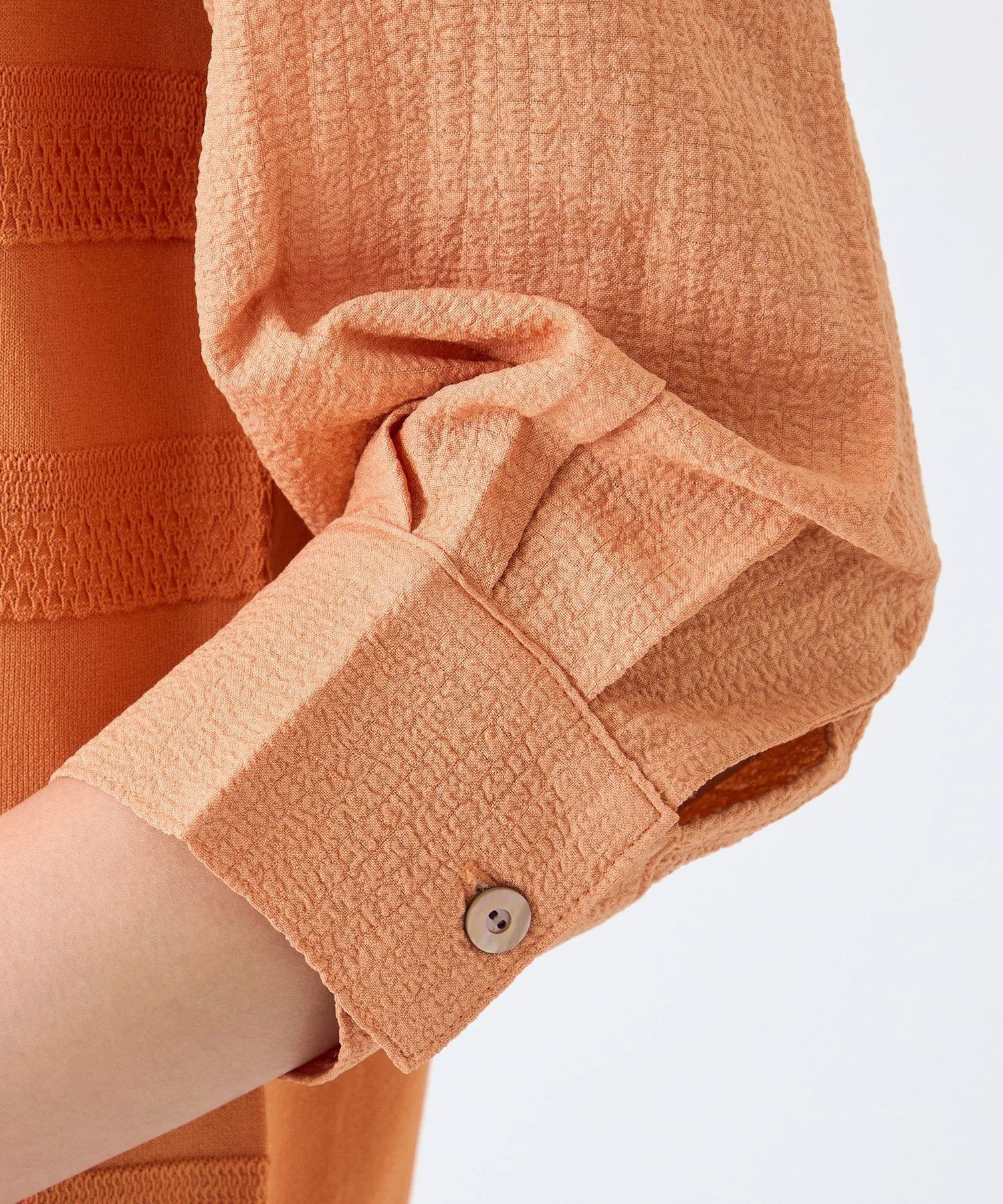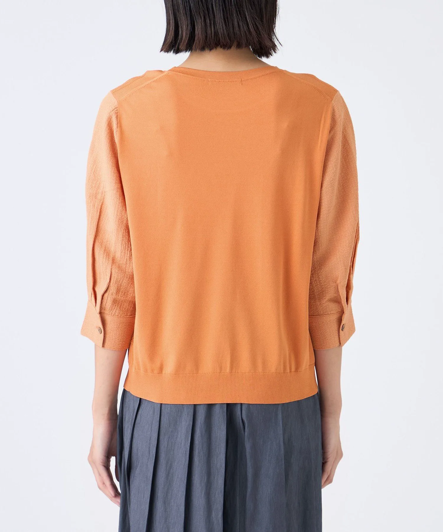 Этот материал представляет собой скрученную длинноволокнистую вискозу и эластичный нейлон. Красивая, плотная вязка обеспечивает комфортное, дышащее ощущение и умеренную прохладу, что делает его подходящим для длительного ношения. Рукава выполнены из специального жаккардового материала с эффектом сборки и присборивания, что придает им объем, похожий на трикотаж, и естественную эластичность.