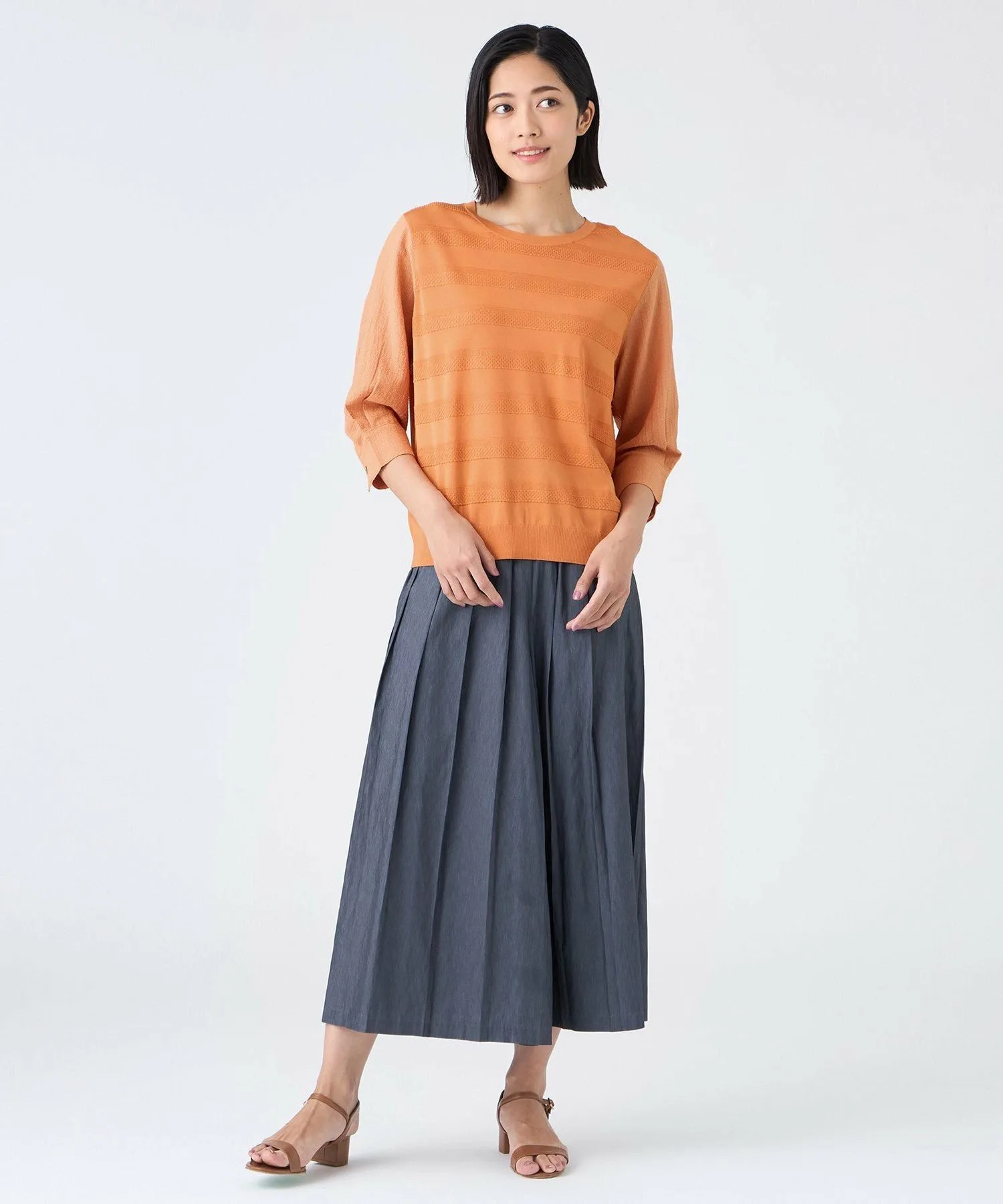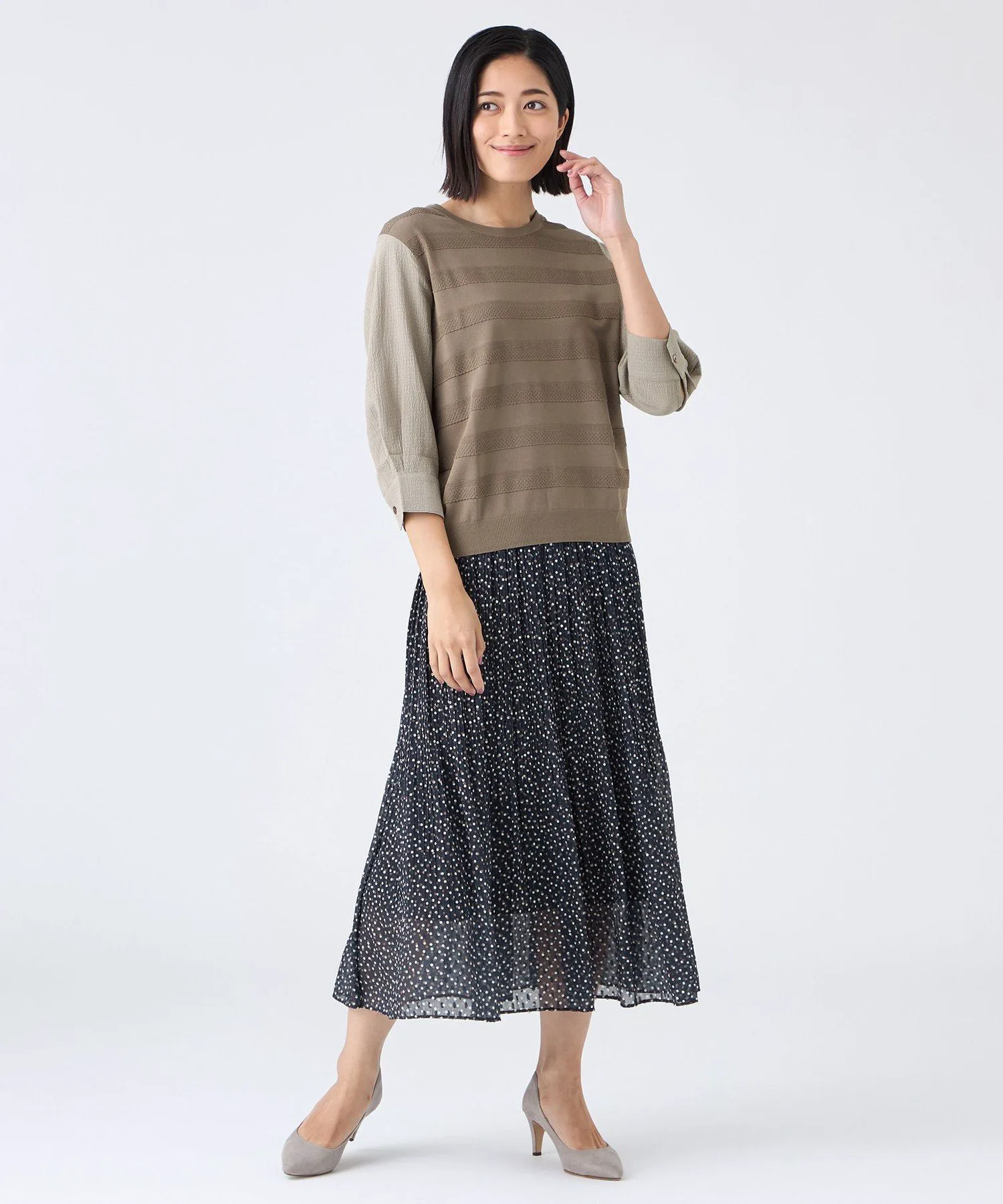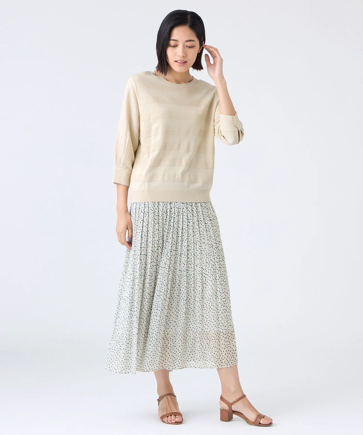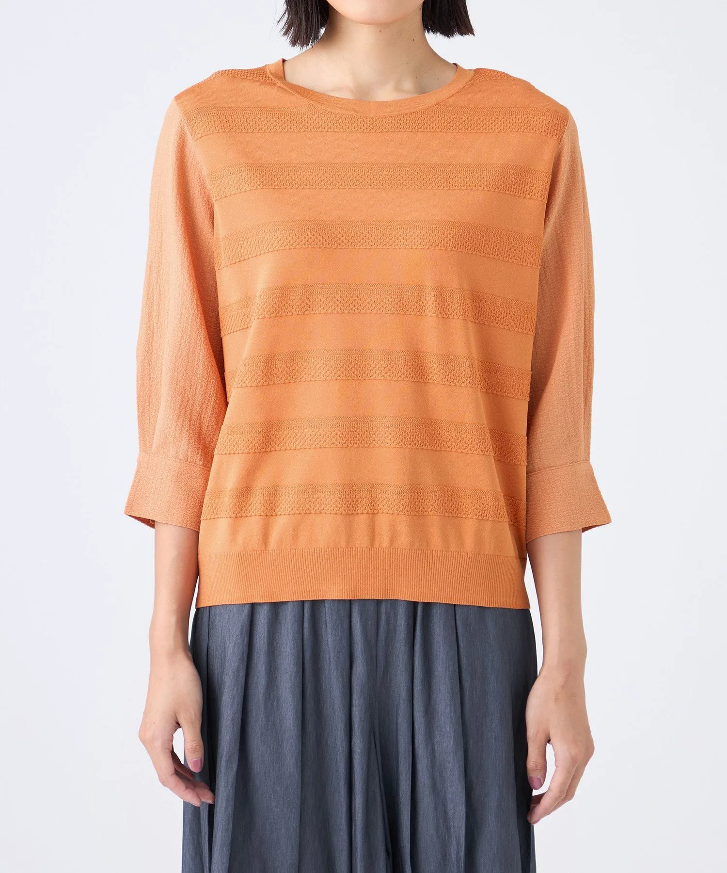Этот материал представляет собой скрученную длинноволокнистую вискозу и эластичный нейлон. Красивая, плотная вязка обеспечивает комфортное, дышащее ощущение и умеренную прохладу, что делает его подходящим для длительного ношения. Рукава выполнены из специального жаккардового материала с эффектом сборки и присборивания, что придает им объем, похожий на трикотаж, и естественную эластичность.