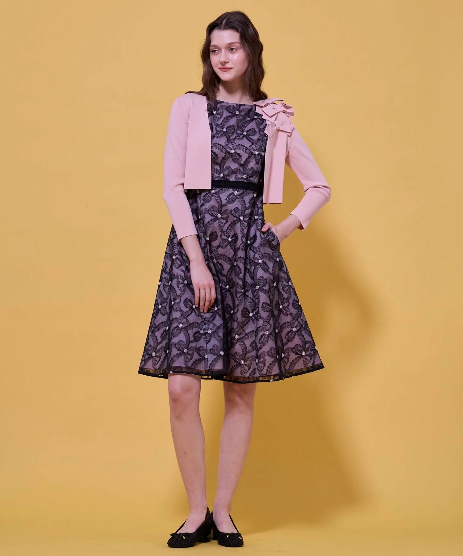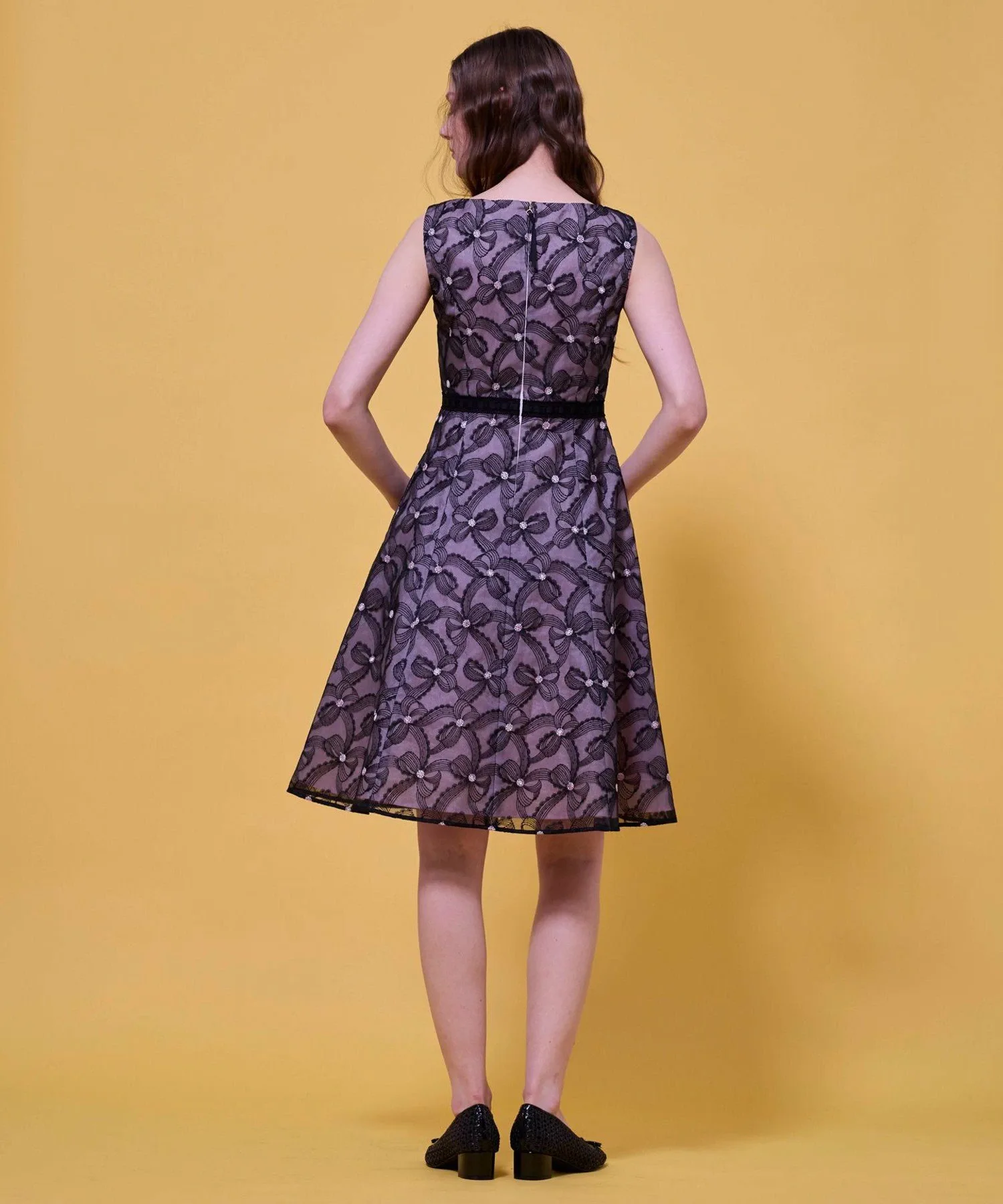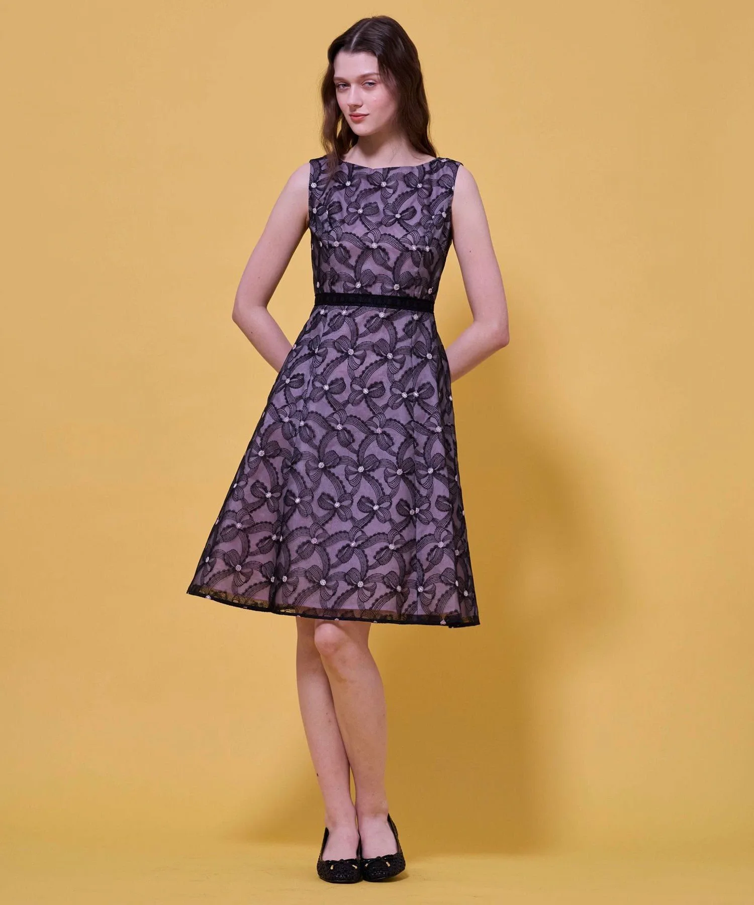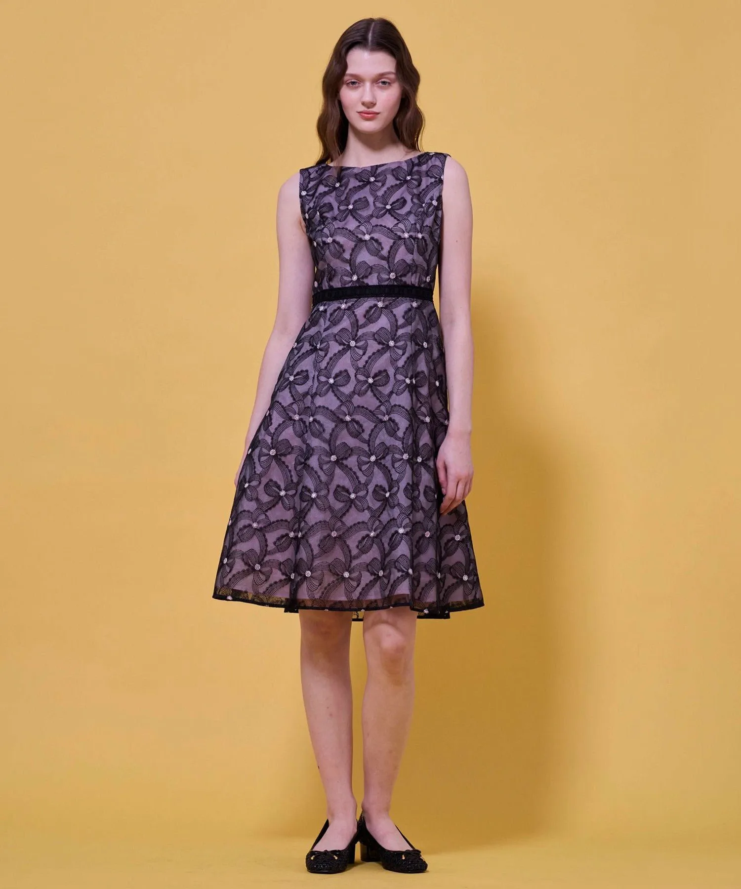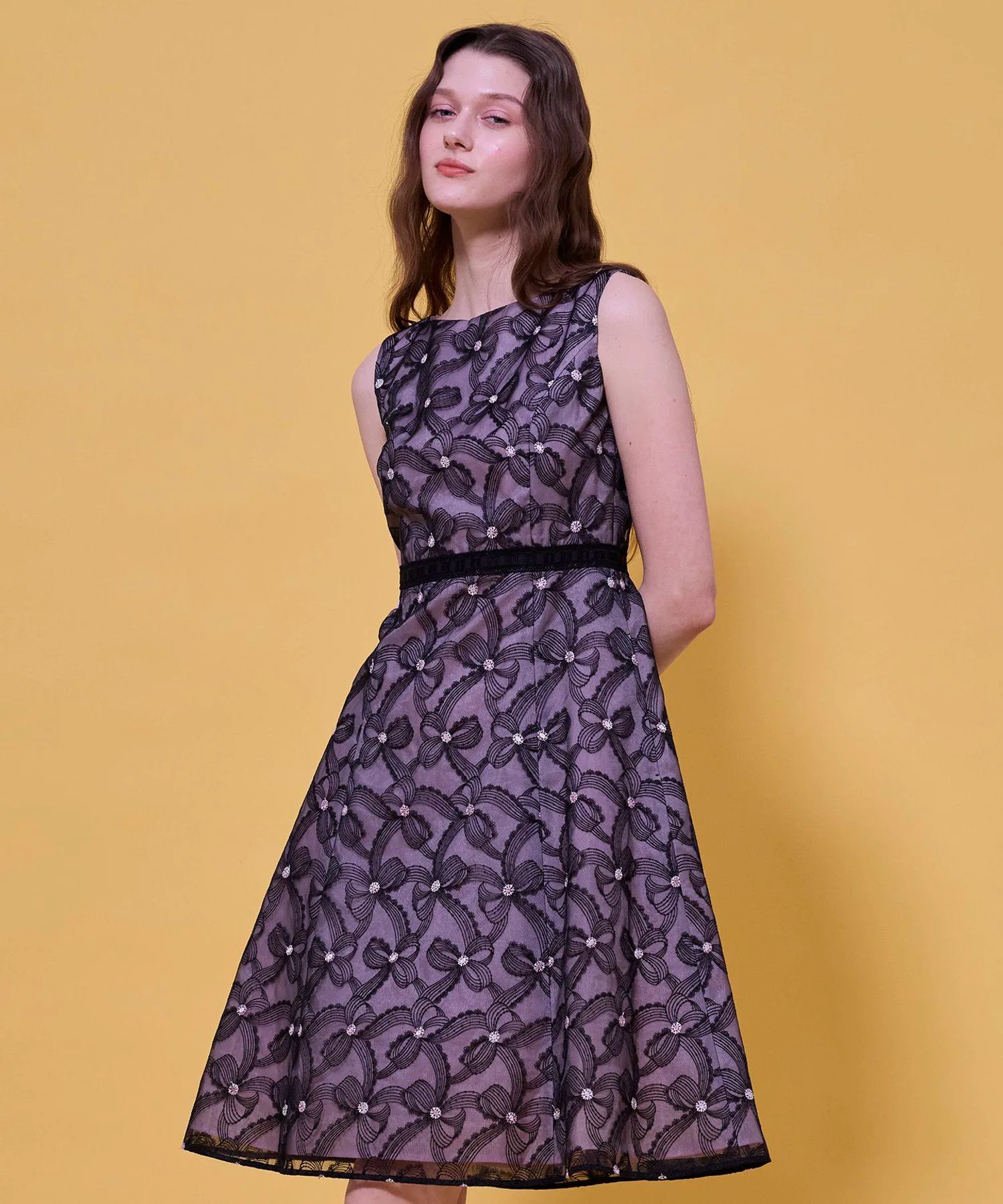Изящная вышивка, создающая трехмерный эффект, словно ленты держатся за руки, придает платью элегантность и изысканность.