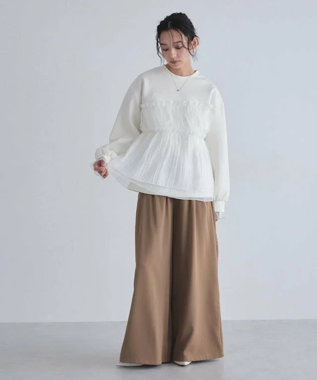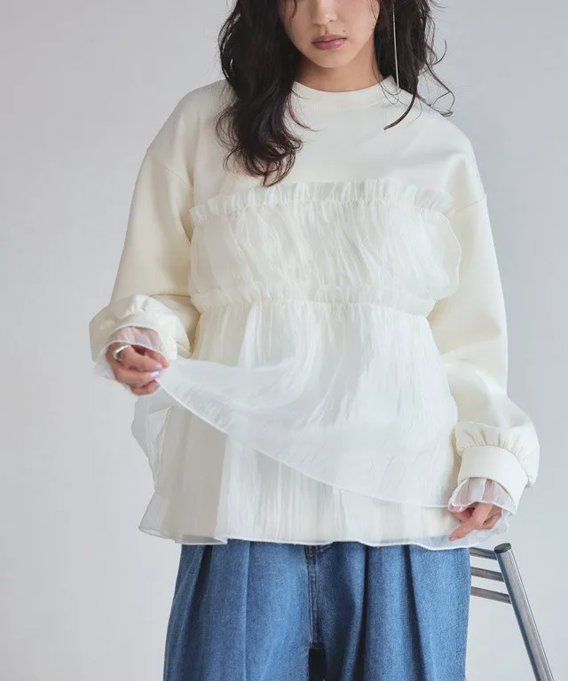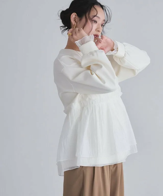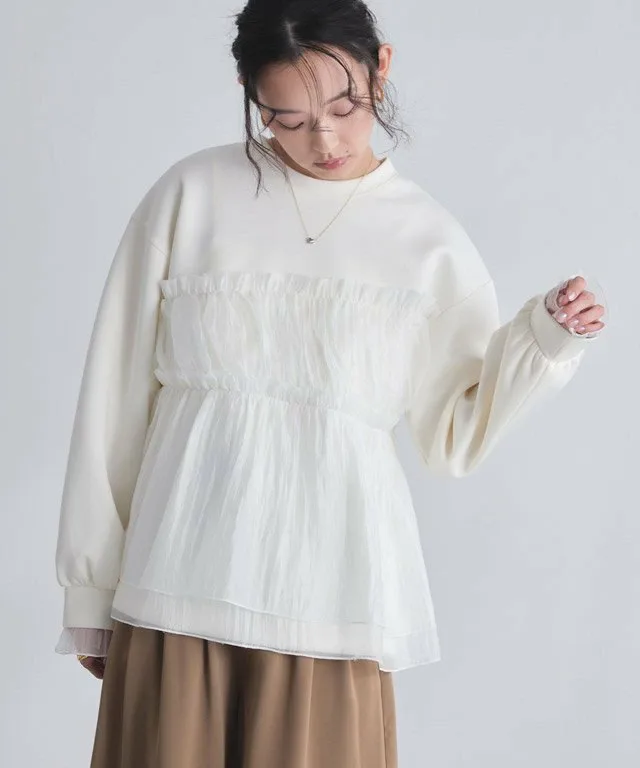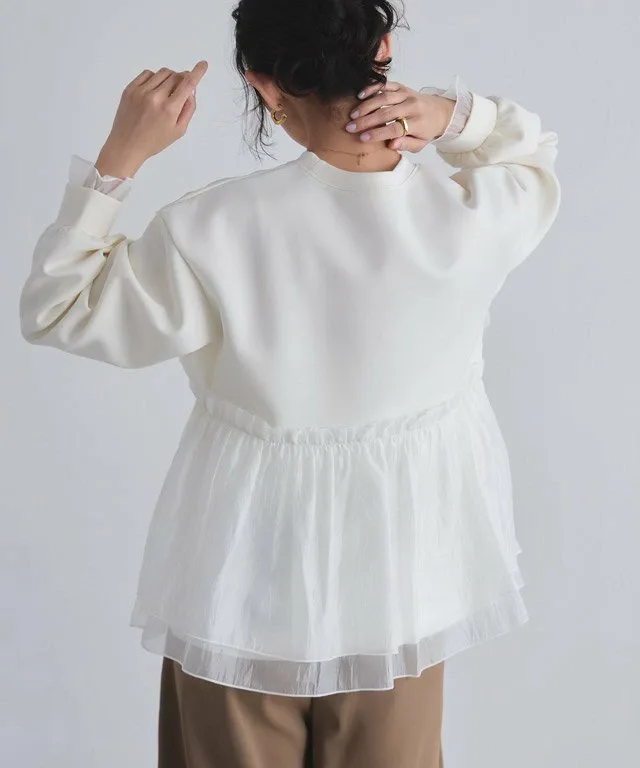 Пуловер с баской, выделяющийся сочетанием различных материалов.