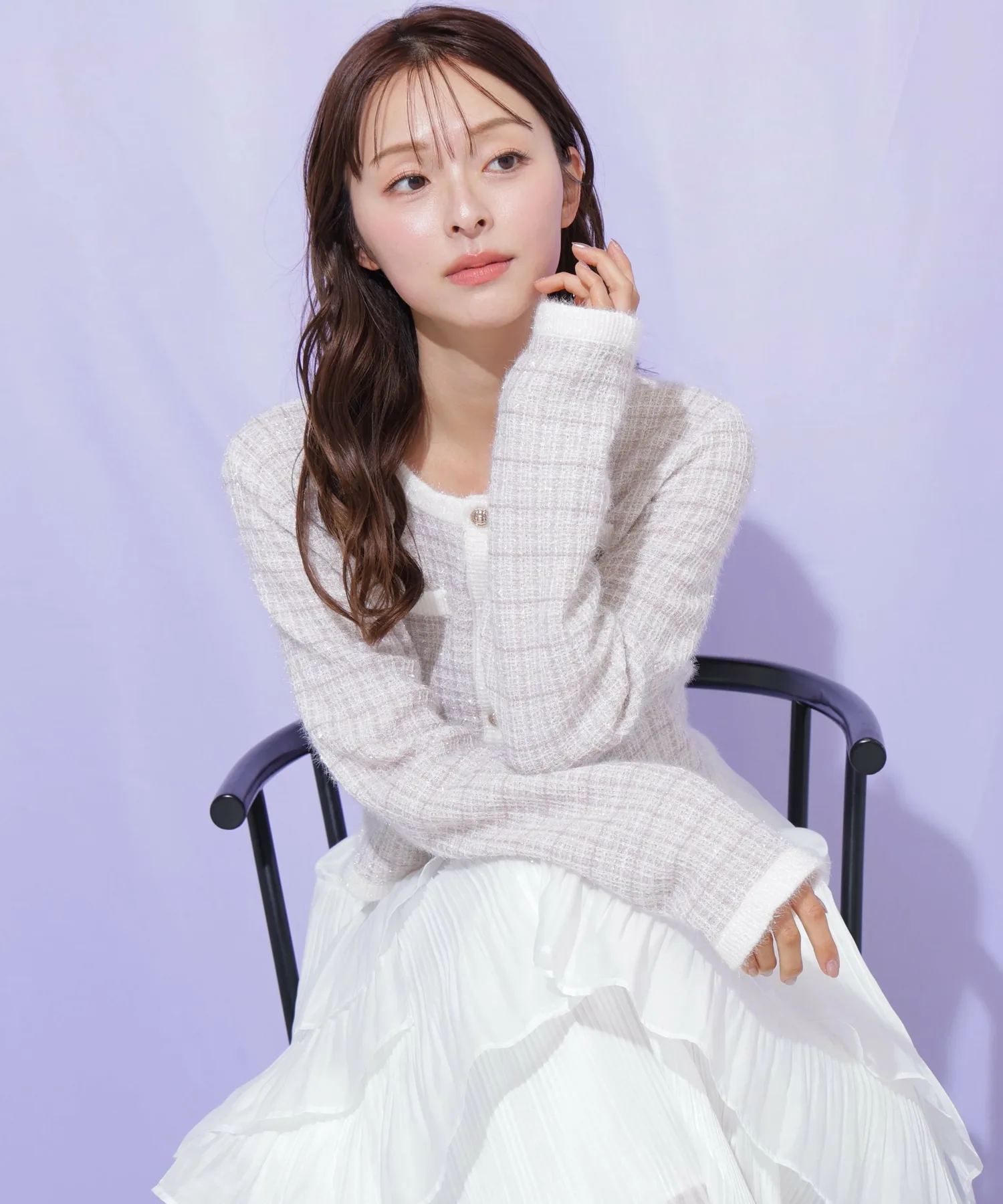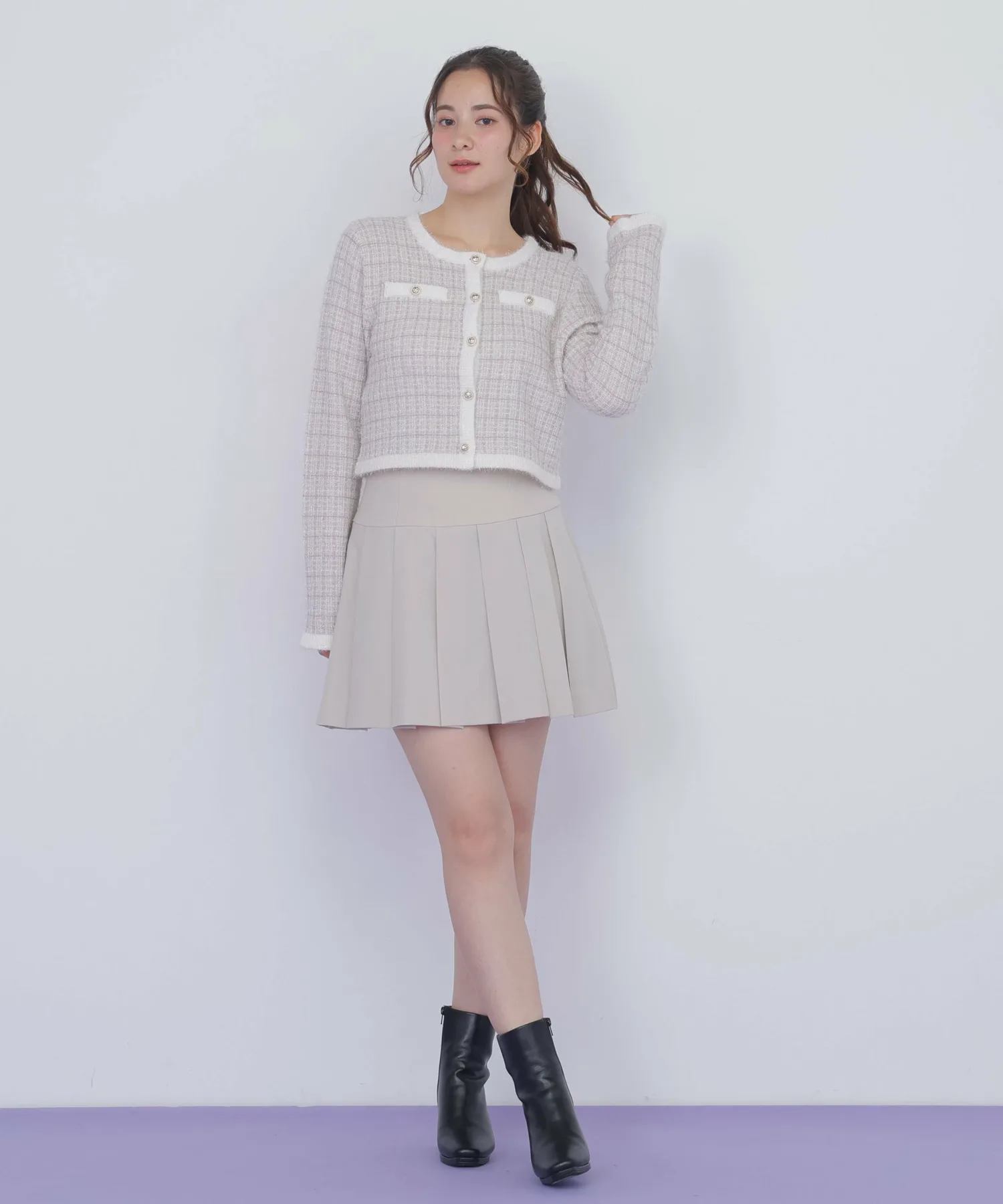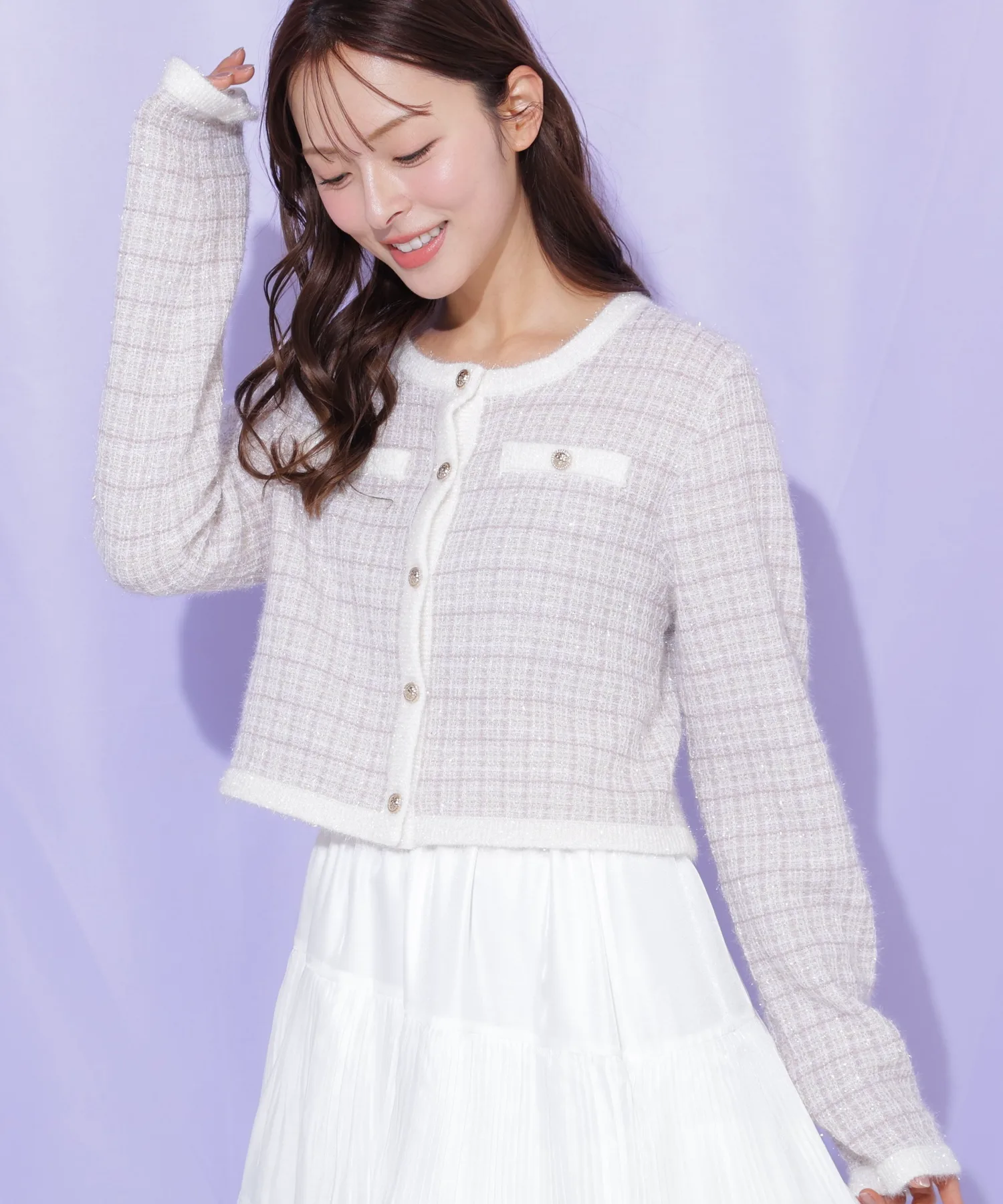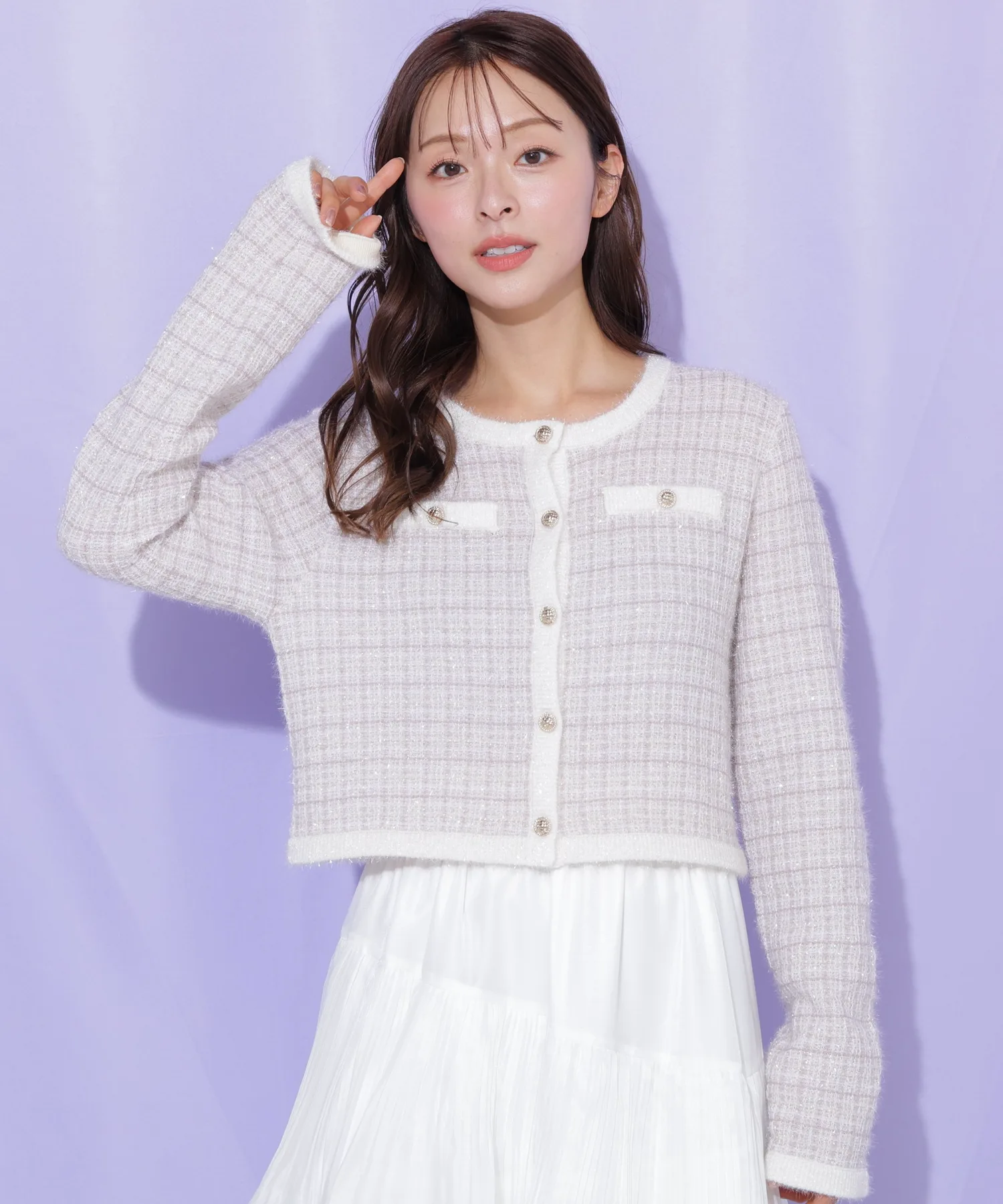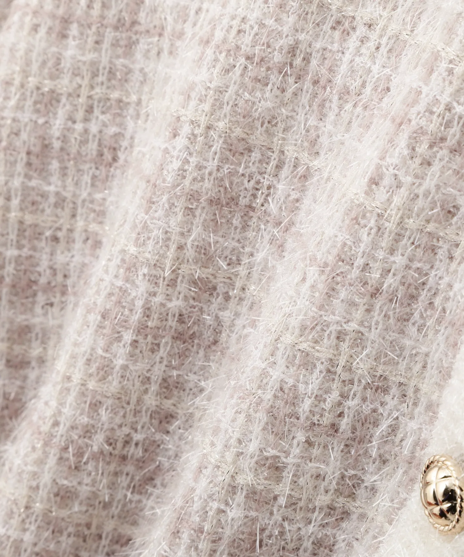 Эта куртка изготовлена из оригинального трикотажного полотна, сочетающего в себе различные виды пряжи, включая блестящую пленочную пряжу, кудрявую букле и блестки. Весенние цвета являются изюминкой. Золотые пуговицы добавляют нотку элегантности.