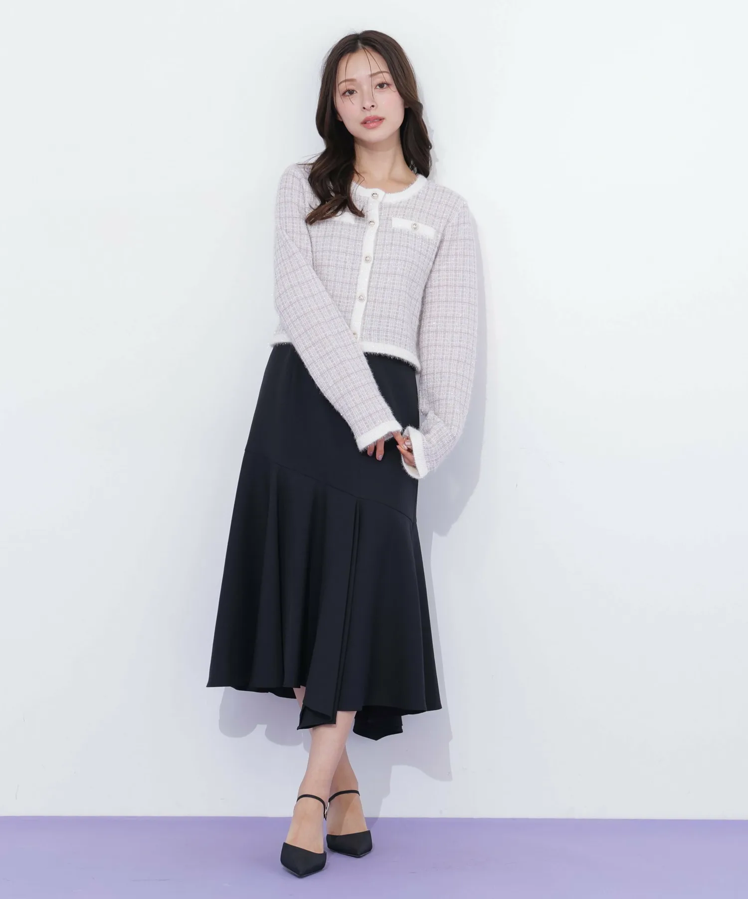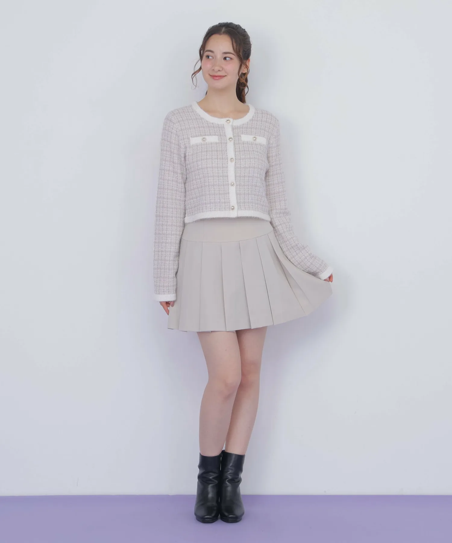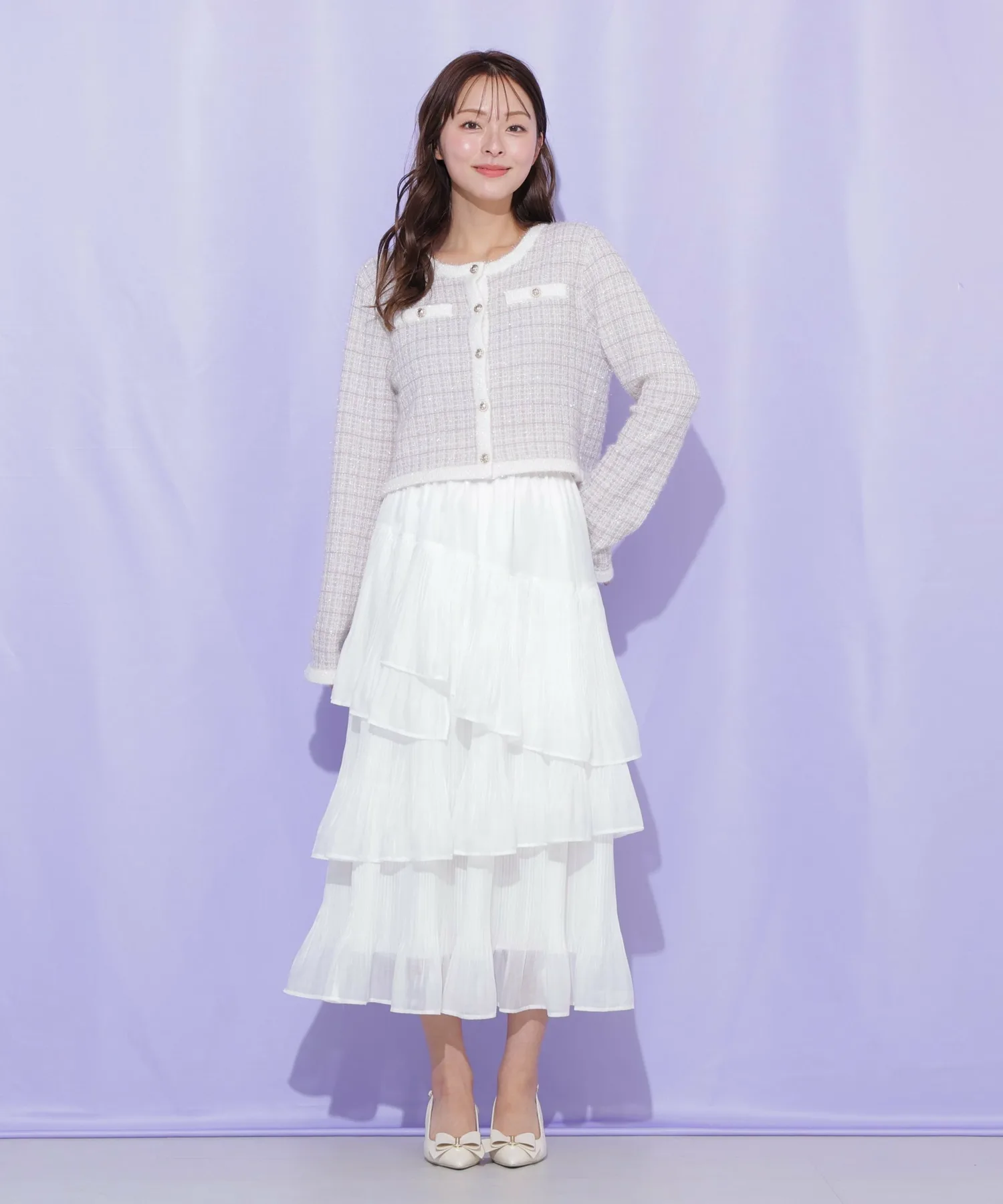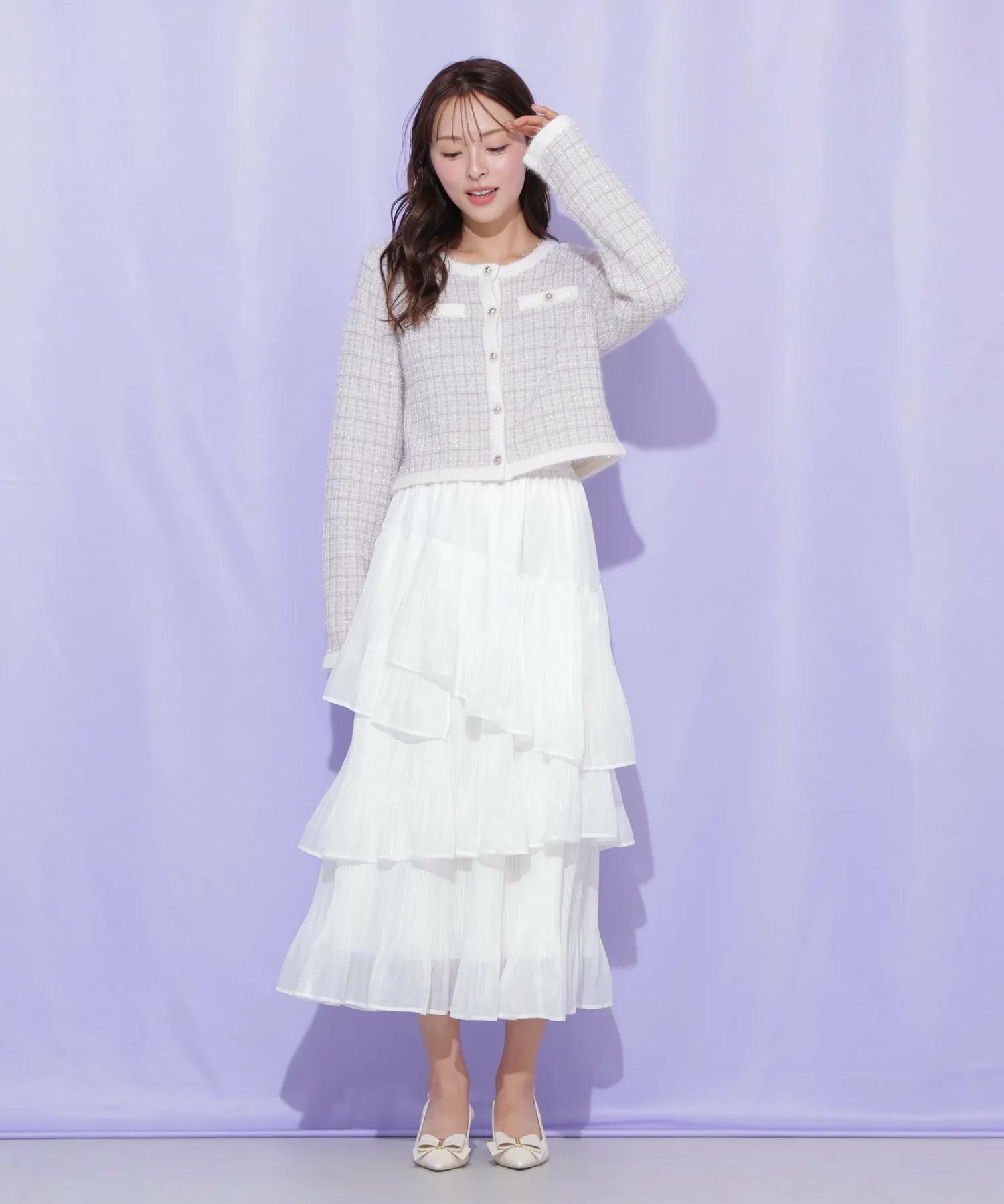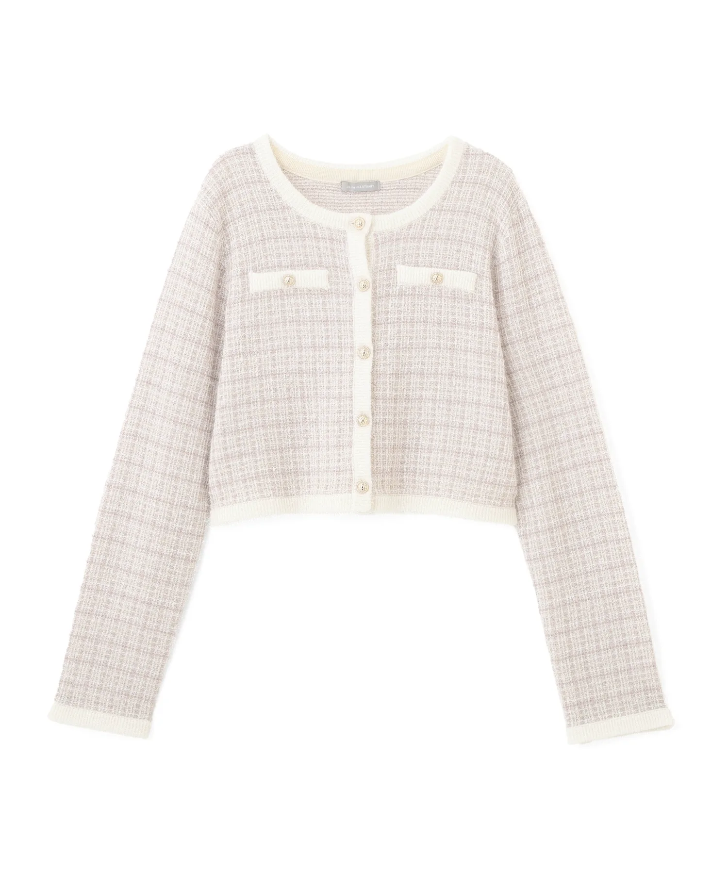 Эта куртка изготовлена из оригинального трикотажного полотна, сочетающего в себе различные виды пряжи, включая блестящую пленочную пряжу, кудрявую букле и блестки. Весенние цвета являются изюминкой. Золотые пуговицы добавляют нотку элегантности.