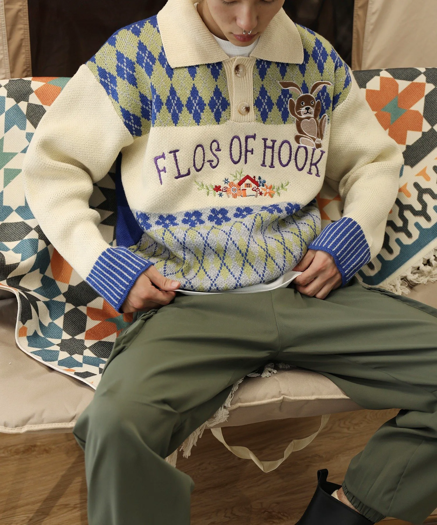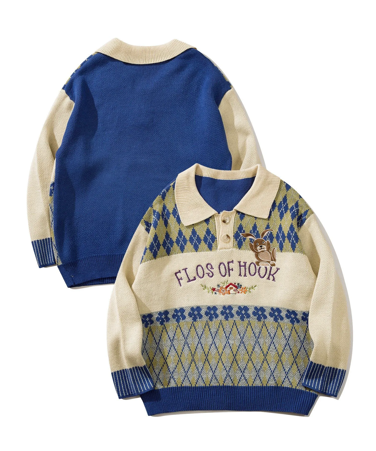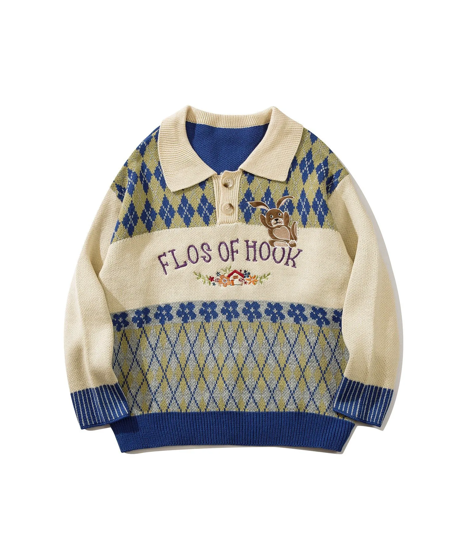Трикотажная рубашка-поло с воротником-поло, выполненная в цветовой гамме с ромбовидным узором и винтажной вышивкой в виде цветов и кроликов.