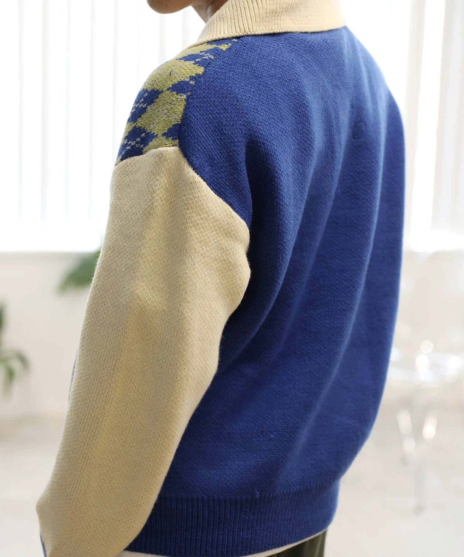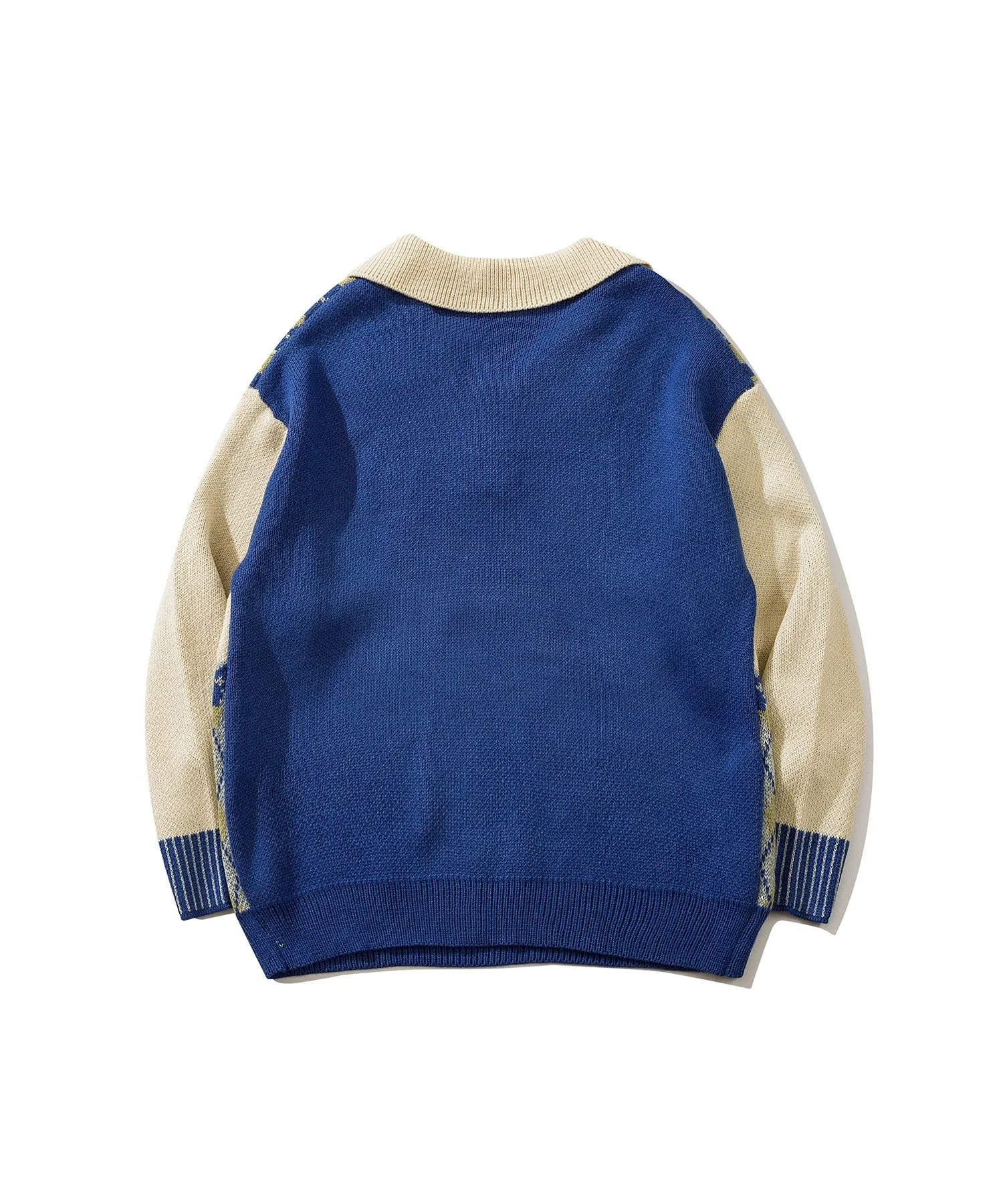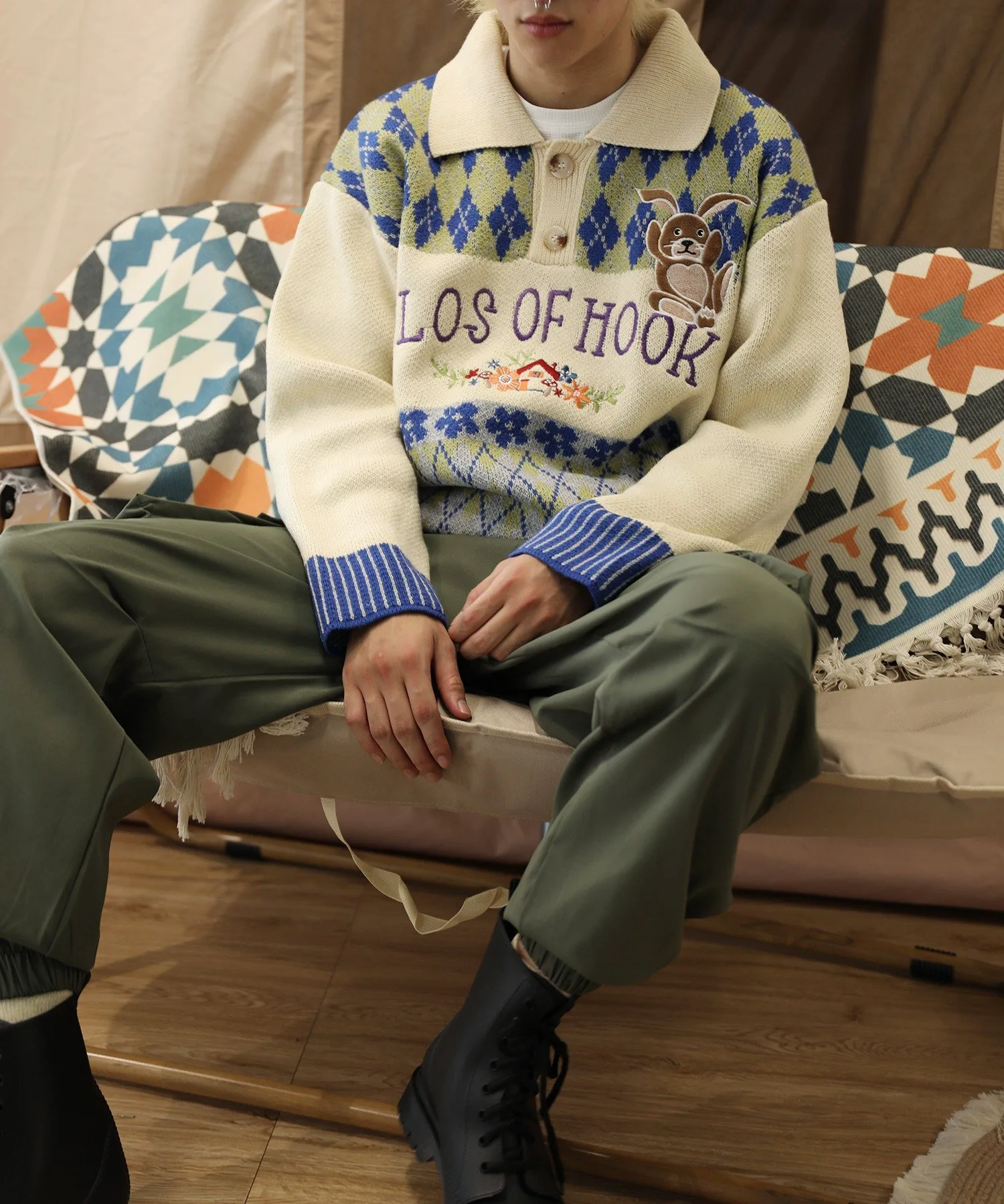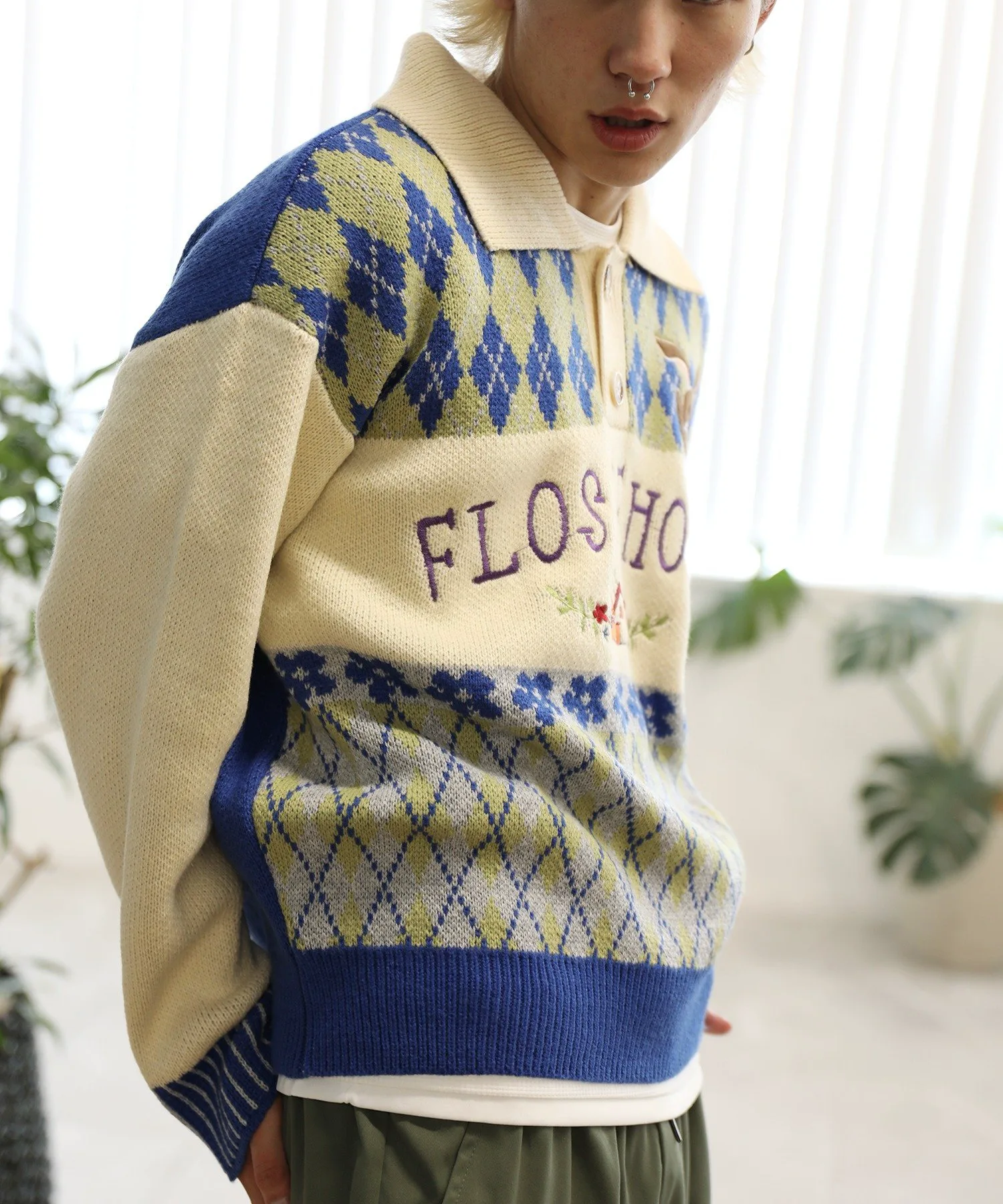 Трикотажная рубашка-поло с воротником-поло, выполненная в цветовой гамме с ромбовидным узором и винтажной вышивкой в виде цветов и кроликов.