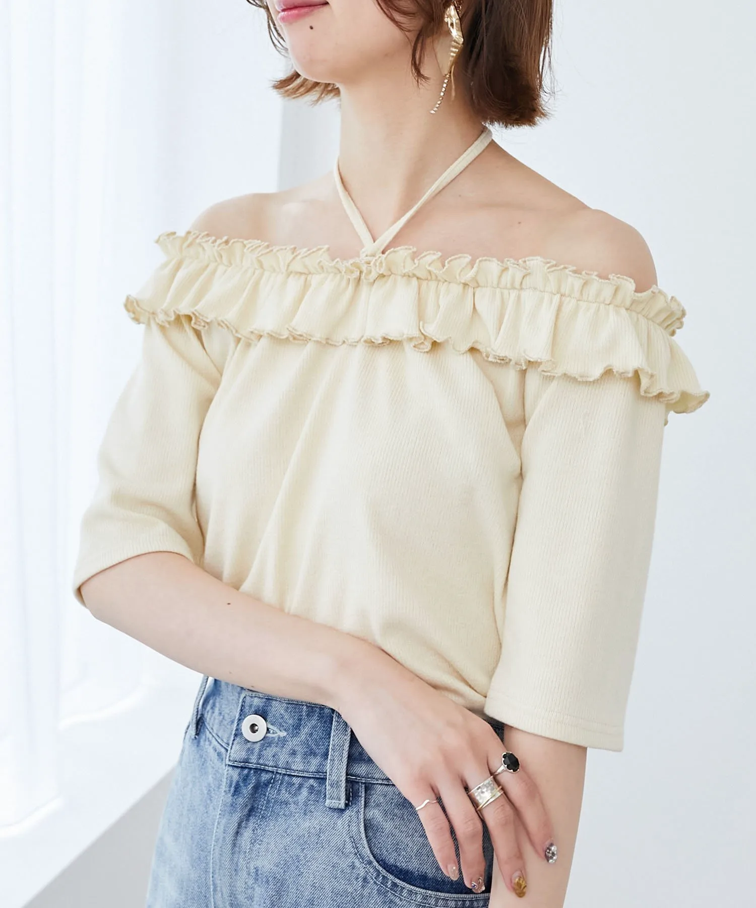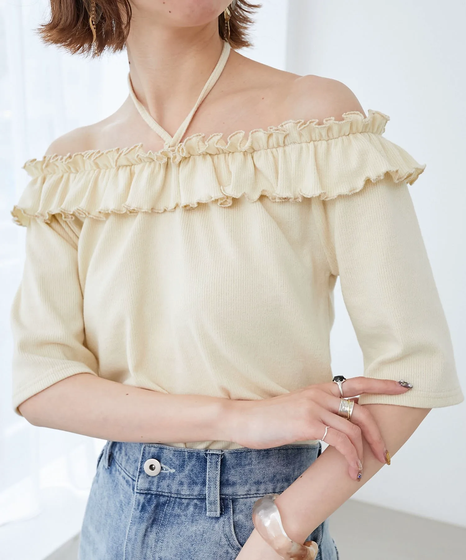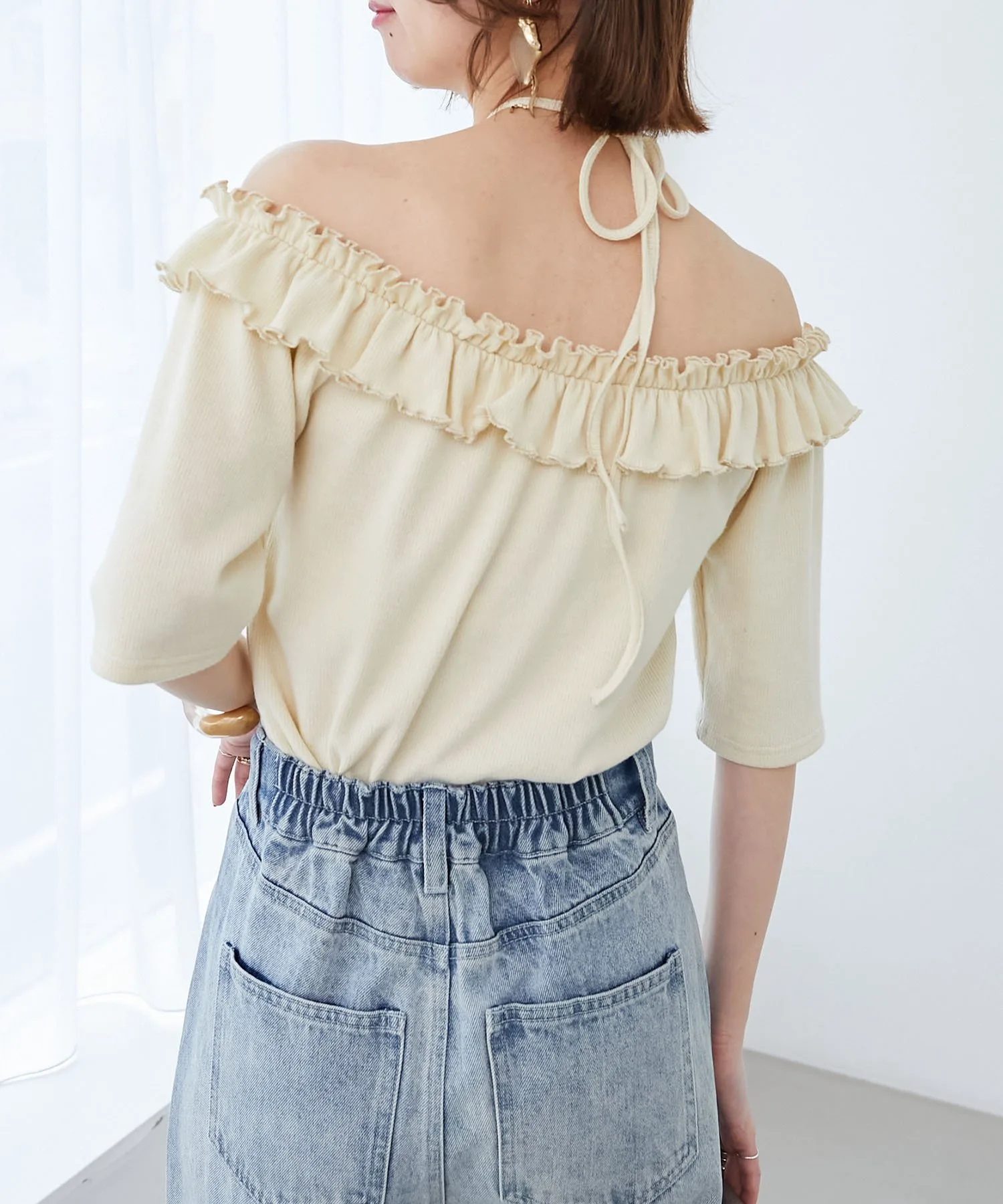 Воротник имеет тщательно продуманный крой и эластичную резинку по всему периметру, что позволяет создать расслабленный образ с открытыми плечами.