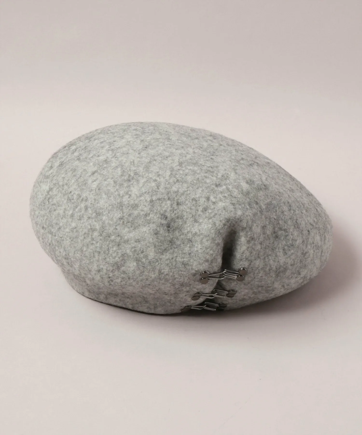Этот простой берет от CA4LA, пользующийся большим спросом, украшен тремя крючками. Ключевая особенность — это складка, которая образуется при застегивании крючков, и вы можете создавать разные образы, застегивая крючки по-разному, например, сняв все или только нижний. Объем тульи можно создать, наклонив ее в сторону или назад для создания естественного вида.