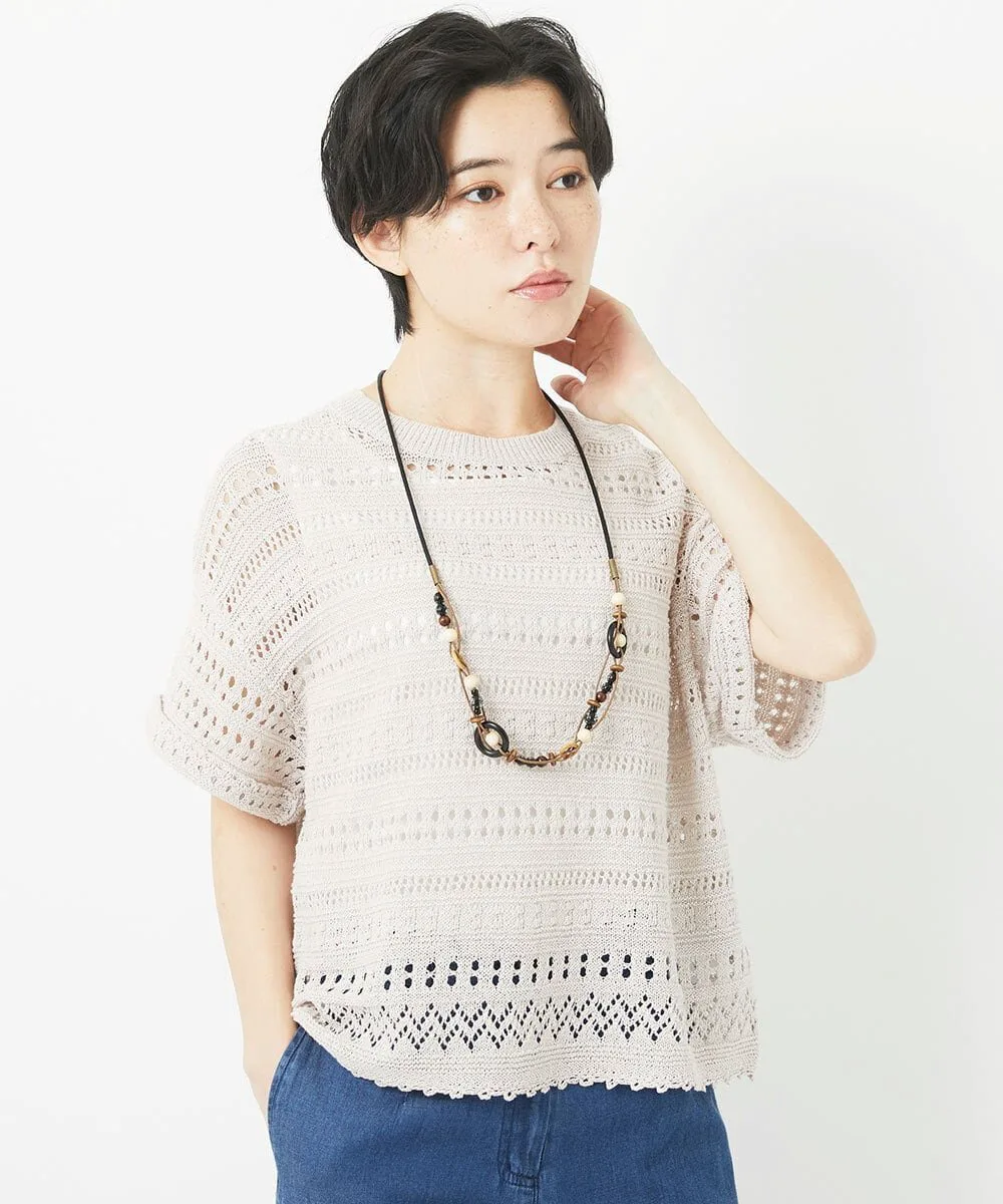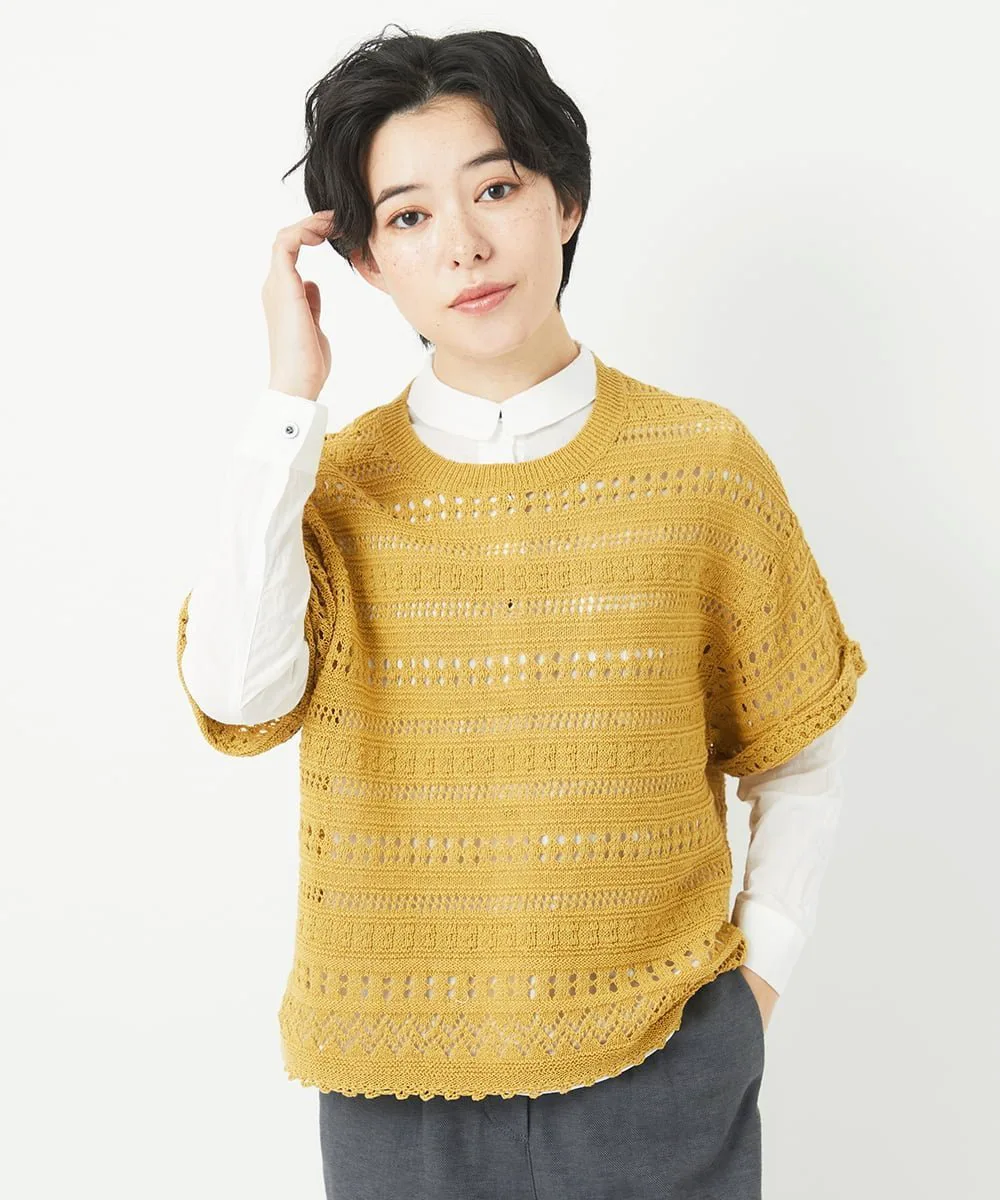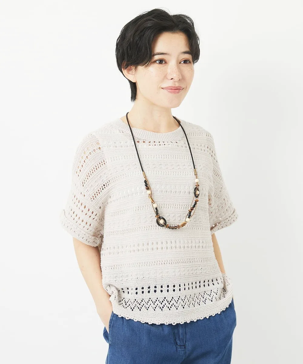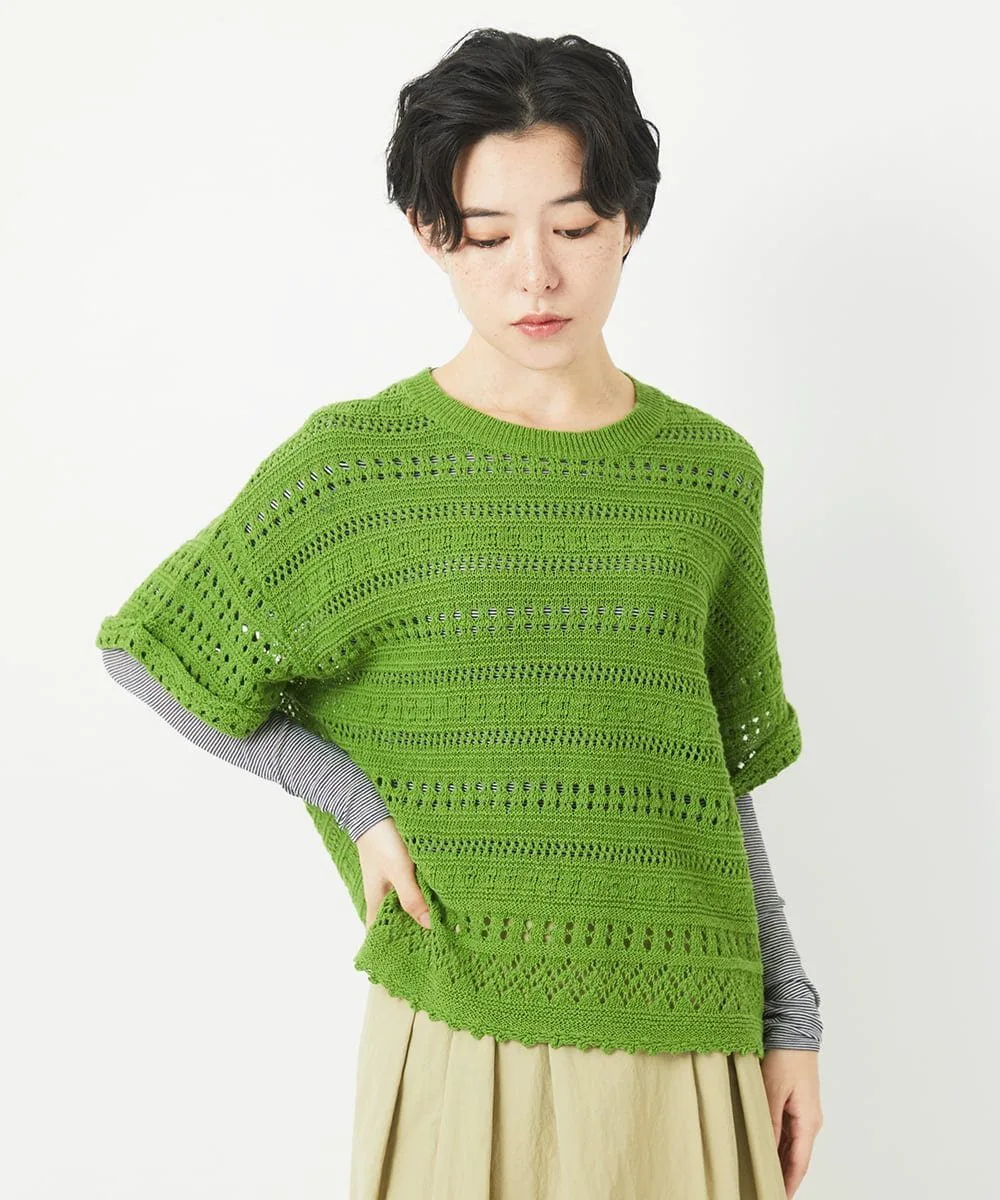 Пуловер из 100% хлопка, связанный крючком, с приятной, освежающей текстурой.