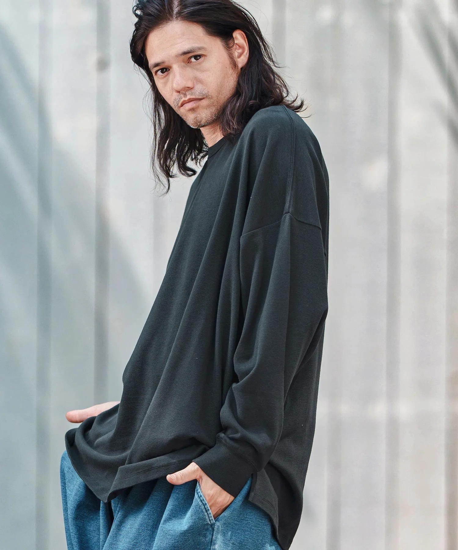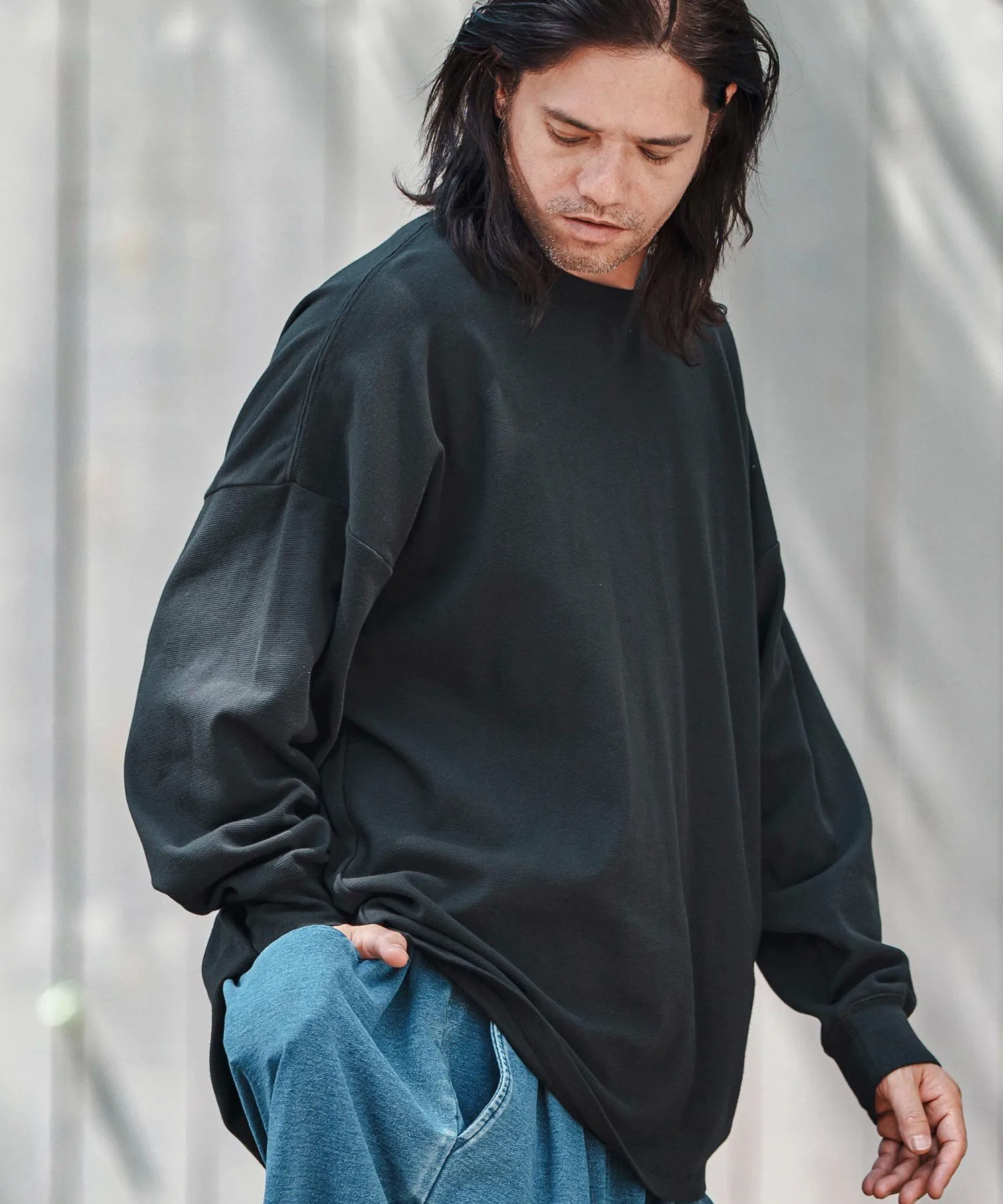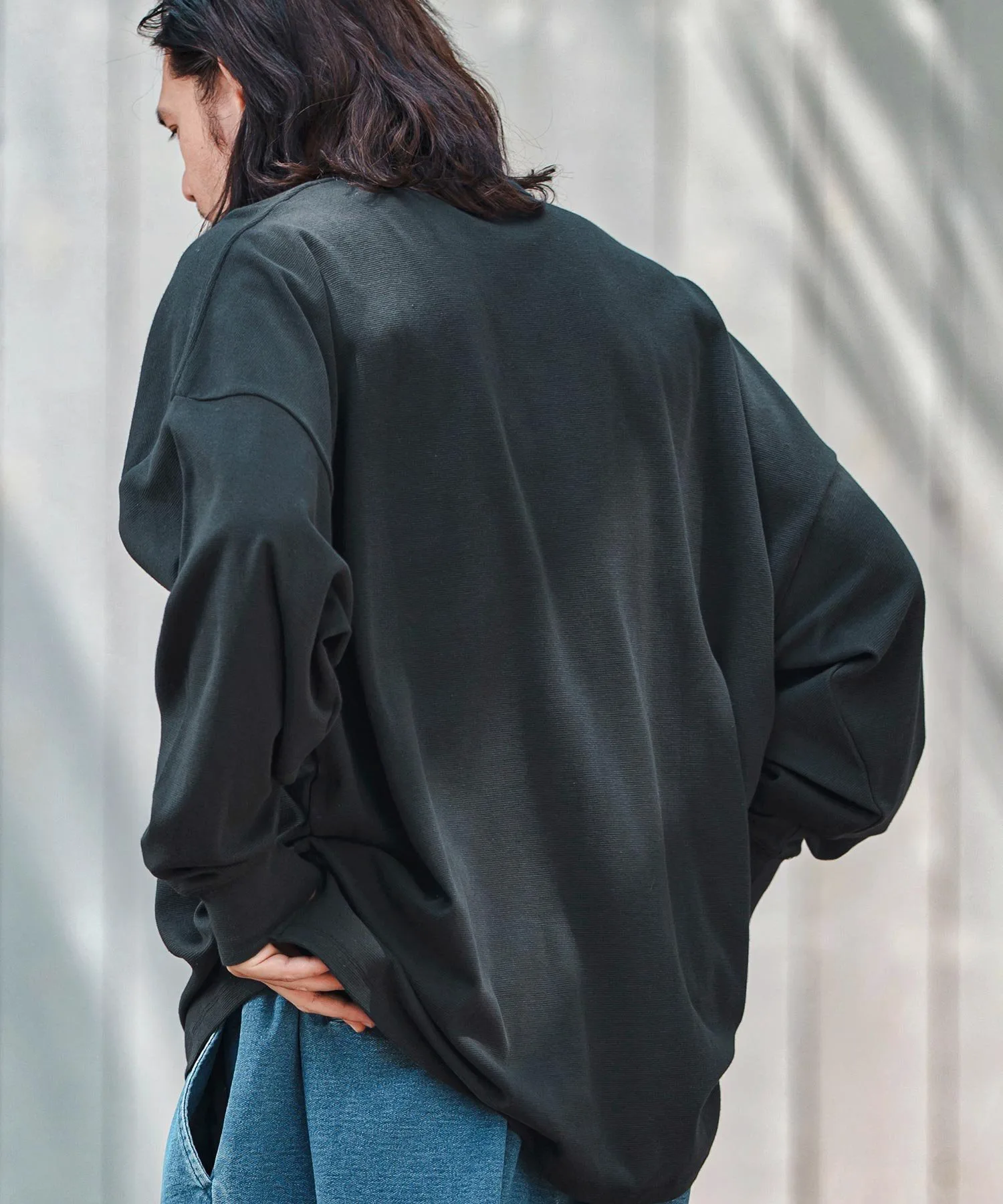 Свободный силуэт с достаточным пространством и приспущенными плечами для расслабленного ощущения.