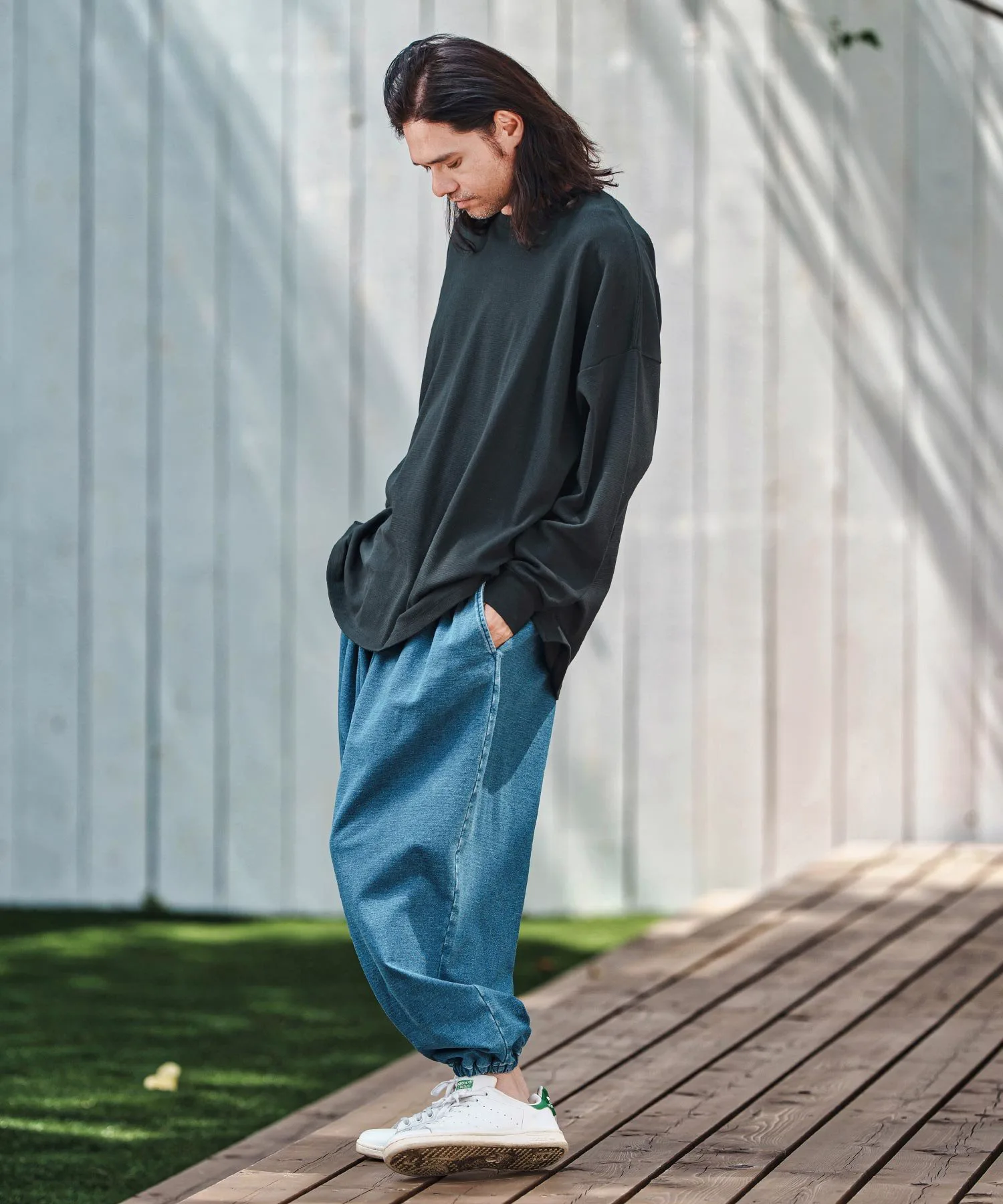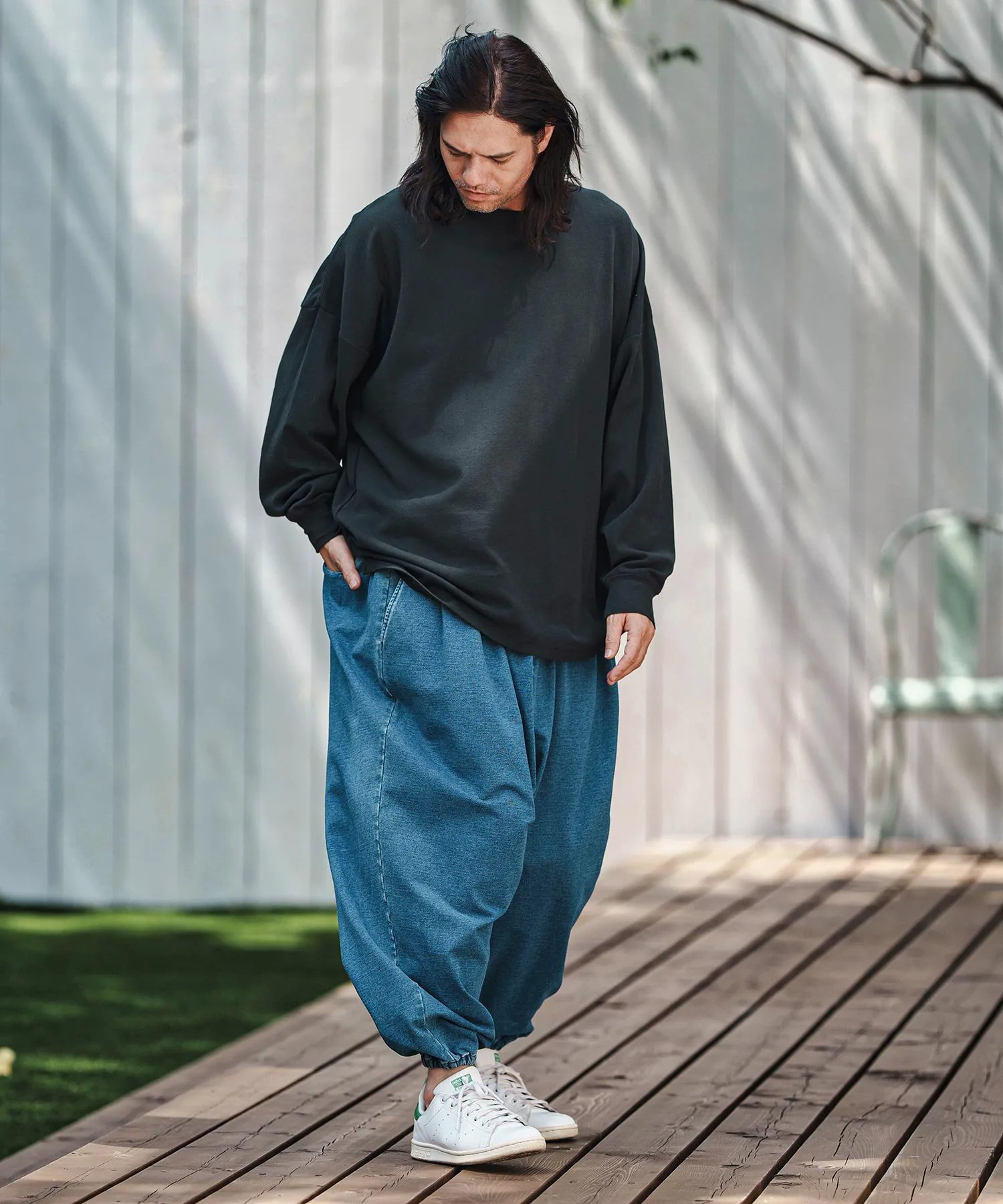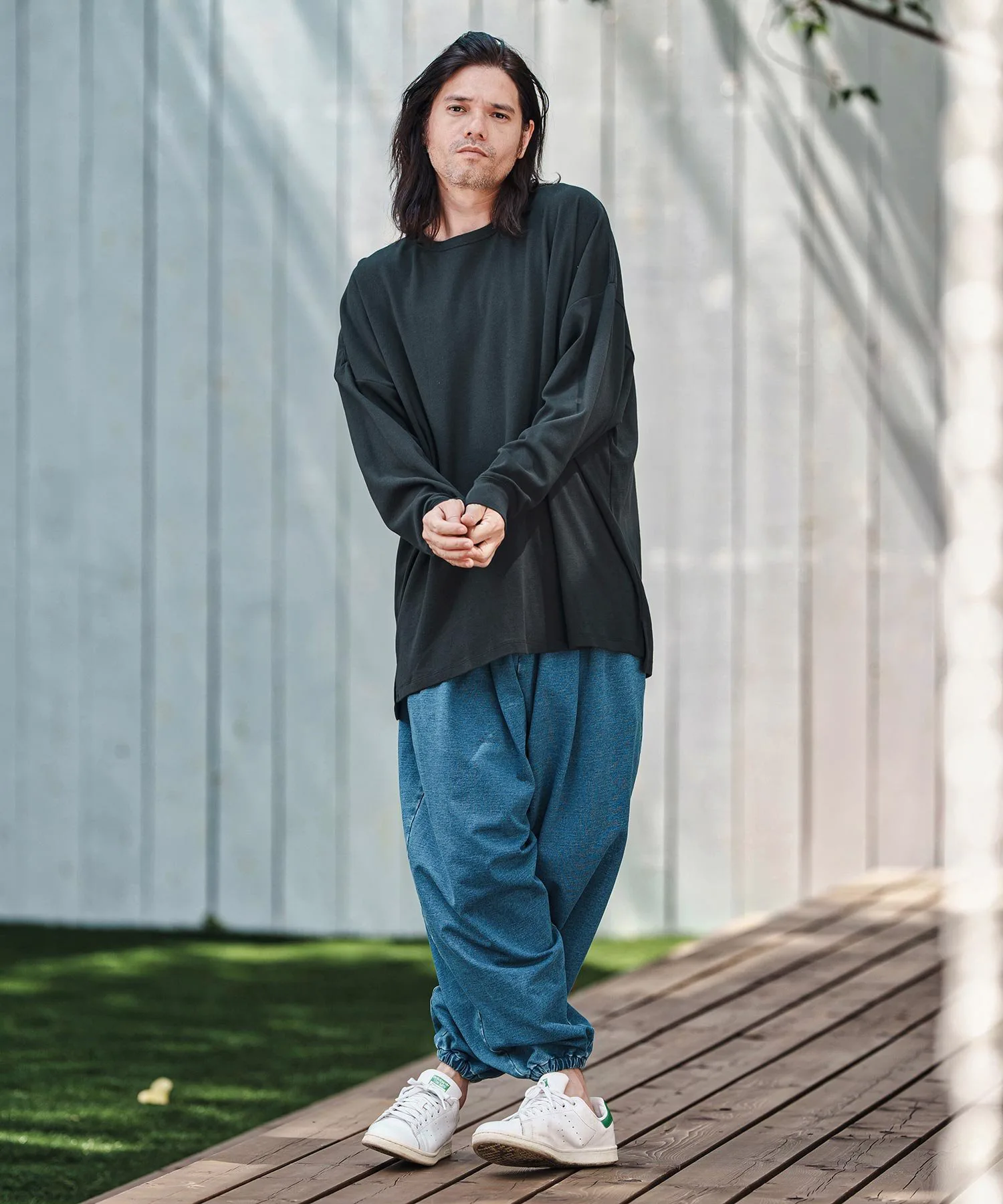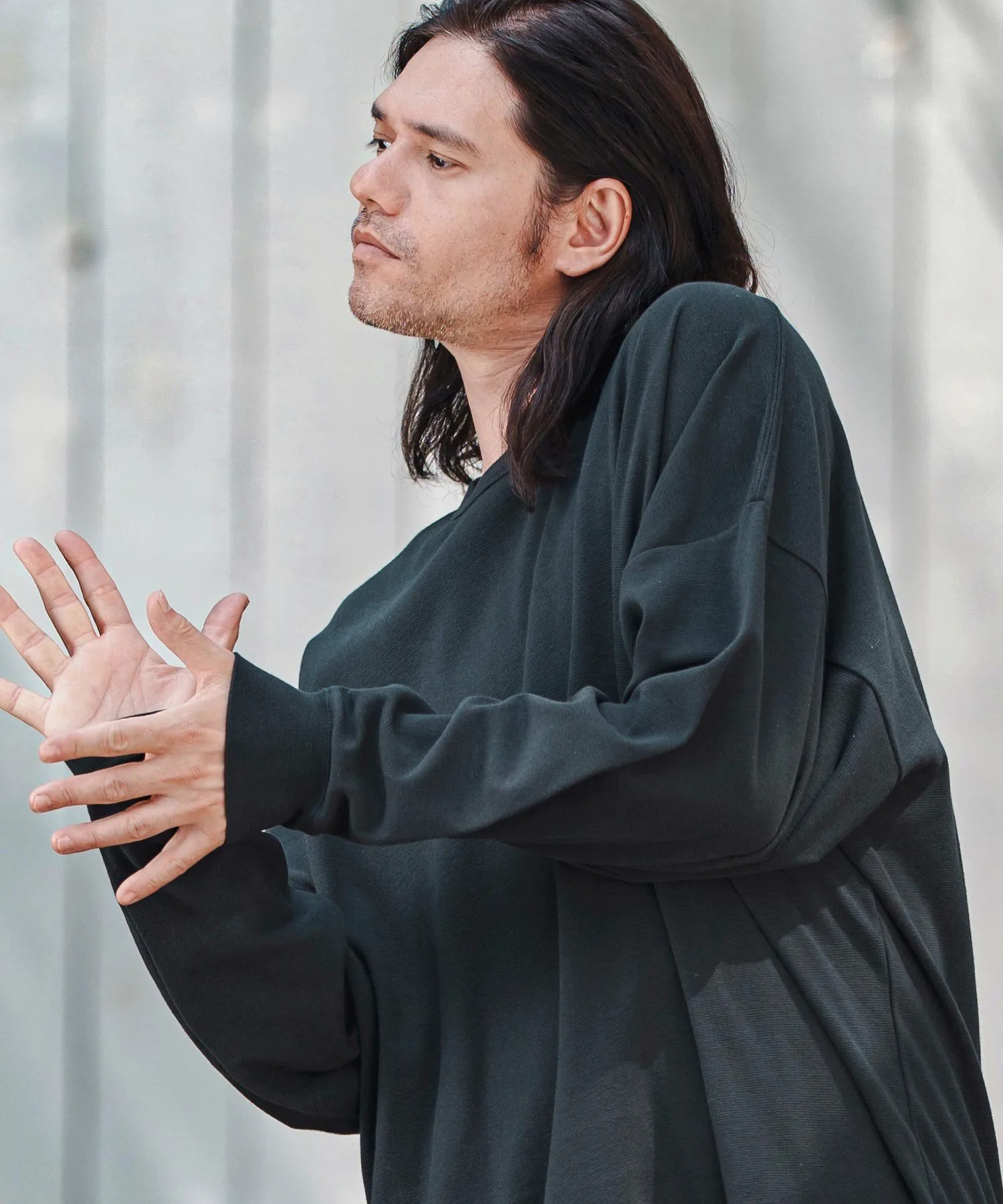 Свободный силуэт с достаточным пространством и приспущенными плечами для расслабленного ощущения.
