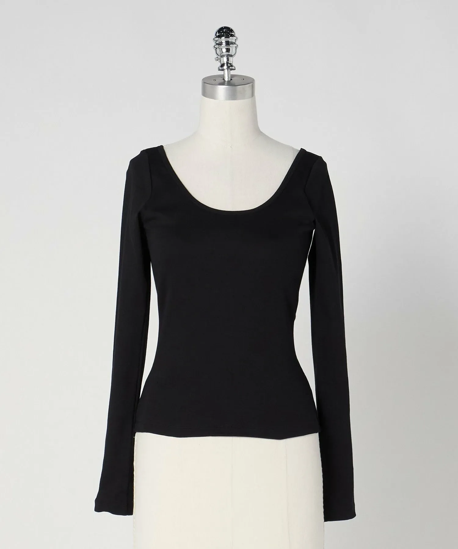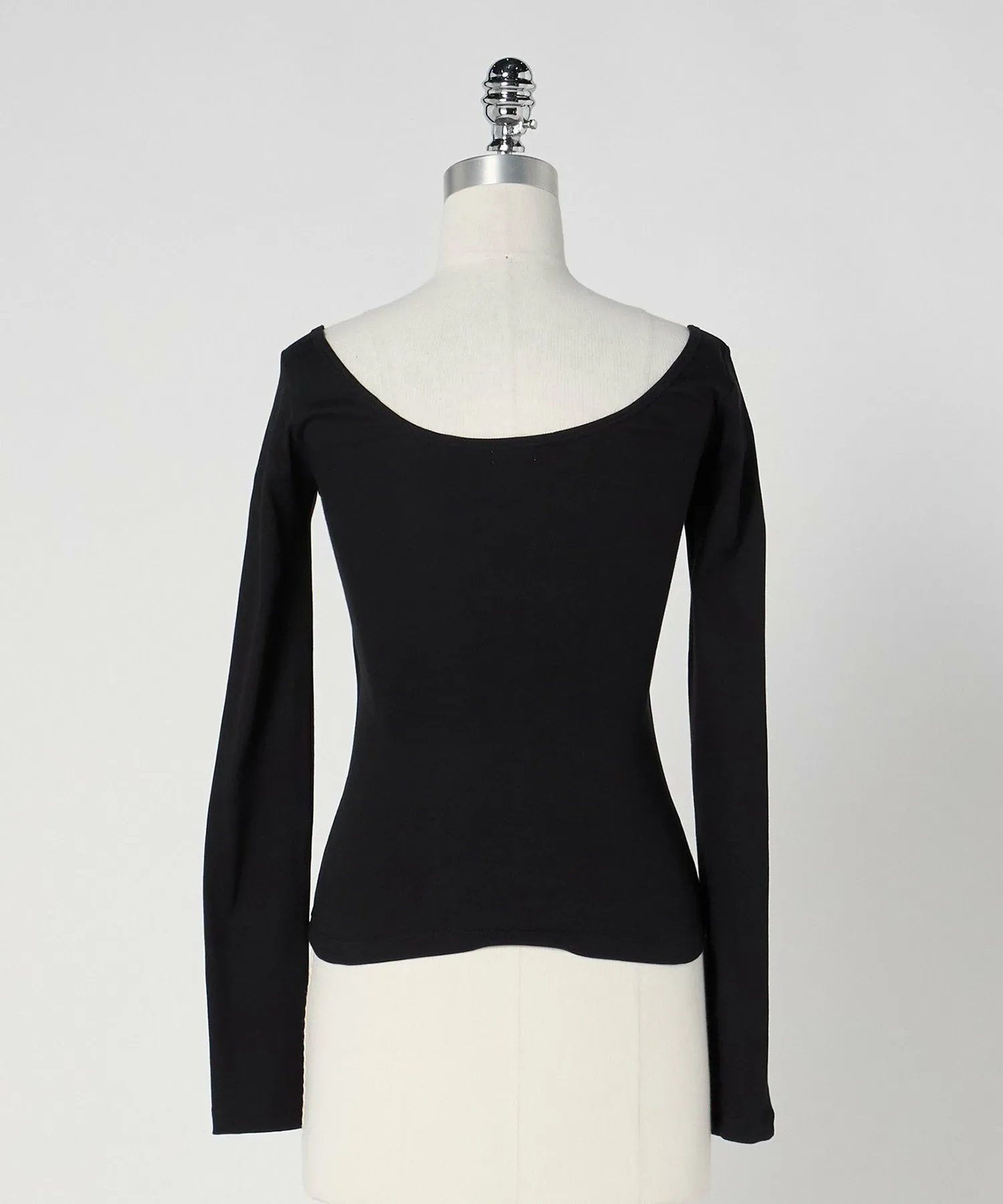 Футболка с длинными рукавами и широким открытым круглым вырезом, который прекрасно подчеркивает линию декольте, а длинные рукава придают ей классический вид.