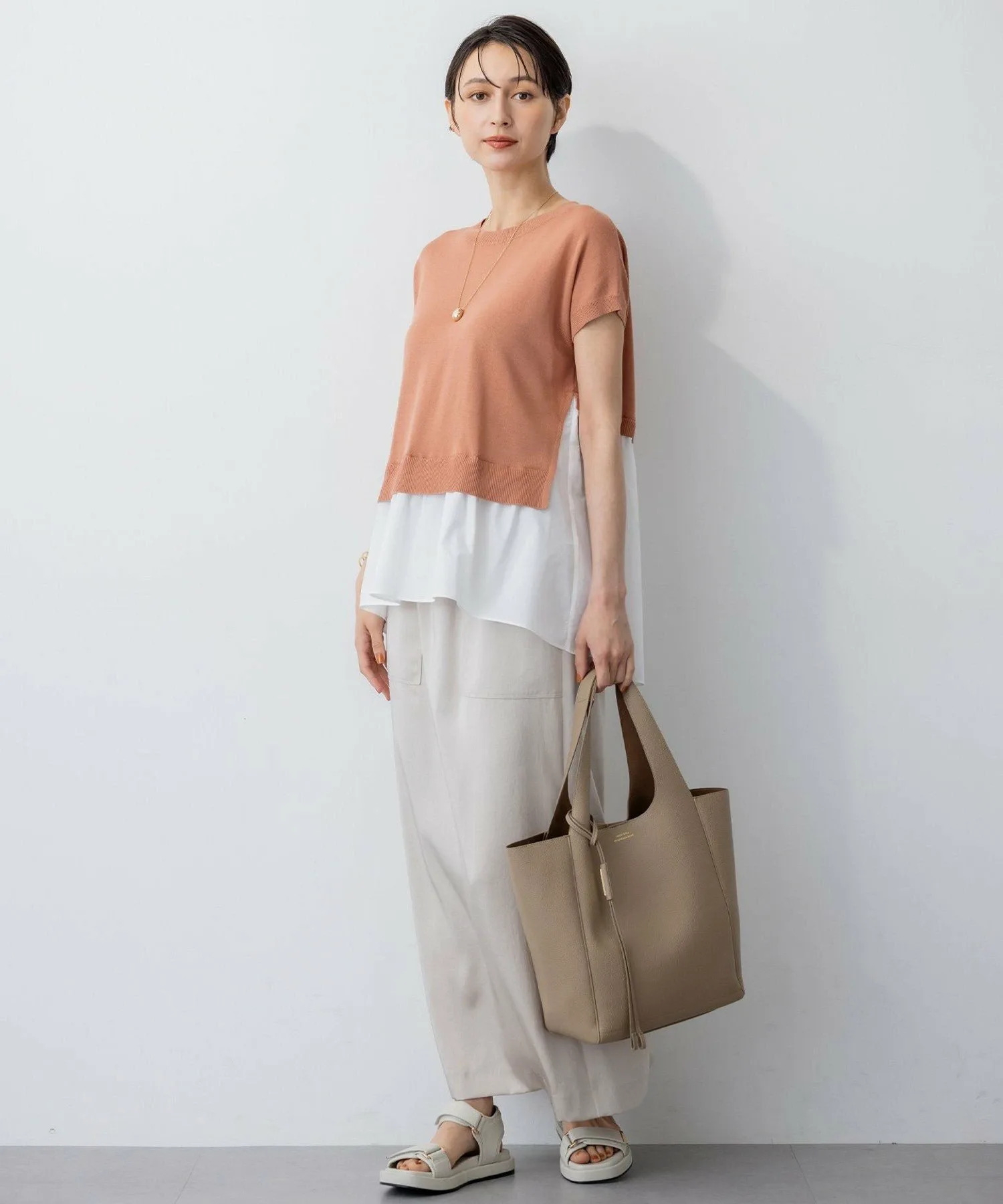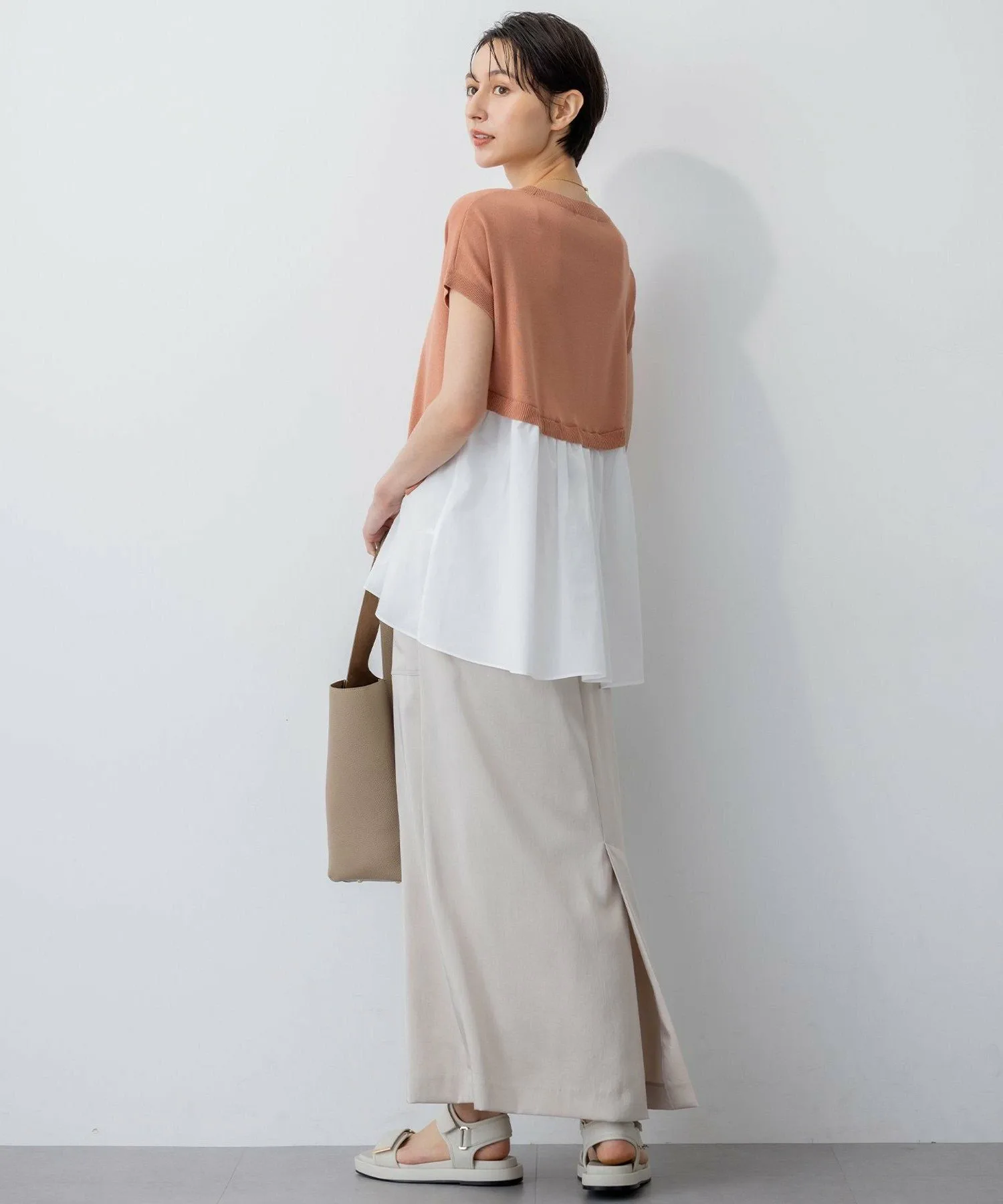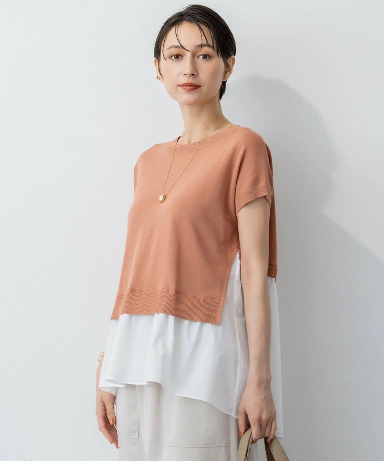Весна-лето 2025 Модный многослойный комбинезон Дизайн: Модный короткий трикотаж с присборенным дизайном, напоминающим рубашку, надетую поверх него. Этот комбинезон дополнит ваш образ, позволяя легко создавать стильные образы в жаркое время года. Контраст между свободным трикотажным лифом и присборенной тканой тканью выглядит привлекательно. Спущенные плечи и рукава ниспадают на плечи, а разная длина спереди и сзади создает изысканный, но в то же время повседневный образ. Доступен в трех цветах: ярко-абрикосовый и кремовый (#022), свободный коричневый и полосатый (#035) и приглушенный темно-синий и синий (#075). Материал: Легкий, освежающий ацетат и хлопок обработаны тканым покрытием для создания гладкого трикотажа, похожего на лен, в сочетании с мягкой, немнущейся тканой тканью. Умеренный блеск и ощущение прохлады обеспечивают изысканную, но комфортную посадку даже в жаркую погоду. *Изображение является образцом, поэтому характеристики могут отличаться от фактического продукта. Модель: H168 B77 W57 H85