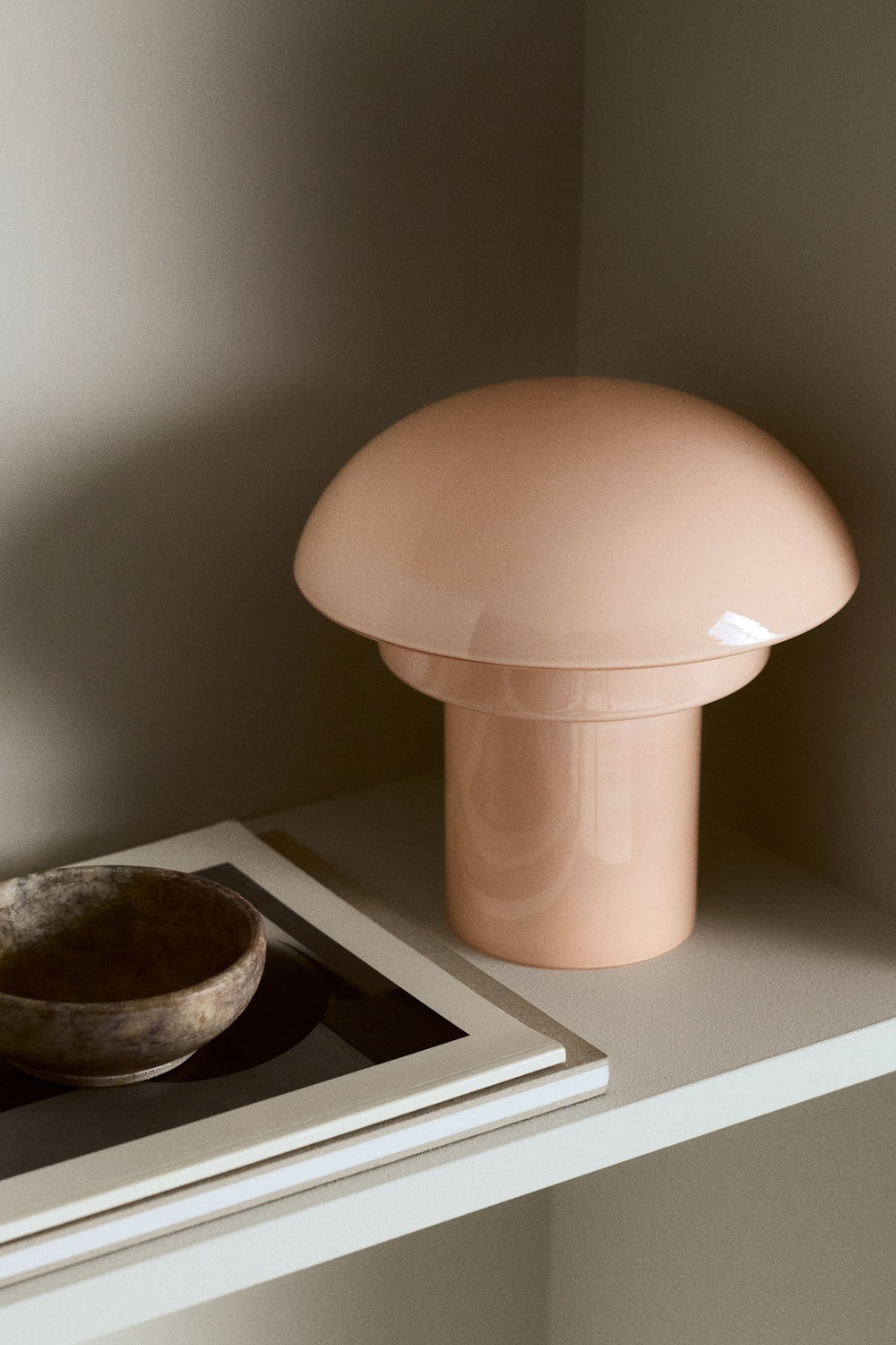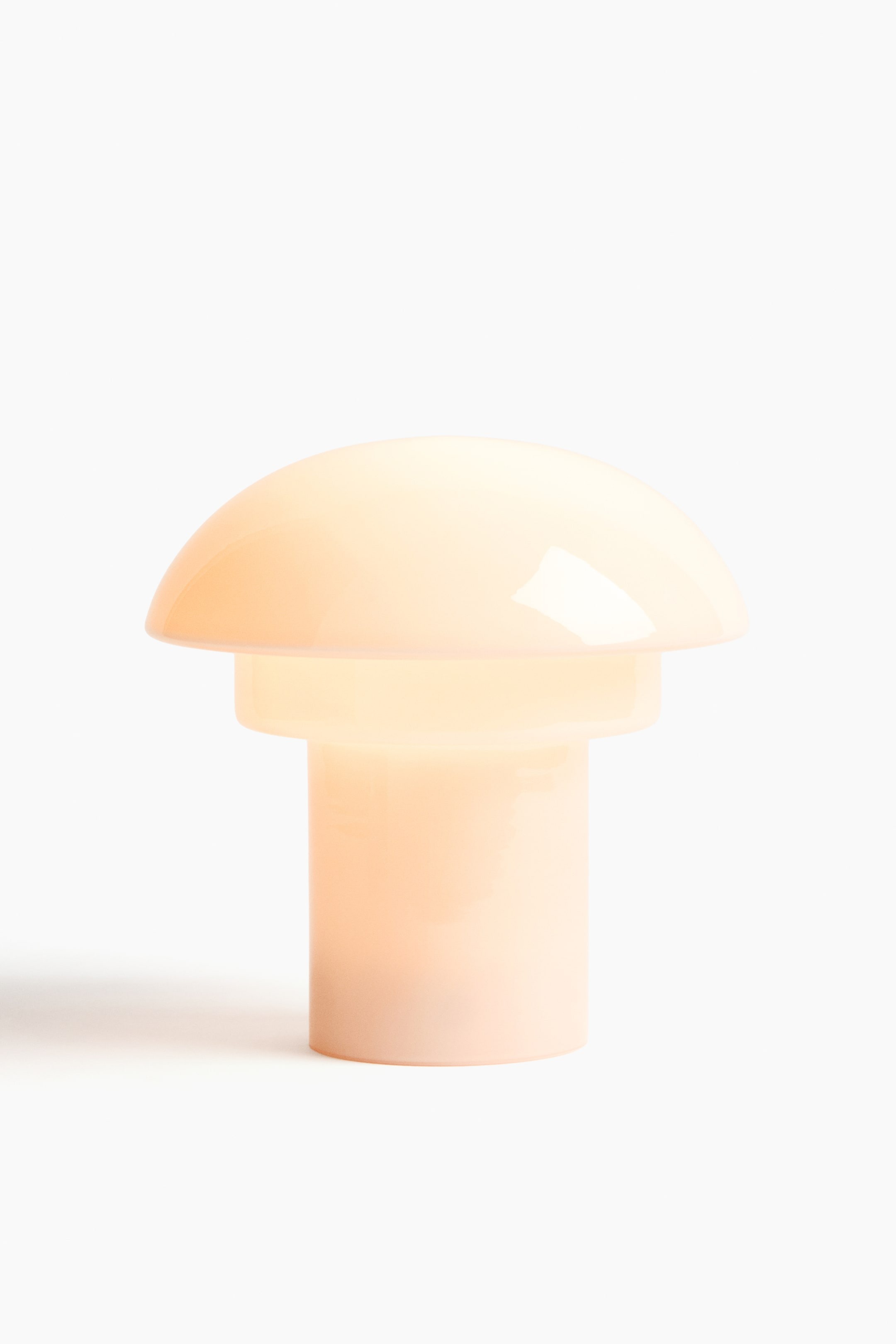 Перезаряжаемая настольная лампа с металлическим основанием и куполообразным тонированным стеклянным плафоном, скрывающим конструкцию.